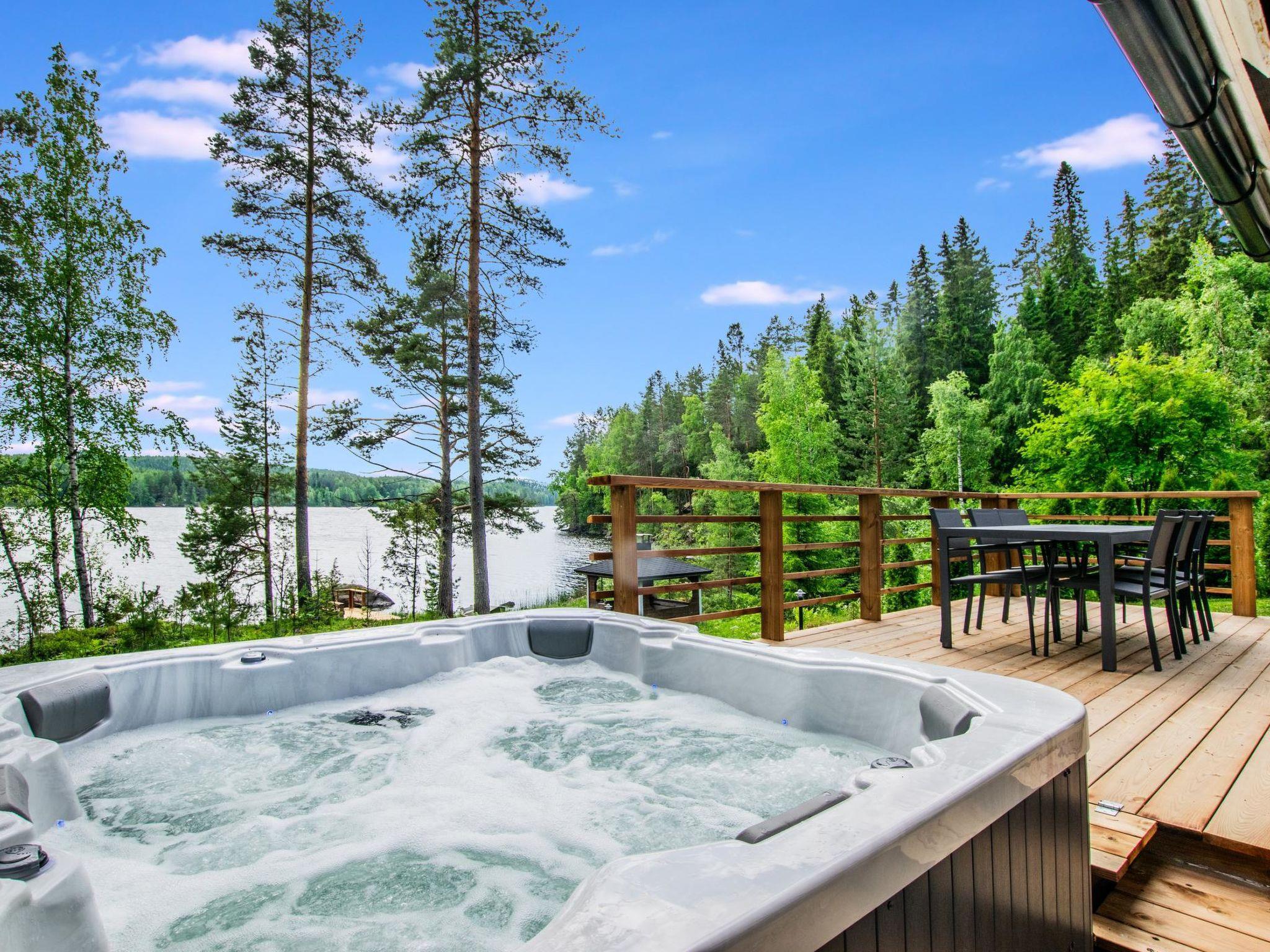 A spacious terrace with a smaller covered part and an open space with high-quality garden furniture and a whirlpool and a gas grill. There is a separate barbecue hut with a fireplace on the shore.