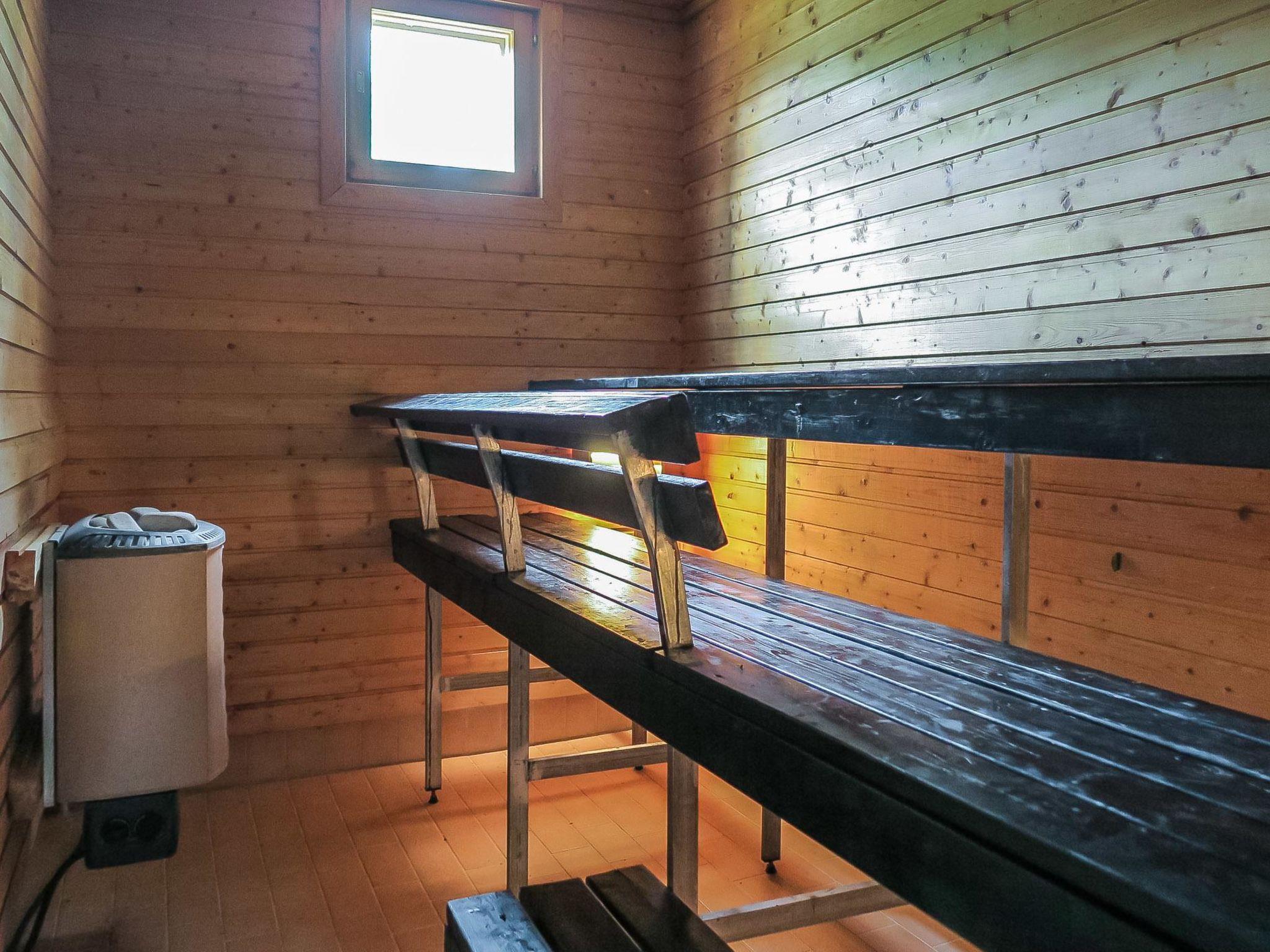 Entrance to sauna via covered porch. Fireplace, baking oven, air source heat pump and video projector with screen in the living room/kitchen.