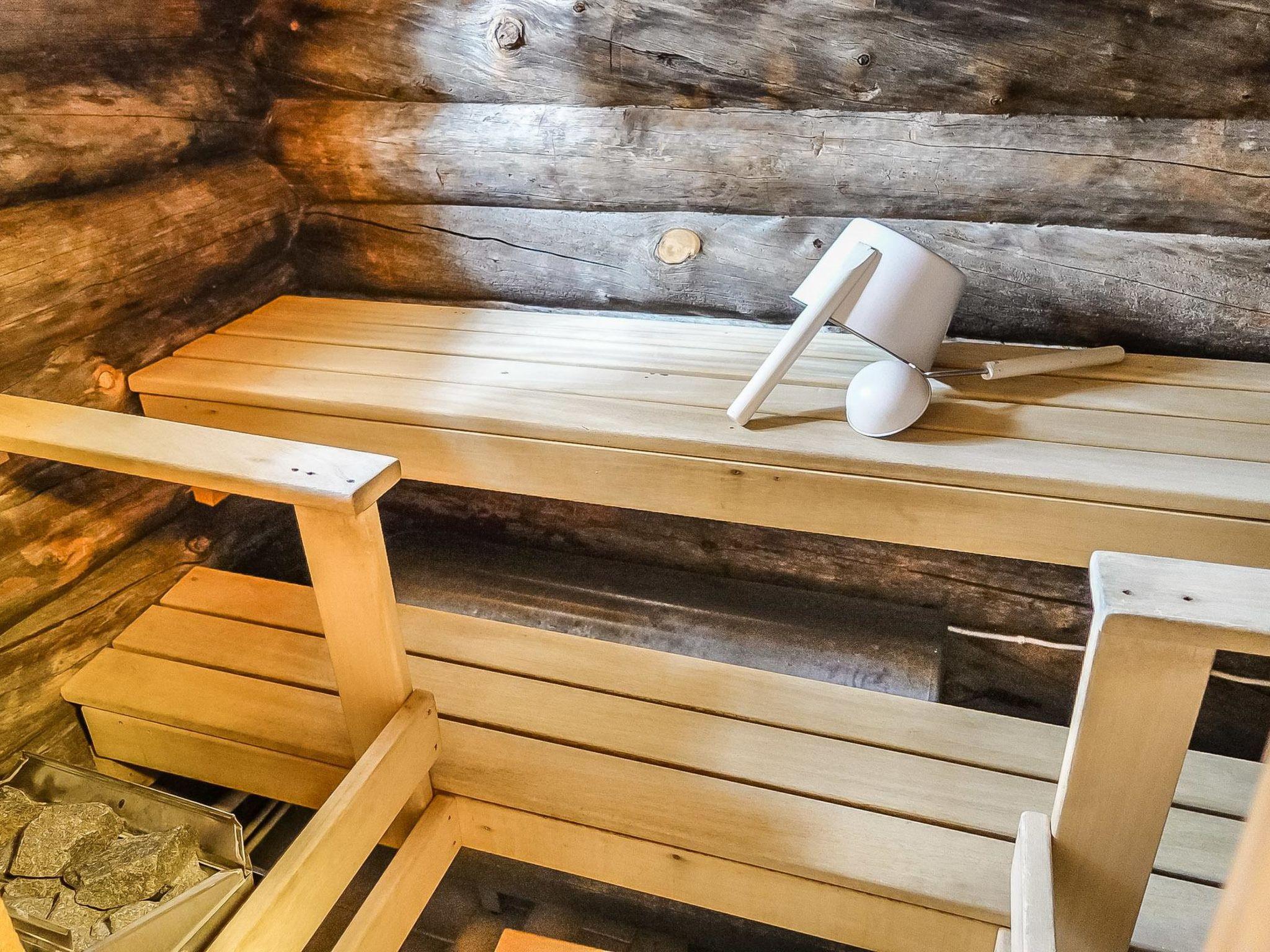 Kelo log cabin, built in 1989. Living room with sofa bed, bedroom with double bed, kitchen (no door), loft with 4 mattresses (loft is shallow and stairs are steep), sauna, washroom/toilet.