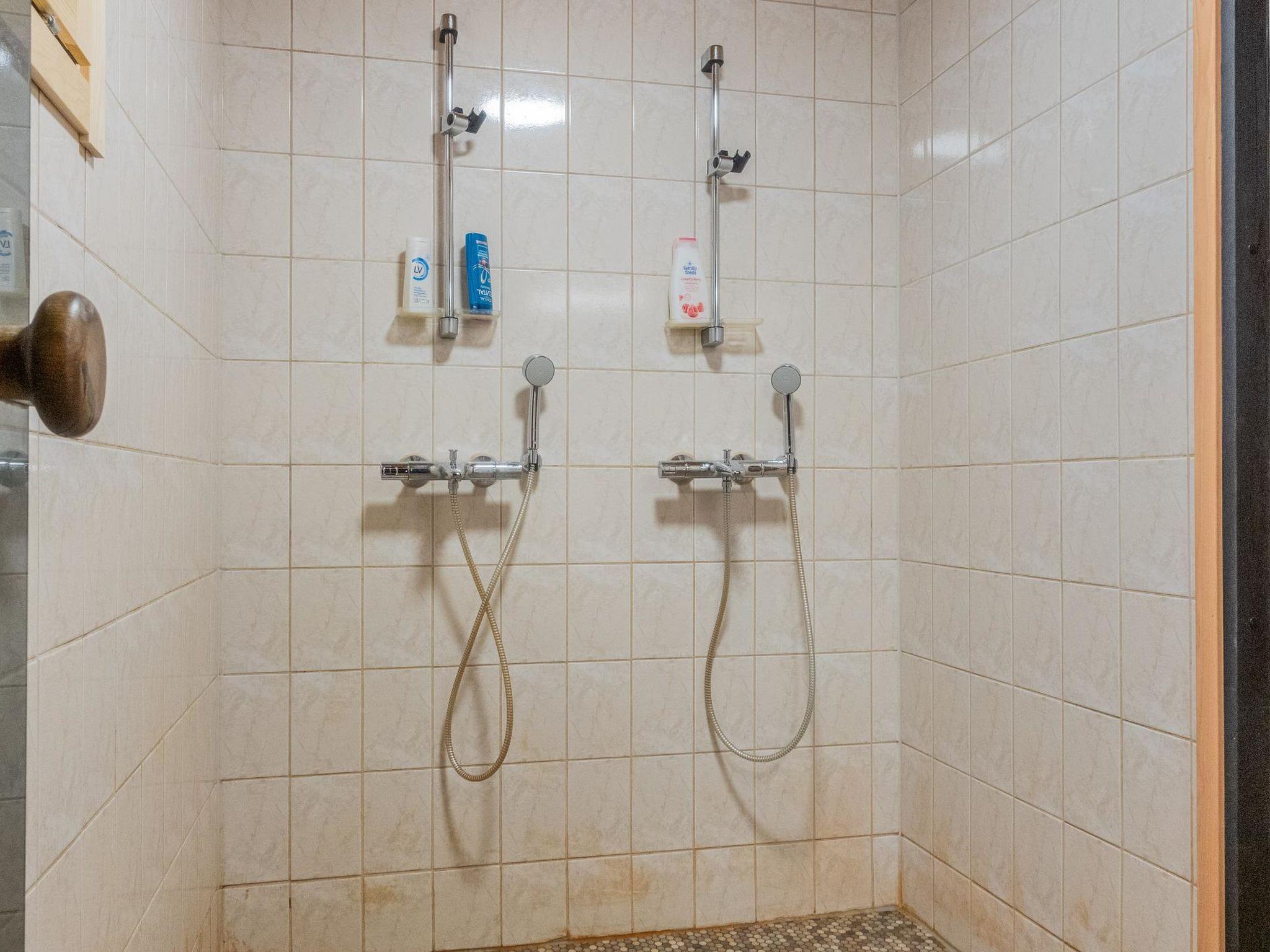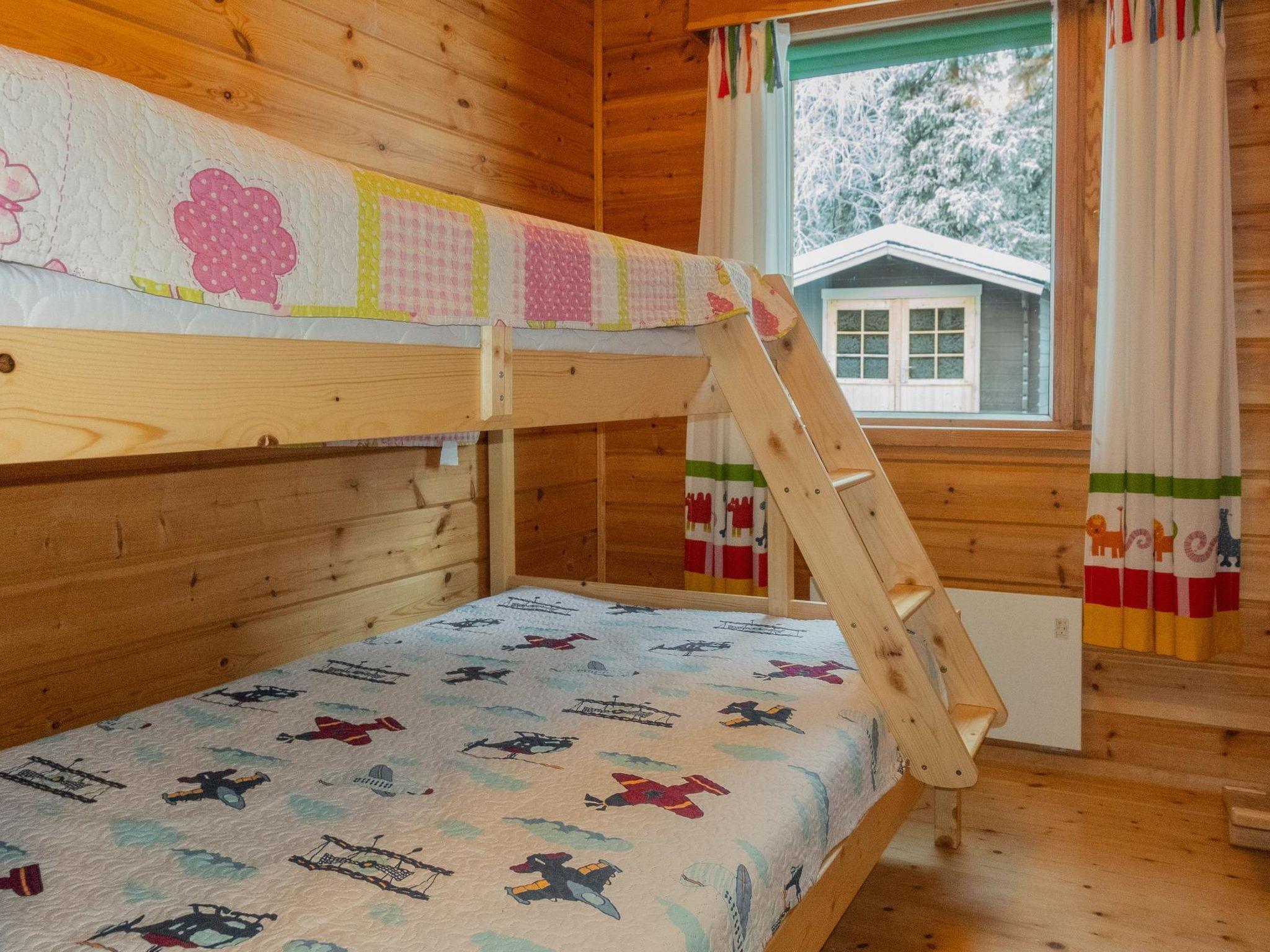 The ground floor comprises a living room and kitchen, creating a cozy environment for togetherness. There are also two bedrooms on the ground floor: one with a double bed and the other with a bunk bed, where the lower bed is 120 cm wide. Additionally, the ground floor features a sauna, a bathroom, a utility room/dressing area, and a covered terrace for outdoor enjoyment. There's a walk-in closet attached to one bedroom, and another accessible from the hallway. The cabin has two separate WCs, one downstairs and another upstairs.