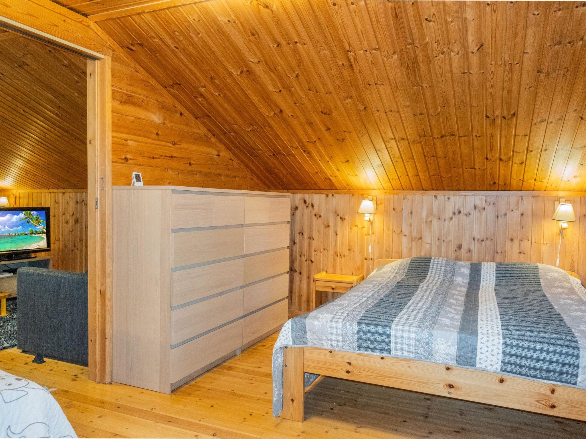 The upper floor offers more sleeping space: a bedroom with a double bed and two single beds. In addition, there's a loft area with a double bed, a TV space with a pull-out sofa bed, and a balcony offering scenic views of the surrounding nature.