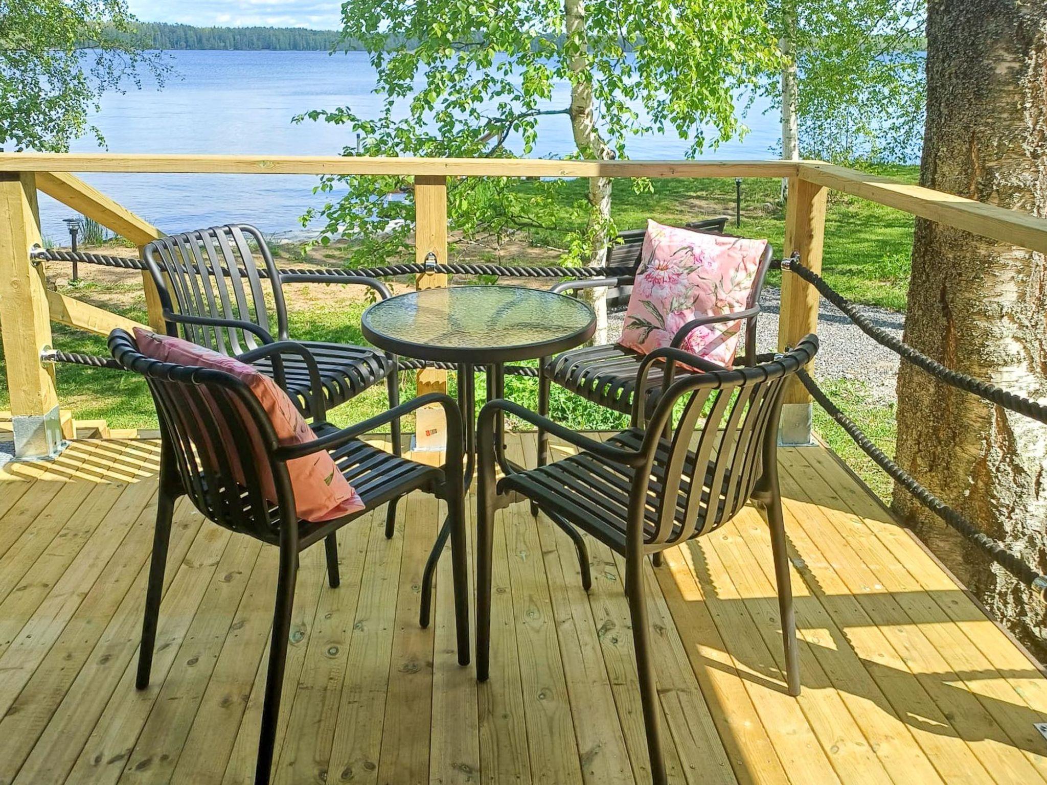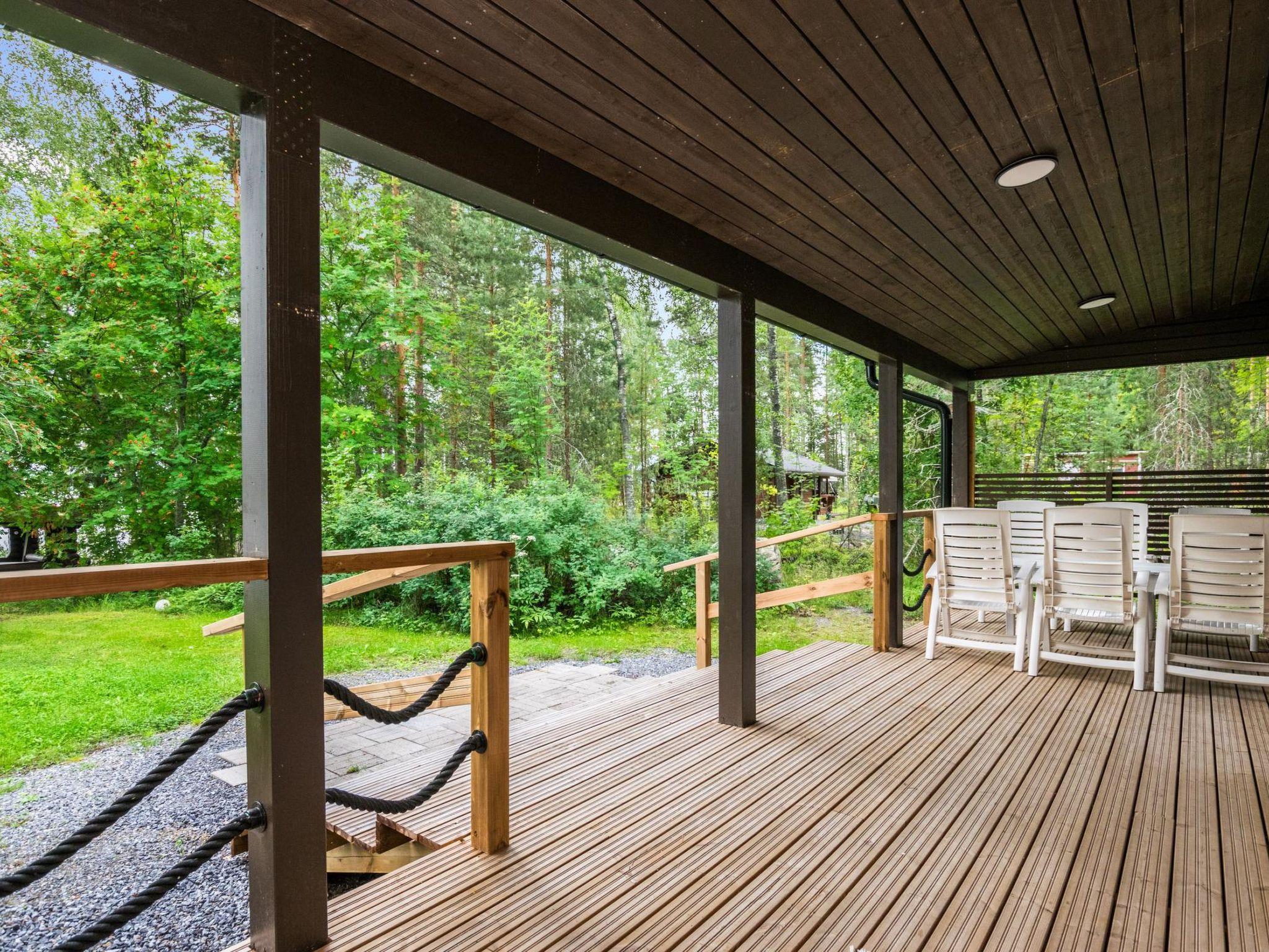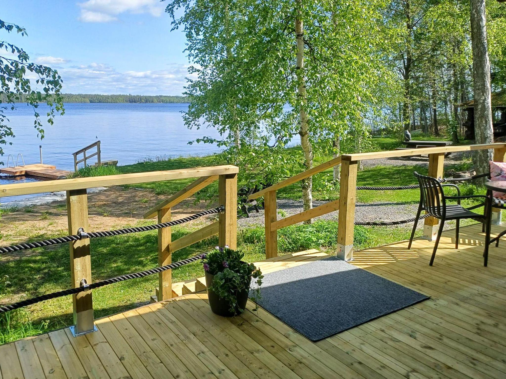 The wooden villa, originally built in 1991, was renovated and expanded in 2024. The living room/kitchen includes a sofa bed for two. One bedroom has a double bed, and the other bedroom has a pull-out sofa bed for two. There is a bathroom with a shower, an electric sauna, and a separate WC. The spacious covered terrace, running the length of the house, faces the lake.