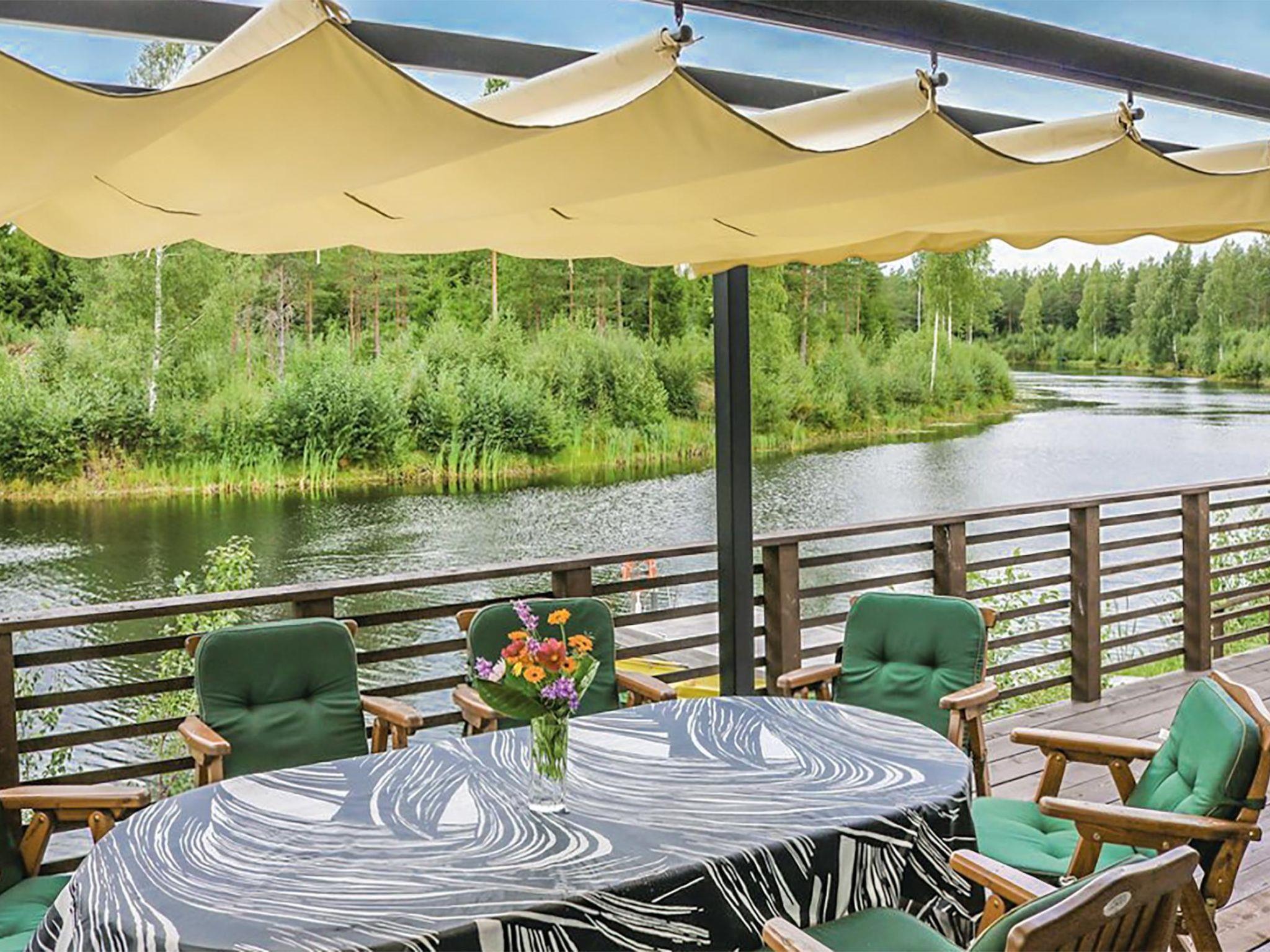 Terrace with table group in front of the cabin, gas grill and hydro massage bath outdoors for 7 persons (incl. price). There is also nice and atmospheric summerhouse with wood burning grill in the yard.
