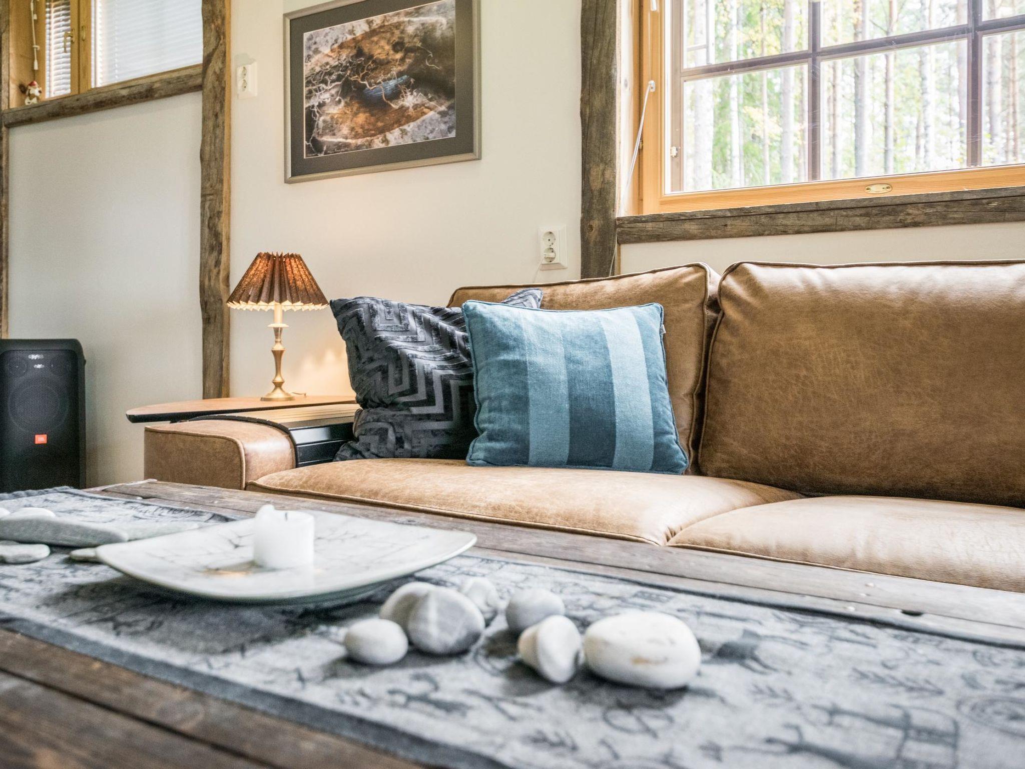 Lakeside sauna with electric heating, fireplace, coffee maker, refrigerator, dining group, two beds (beds available between 1.5. and 30.9), wood-burning sauna stove (carried water).