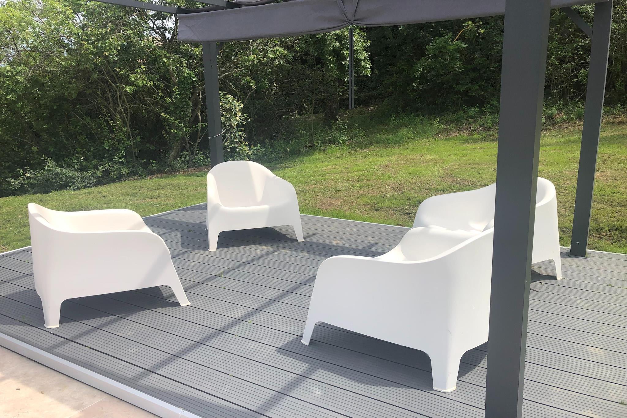 Stueetage: (åbent køkken(komfur(Komfur med fire kogeplader, gas), kaffemaskine(kaffepude), ovn, mikrobølgeovn, opvaskemaskine , køle-fryseskab), stue / spisestue(Fjernsyn(parabol), pejs), soveværelse(dobbeltseng(160 x 200 cm)), soveværelse(dobbeltseng(140 x 190 cm)), badeværelse(bruser(Walk-in-bruser), håndvask), toilet, åbent rum(køjeseng)) vaskerum (vaskemaskine), carport, terrasse(privat), have(privat, indhegnet, > 1000 m2), havemøbler, grill, swimmingpool(privat, opvarmes, vand alarm, 9 x 5 m., opened from Apr upto and including Sep), legeredskaber, barneseng, barnestol