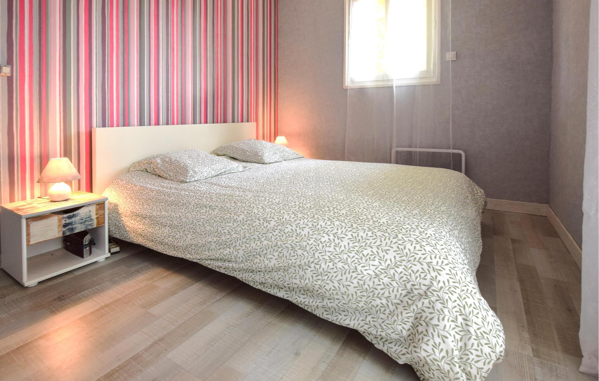 Jeres feriehus er lyst møbleret og udstråler en hyggelig, familiær atmosfære. Opholdsstuen i jeres feriehus med sofa, lænestole og tv giver mulighed for at afslutte aftenen i hyggeligt selskab. Brug den tilstødende spiseplads med et stort bord til fælles måltider, og lav mad i det praktisk indrettede køkken.
