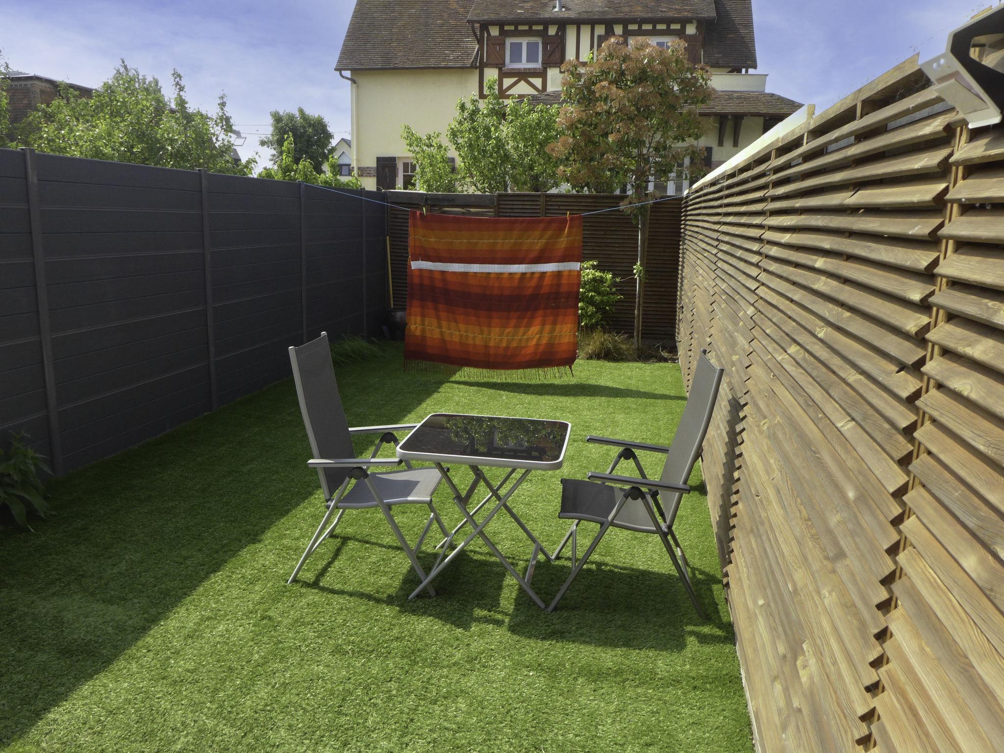 Terraced house "Les Étourneaux". In the resort 200 m from the centre of Cabourg, in a quiet position, 950 m from the sea, 950 m from the beach. Private: garden 60 m2 (fenced). Garden furniture, public parking on the road. Shop, grocery, supermarket 200 m, restaurant, bar 400 m, bakery 200 m, café 400 m, bus stop "Hôtel de Ville" 210 m, sandy beach 950 m, thermal baths "Thalassothérapie" 1.8 km. Sports harbour 1.8 km, golf course (9 hole) 1.9 km, minigolf 950 m.