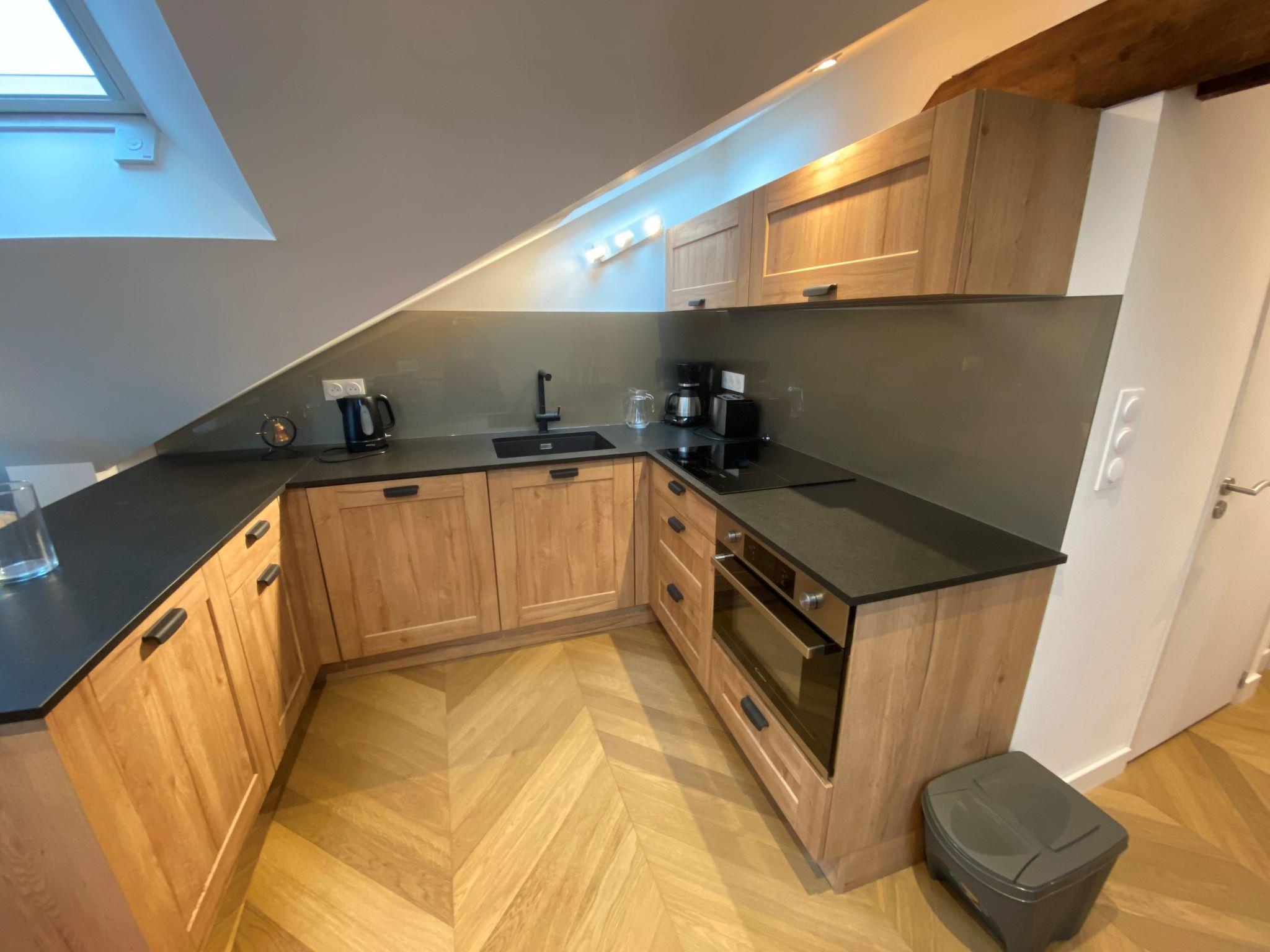 "Le point du jour 2", 2-room penthouse 40 m2 on 2nd floor. Comfortable and modern furnishings: large living/dining room, ceiling height 160 - 175 cm with 1 sofabed (90 cm, length 190 cm), TV (flat screen). 1 large room with 1 french bed (1 x 140 cm, length 190 cm). Open kitchen (dishwasher, 3 induction hot plates, toaster, kettle, freezer, electric coffee machine, combination microwave). Bathroom, sep. WC. Electric heating. Parquet floors. Very beautiful view of the sea. Facilities: hair dryer. Internet (WiFi, free). Please note: non-smoking house. Smoke alarm.