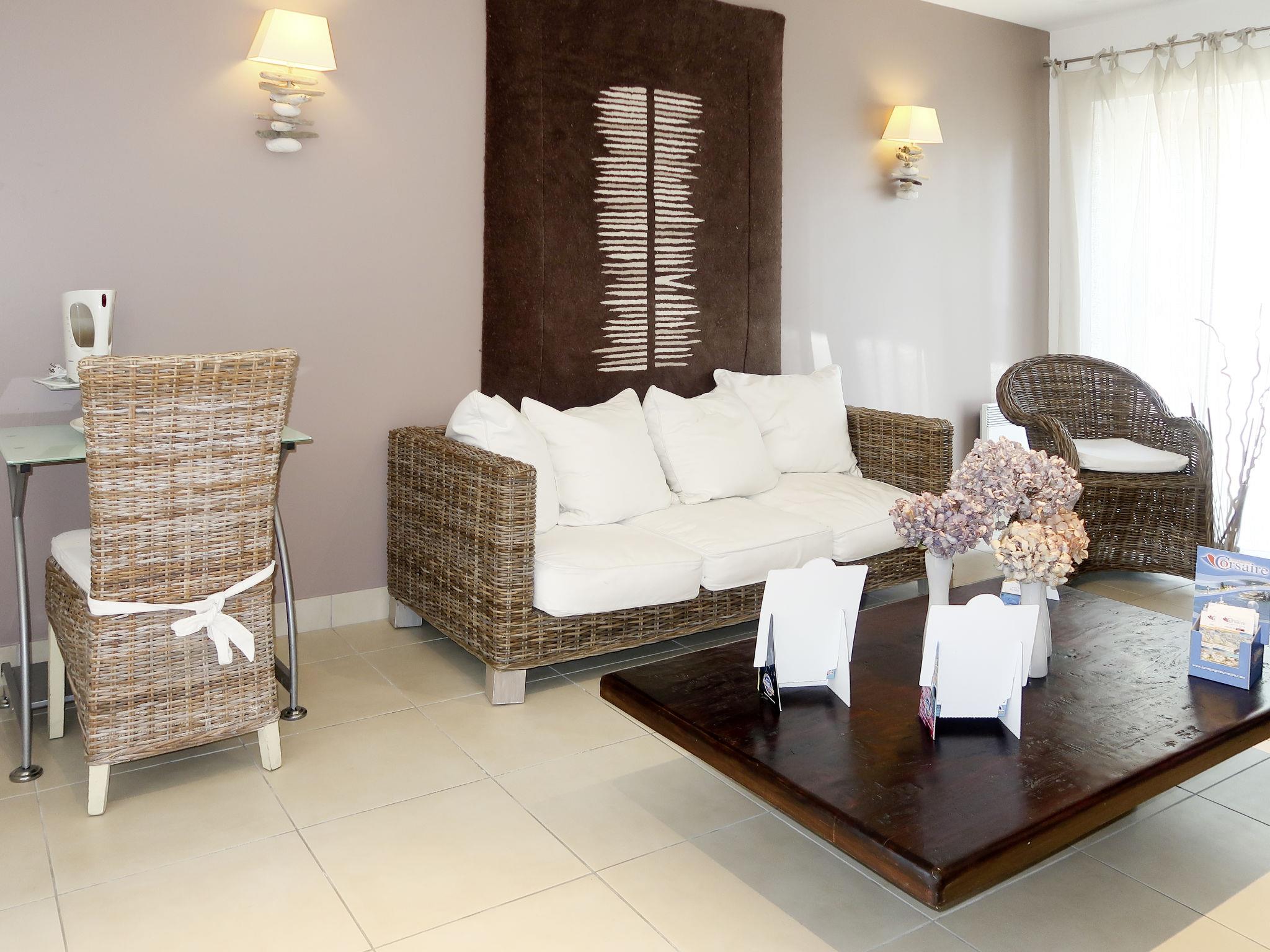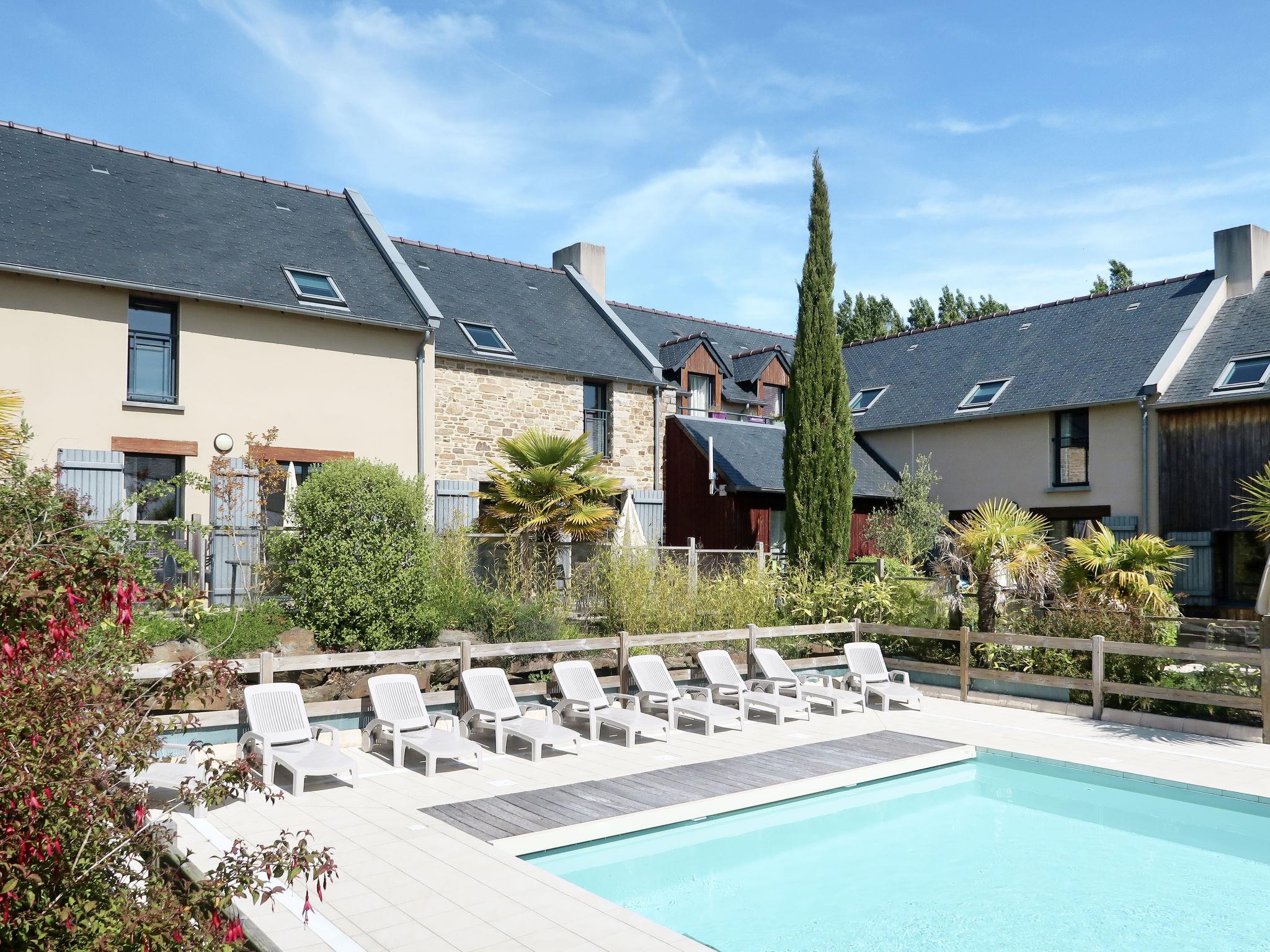 Cosy resort "Les Hauts de la Houle", 2 storeys. 50 apartments in the residence. Above Baie du Mont-Saint-Michel 600 m from the centre of Cancale, 22 km from the centre of Saint-Malo, in an elevated position, 700 m from the sea. For shared use: property, well-kept garden with lawn and plants, swimming pool heated (15 x 6 m, depth 145 cm, seasonal availability: 01.Jan. - 31.Dec. pool opening hours: 09:30-19:45). Hot tub, terrace. In the complex: sauna (extra). Storage room for bicycles, washing machine (for shared use, extra). Grocery 600 m, bus stop "Cancale Eglise" 700 m, railway station "Saint-Malo" 22 km, sandy beach 4 km. Please note: the photograph shows a typical example. The holiday properties may differ in living space, floorplan, equipment and furnishing.