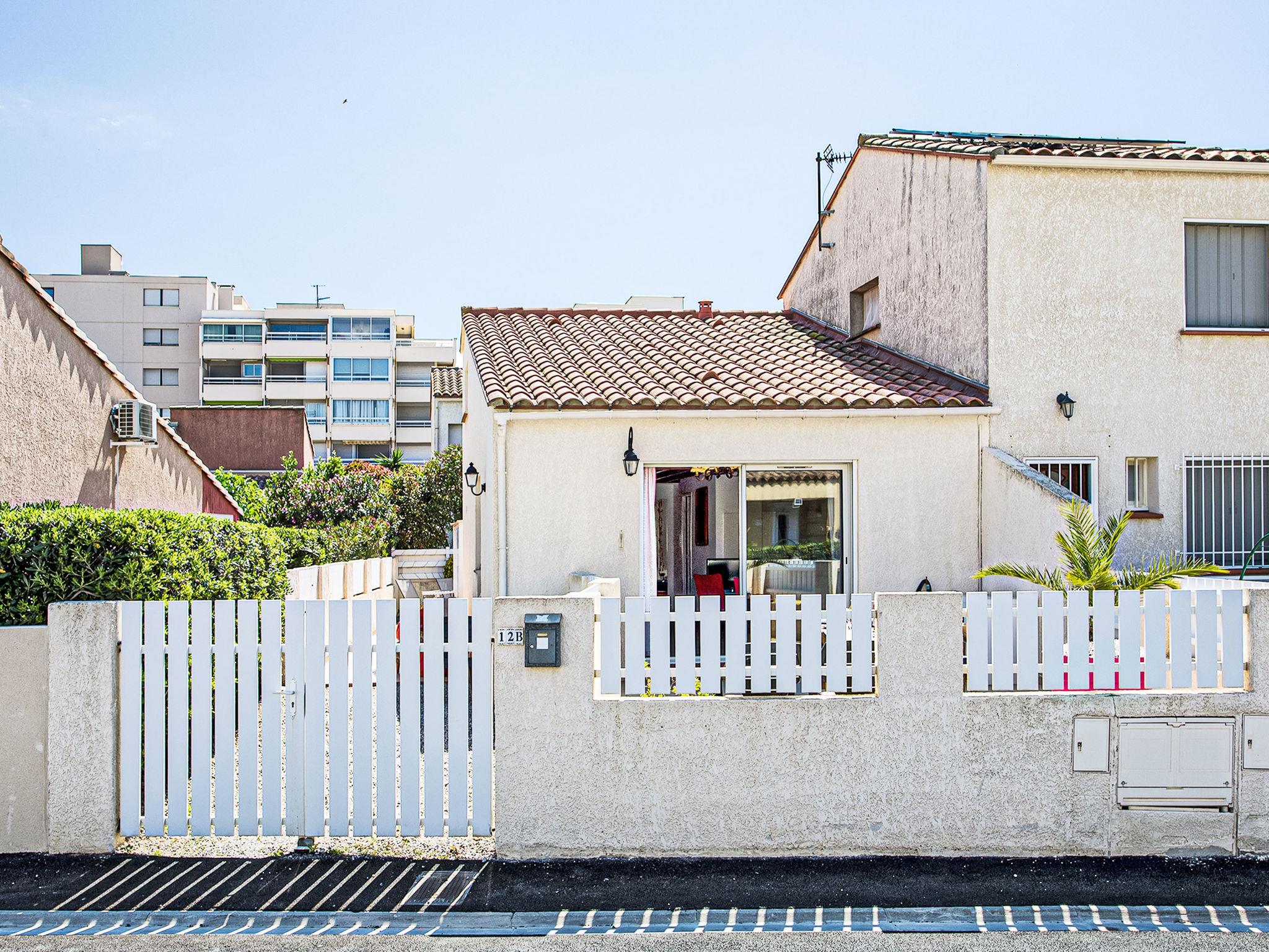 Canet Plage: Terraced house "Villa 12 Cassin", 2 storeys. In the district of Canet sud, in a quiet position in the residential district, 100 m from the sea, 100 m from the beach. Shop, grocery, supermarket 300 m, shopping centre 8 km, restaurant, bar, bakery 300 m, bus stop 150 m, sandy beach 100 m, park "Aqualand St Cyprien" 10 km, diving center 18 km, outdoor swimming pool 3 km, indoor swimming pool 3 km, lake Etang de Canet 1 km. Sports harbour 5 km, golf course (18 hole) 8 km, sailing school 5 km, minigolf 3 km. Nearby attractions: Perpignan 12 km, Collioure 25 km, Banyuls 37 km, Espagne 35 km, Andorre 180 km, Barcelone 200 km. Well-known lakes can easily be reached: Lac de Villeneuve de La Raho 19 km, Lac de St Jean Pla de Corts 39 km, Gorges du Gouleyrous 42 km. Hiking paths: Abbaye de St Martin du Canigou 70 km, Pic du Canigou 77 km, Lac des Bouillouses 105 km.