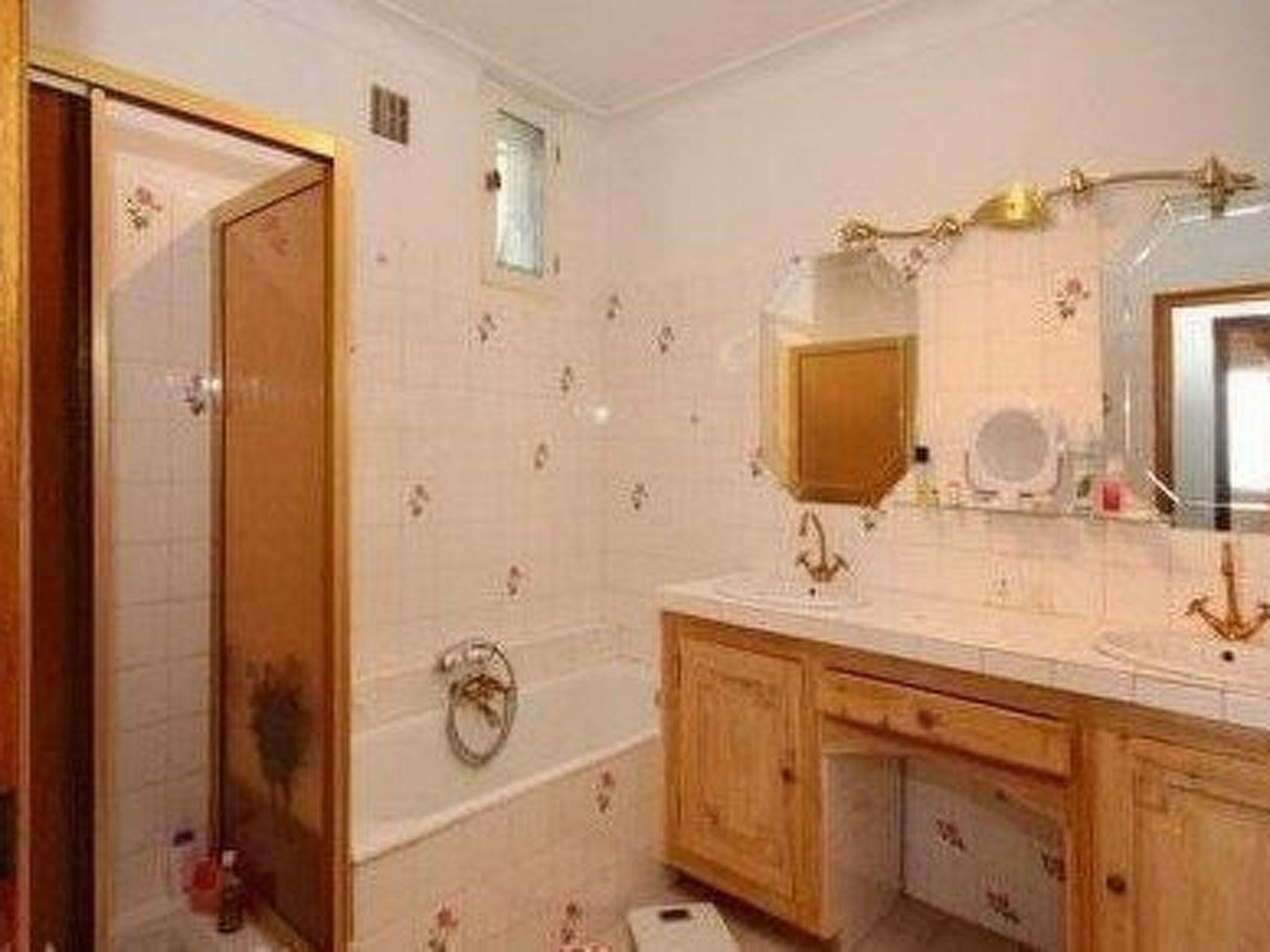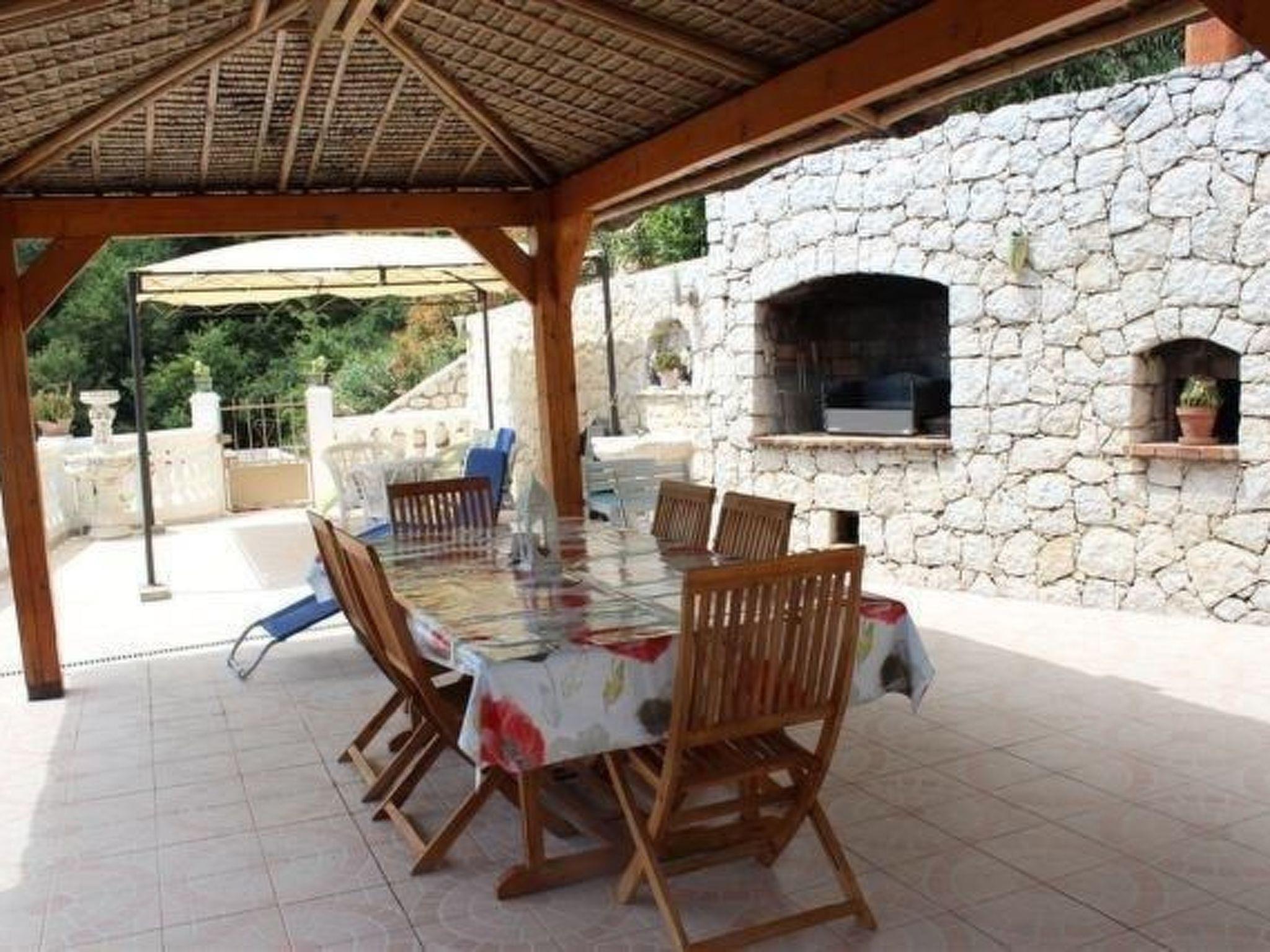The 80 m² terrace, enclosed and protected from the sun, communicates with the living room. Here you can enjoy absolute peace and quiet. Parents can relax while the children play. The terrace has an arbour (5 x 3 m) and a pergola (3.5 x 3.5 m), a barbecue, a wall-mounted pizza oven, garden furniture, a table and chairs and sun loungers. This means you can spend plenty of time outside enjoying the barbecue, eating, relaxing and lounging. From the terrace, you can access your own private swimming pool (8 x 4 m, 1 m to 1.70 m deep), filled with chlorine-treated water and situated just below. Thanks to its sunny location, it's already a pleasant temperature early on. The 200 m² paved area around the pool is furnished with six sun loungers, two parasols and a solar shower. It enjoys all-day sunshine and magnificent sea views. Enjoy the peace and quiet as you listen to the birds and cicadas. For those who like to be a little more active, a table tennis table and table football are available. The property has an automatic entrance gate, automatic lighting and two parking spaces.