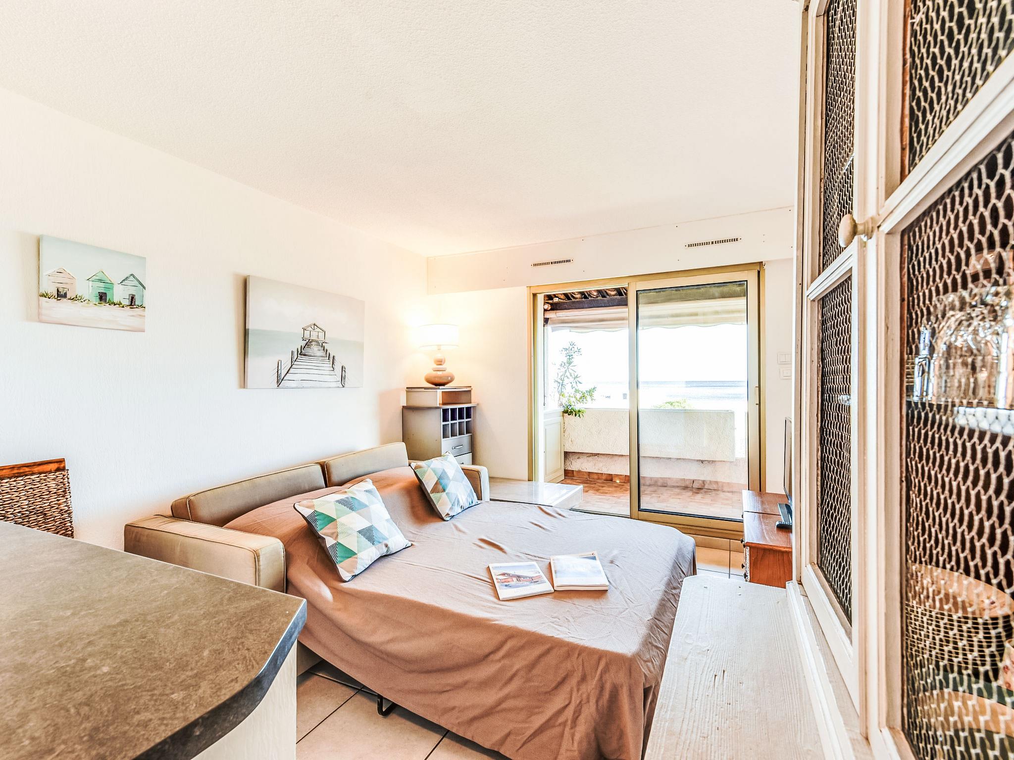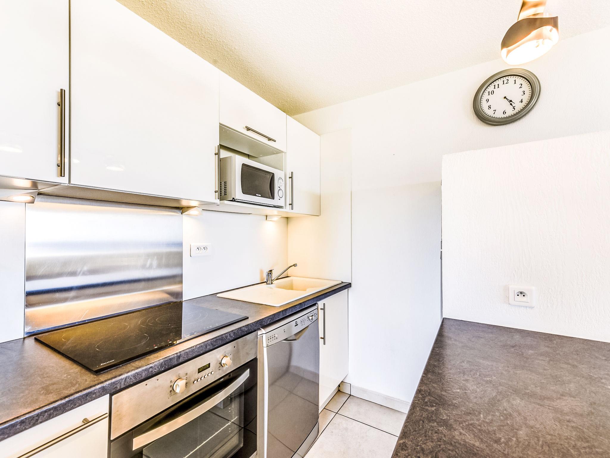 3-room apartment 35 m2 on 1st floor, south facing position. Practical and comfortable furnishings: living/dining room with panoramic window with 1 double sofabed (1 x 140 cm, length 190 cm), TV (flat screen), air conditioning and electric shutters. Exit to the terrace. 1 room with panoramic window with 1 french bed (1 x 140 cm, length 190 cm), electric heater. Exit to the terrace. 1 room with 1 x 2 bunk beds (80 cm, length 190 cm), electric heater. Open kitchen (oven, dishwasher, 3 ceramic glass hob hotplates, toaster, kettle, microwave, freezer, electric coffee machine). Shower, sep. WC. Electric heating, boiler (100 litres). Terrace 11 m2, south facing position. Terrace furniture, deck chairs (2). Beautiful view of the sea. Facilities: washing machine. Internet (WiFi, extra). Parking space n 15 (fenced). Please note: TV only FR. Smoke alarm.