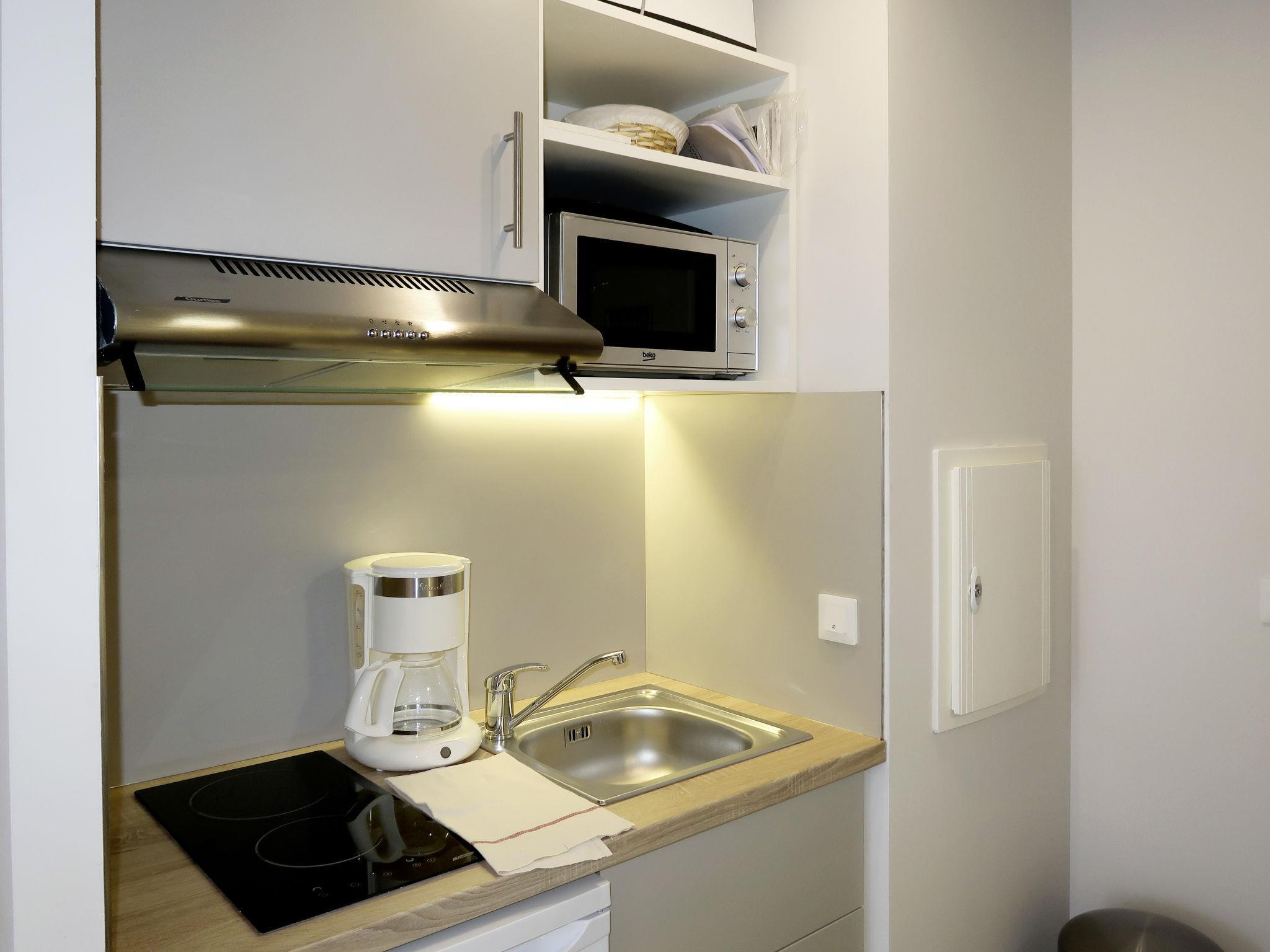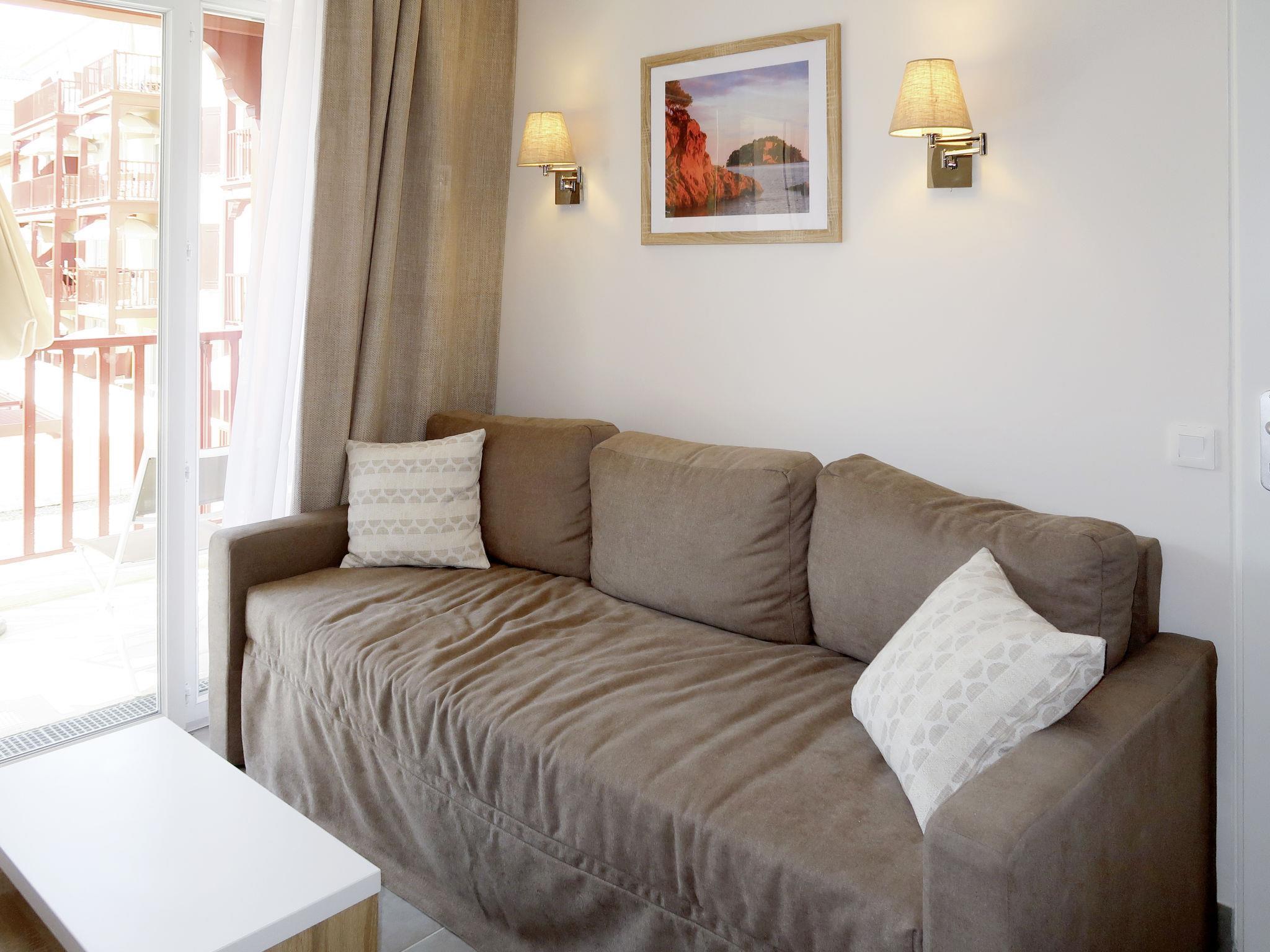 "Résidence Odalys Collection Les Canisson", 2-room apartment 28 m2. Bright, modern furnishings: living/sleeping room with 1 double sofabed, dining table and satellite TV. Exit to the balcony. 1 room with 2 sleeping facilities (80 cm, length 190 cm). Kitchenette (dishwasher, 2 ceramic glass hob hotplates, toaster, kettle, electric coffee machine, combination microwave). Shower/WC. Electric heating, air-conditioning. Small balcony. Balcony furniture. Facilities: children's high chair, baby cot (extra). Internet (WiFi, free). Please note: non-smokers only. Maximum 1 pet/ dog allowed. Smoke alarm.