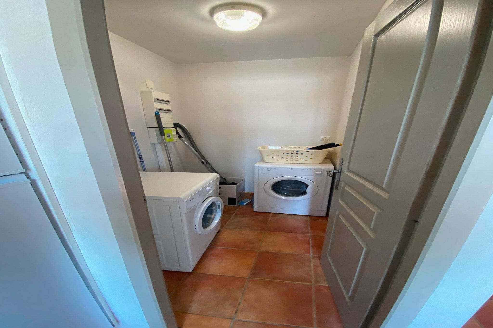 Stueetage: (åbent køkken(komfur(Komfur med fire kogeplader, elektrisk), kaffemaskine, ovn, grill, mikrobølgeovn, opvaskemaskine , køleskab(+ fryser), Blender), stue / spisestue(Fjernsyn(parabol), spisebord(8 personer), pejs, DVD-afspiller), soveværelse(2x enkeltseng), soveværelse(2x enkeltseng), soveværelse(dobbeltseng), soveværelse(dobbeltseng), badeværelse(badekar eller bruser), badeværelse(badekar eller bruser), toilet, toilet, bryggers(tørretumbler, vaskemaskine), varme(elektrisk), klimaanlæg) terrasse(overdækket, 70 m2), have(privat, delvist indhegnet, 760 m2), havemøbler, grill, parkering, swimmingpool(privat, 8 x 4 m.), tennisbane(deles med andre gæster, betalt), cykler til rådighed