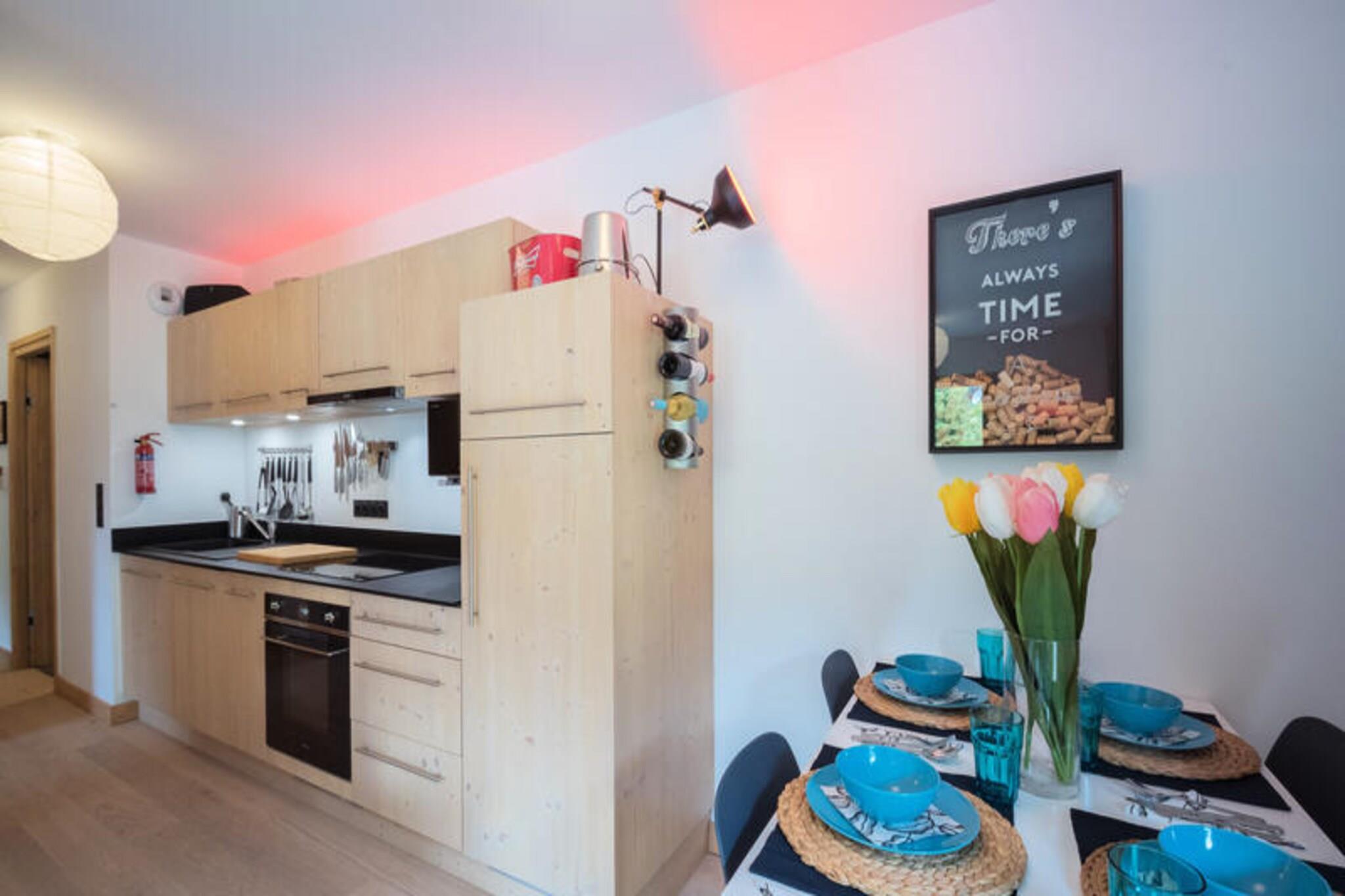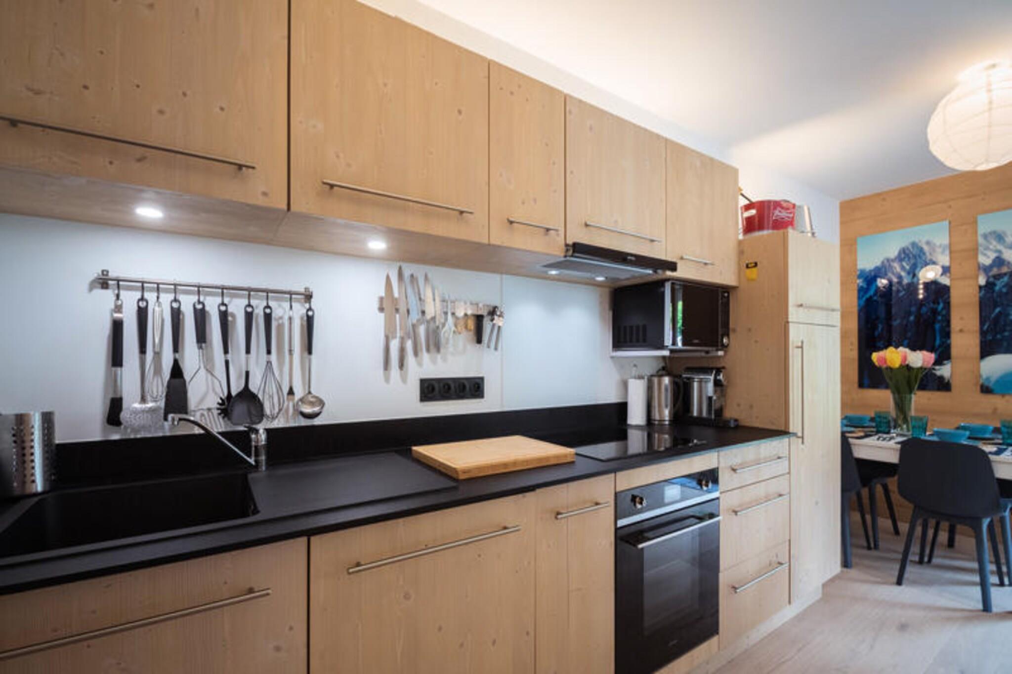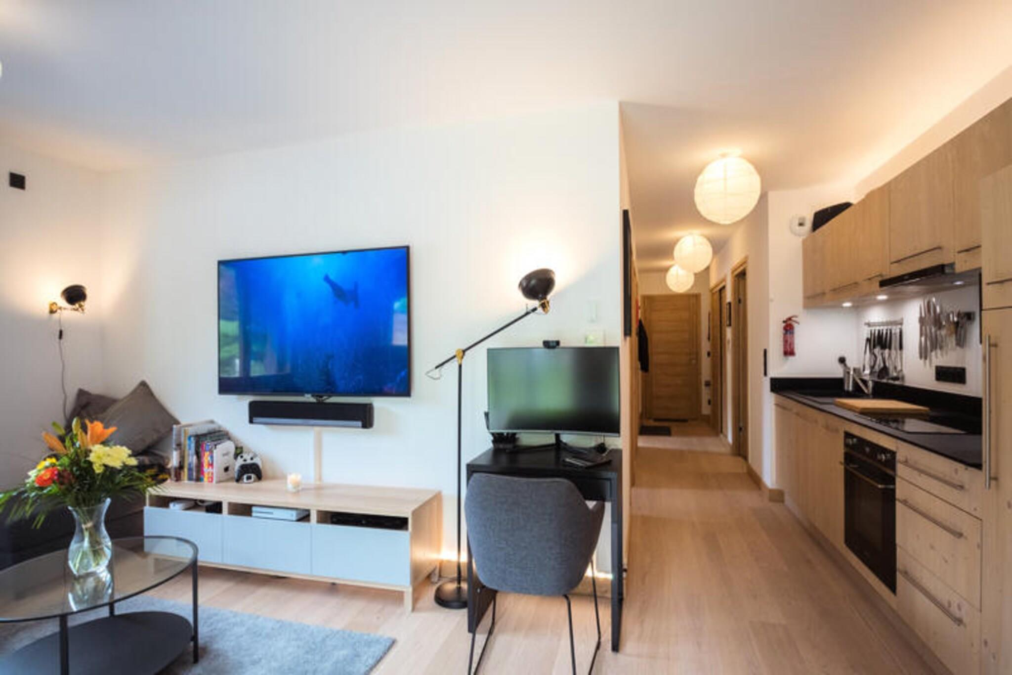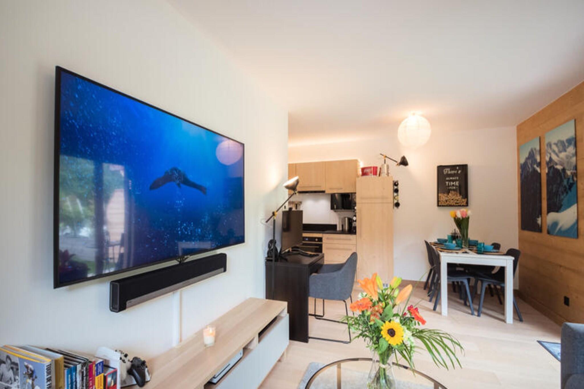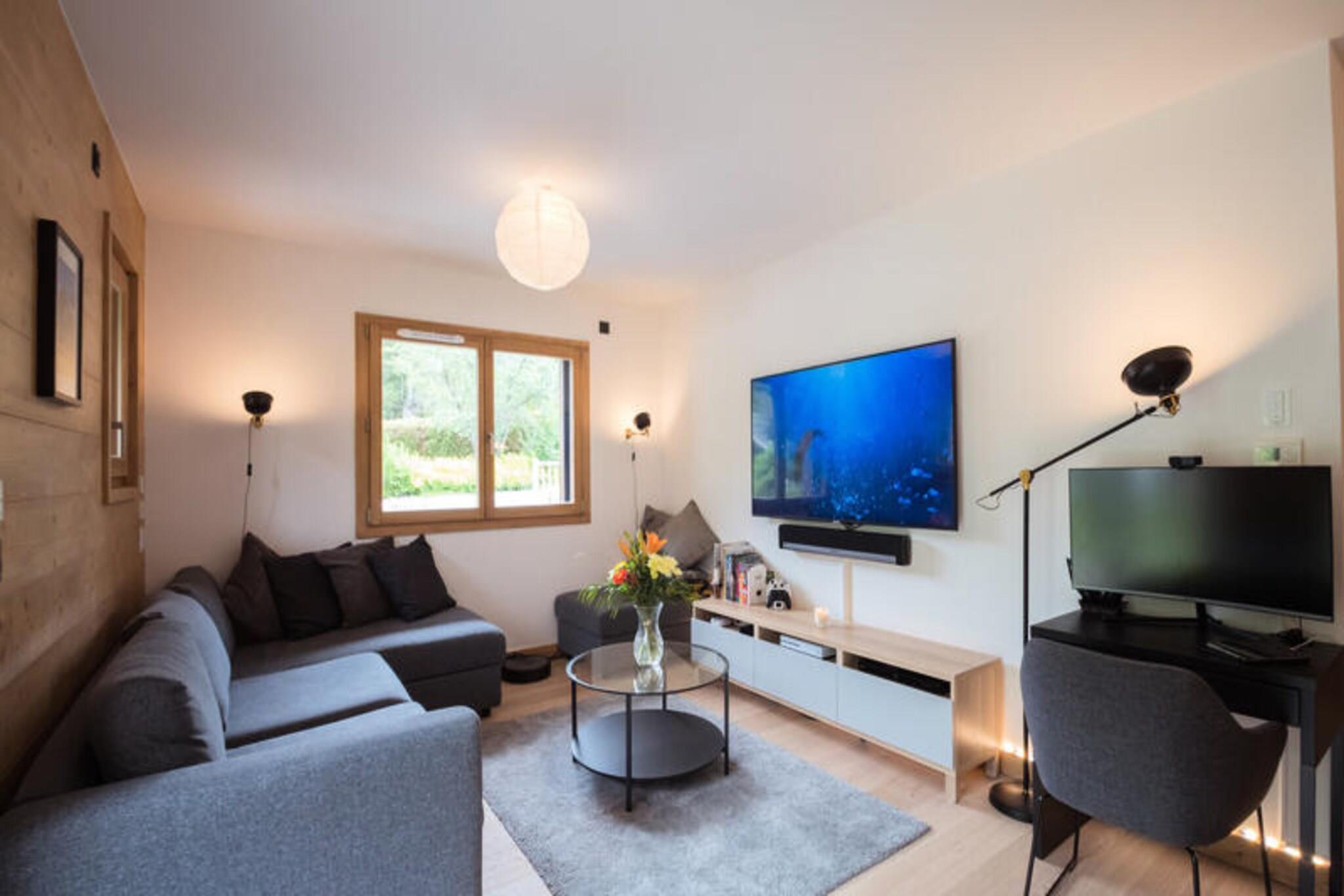 Denne smukke 58m² lejlighed, klassificeret 4 stjerner, er ideel til 4 personer og er beliggende i stueetagen af ??den nye "Le Green" bolig i Les Praz de Chamonix. Stuen har spiseplads og opholdsstue med Apple TV, Netflix og adgang til hjemmebiograf. Det åbne, fuldt udstyrede køkken omfatter køleskab, fryser, opvaskemaskine, induktionskomfur, ovn, mikroovn og apparater såsom et raclette- og fonduesæt, Nespresso-maskine, brødrister, elkedel og riskoger. Lejligheden tilbyder også et soveværelse med dobbeltseng en suite med brusebad, toilet og pengeskab. Gæsterne vil nyde nærheden til udendørs aktiviteter, med Flégère-svævebanen kun 350 meter væk, perfekt til skiløb. Busstoppestedet (Les Praz - Flégère) ligger kun 120 meter fra lejligheden, og SNCF-stationen ligger 210 meter væk. For dem, der ønsker at udforske yderligere, ligger Chamonix busstation 4,2 km derfra. Lejligheden ligger tæt på lokale caféer og butikker i Les Praz, hvilket giver nem adgang til alt hvad du har brug for. Ud over lejlighedens faciliteter kan du slappe af på den 15m² store terrasse udstyret med havemøbler og en 50m² privat have. Til ejendommen hører også et skirum med støvletørrer, en lukket garage med en højde på 2,15 meter og WiFi. Lejligheden er ikke-ryger, og kæledyr er ikke tilladt. Slutrengøring (ekskl. køkken og affald) er inkluderet, samt badeværelsesprodukter og sengetøj.