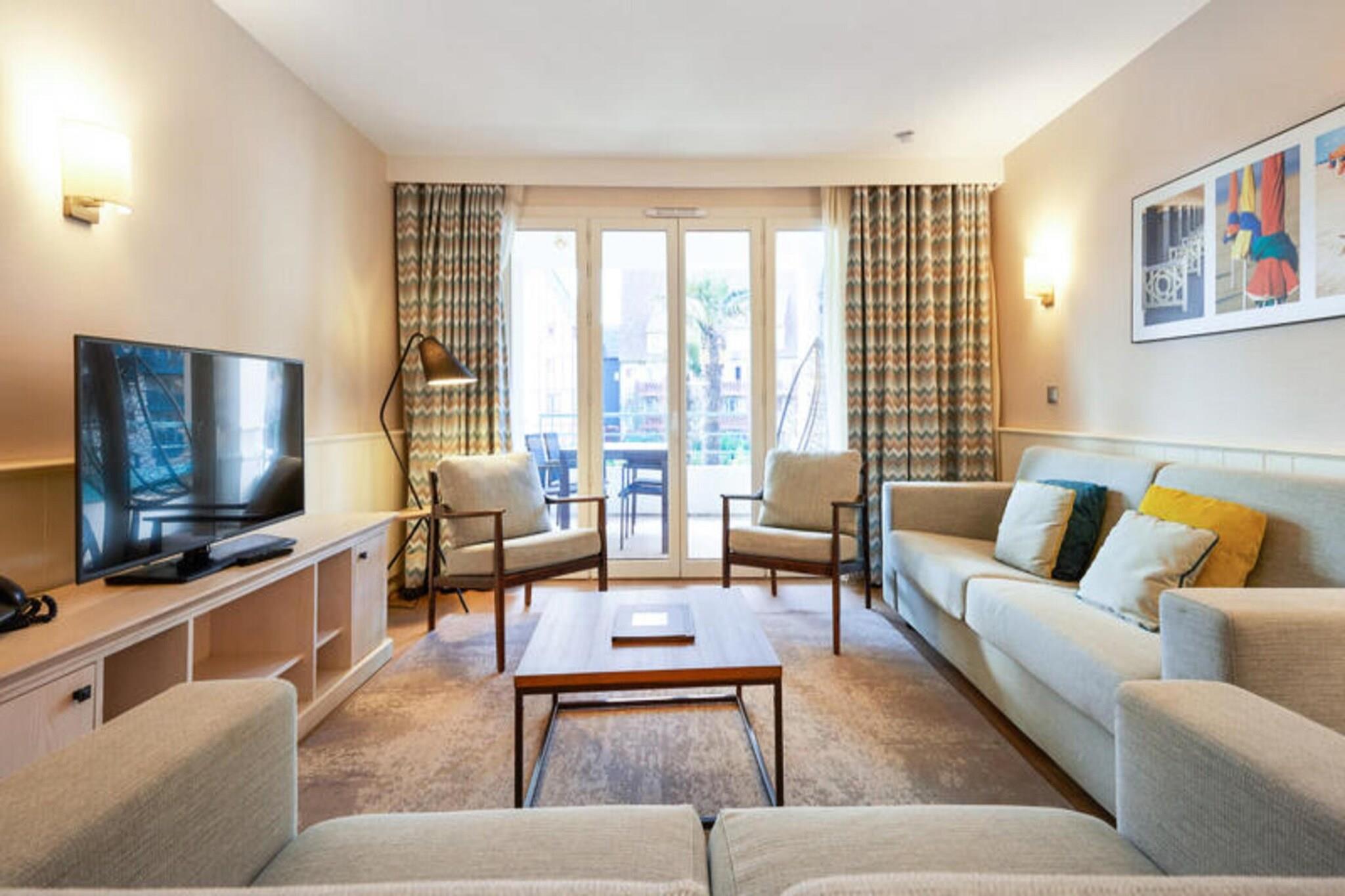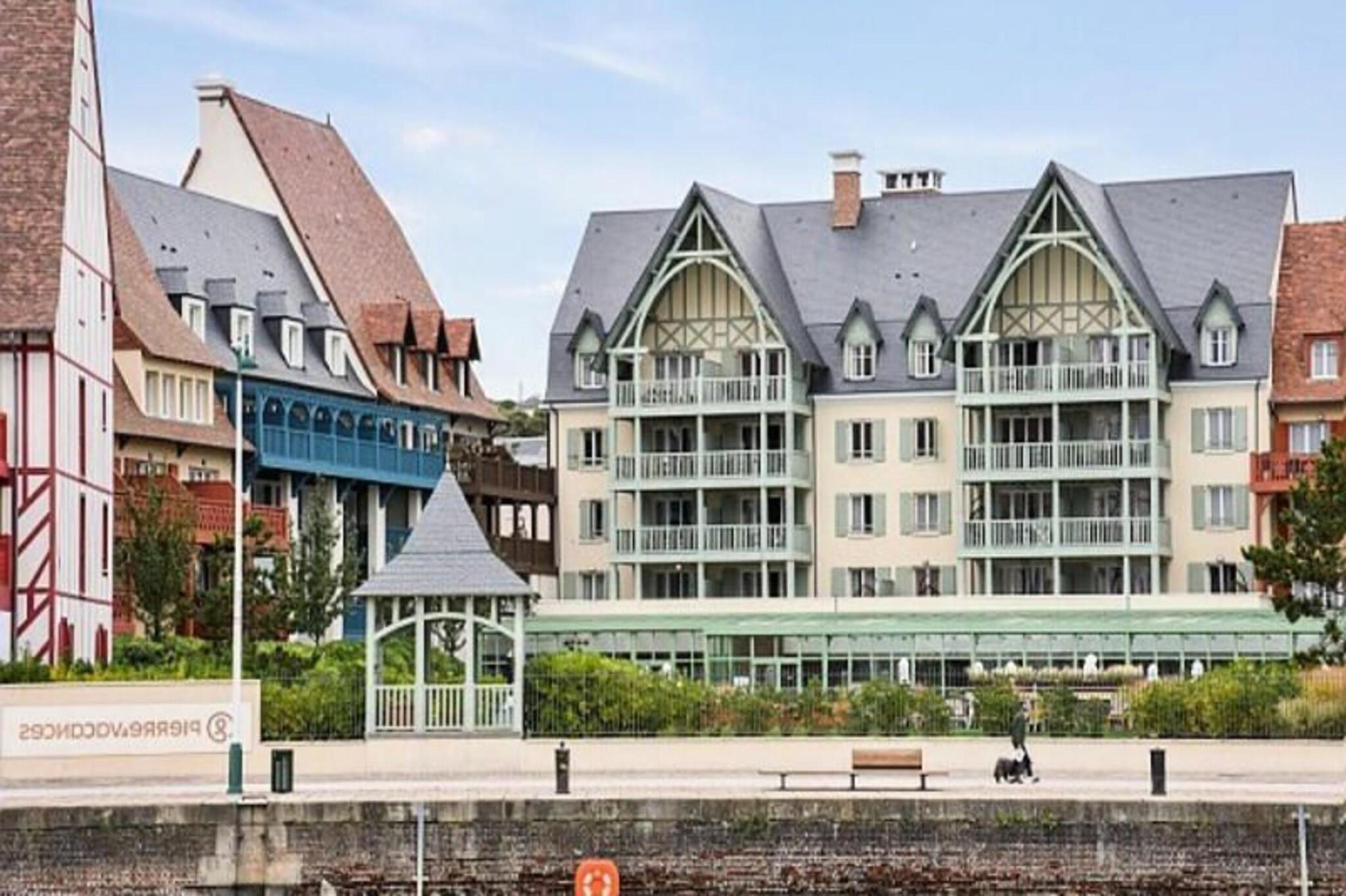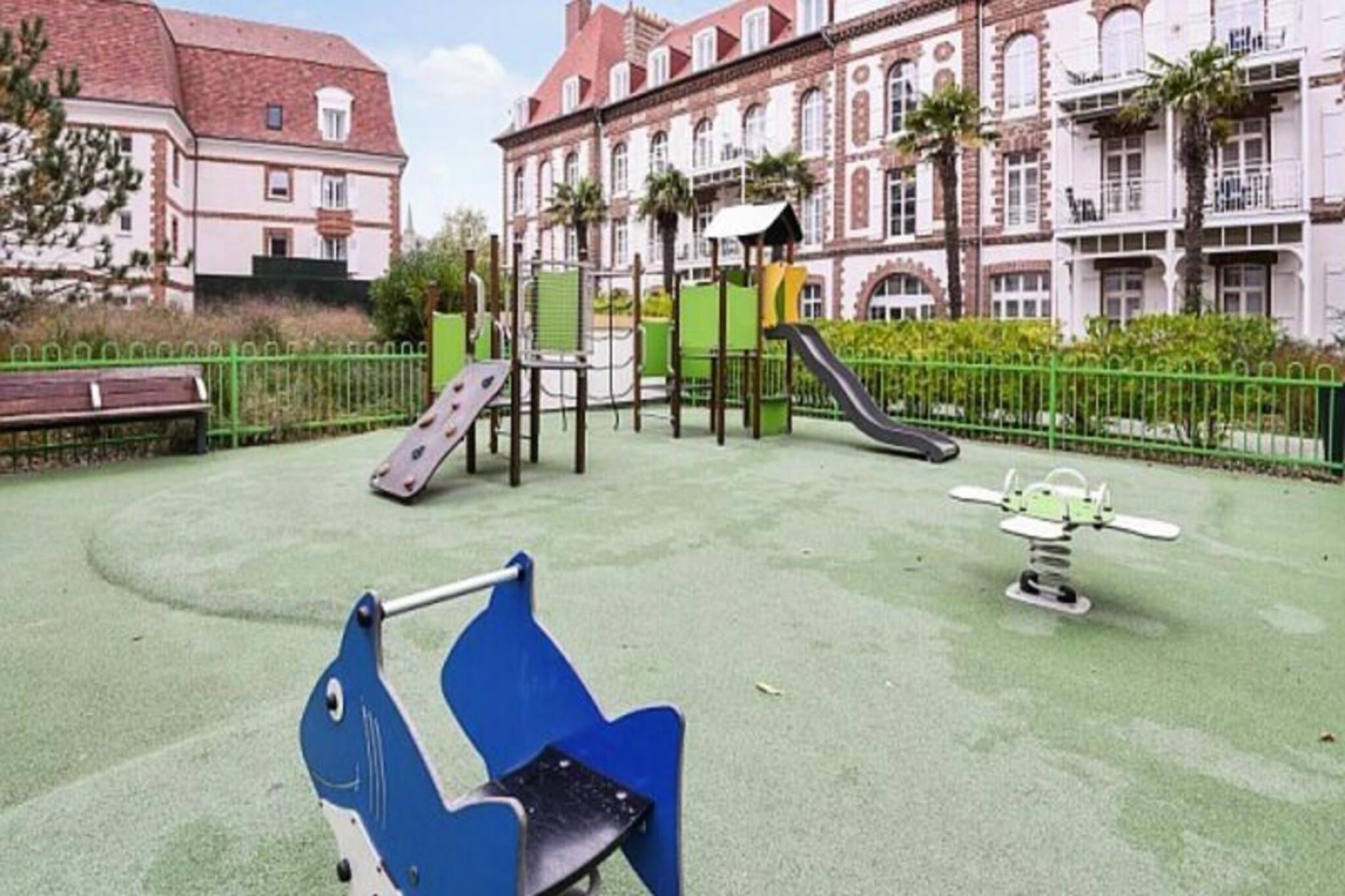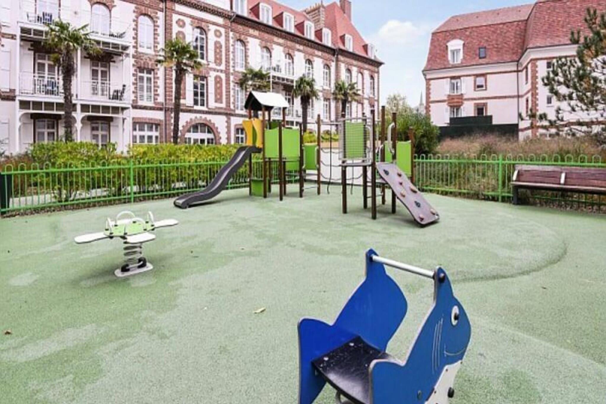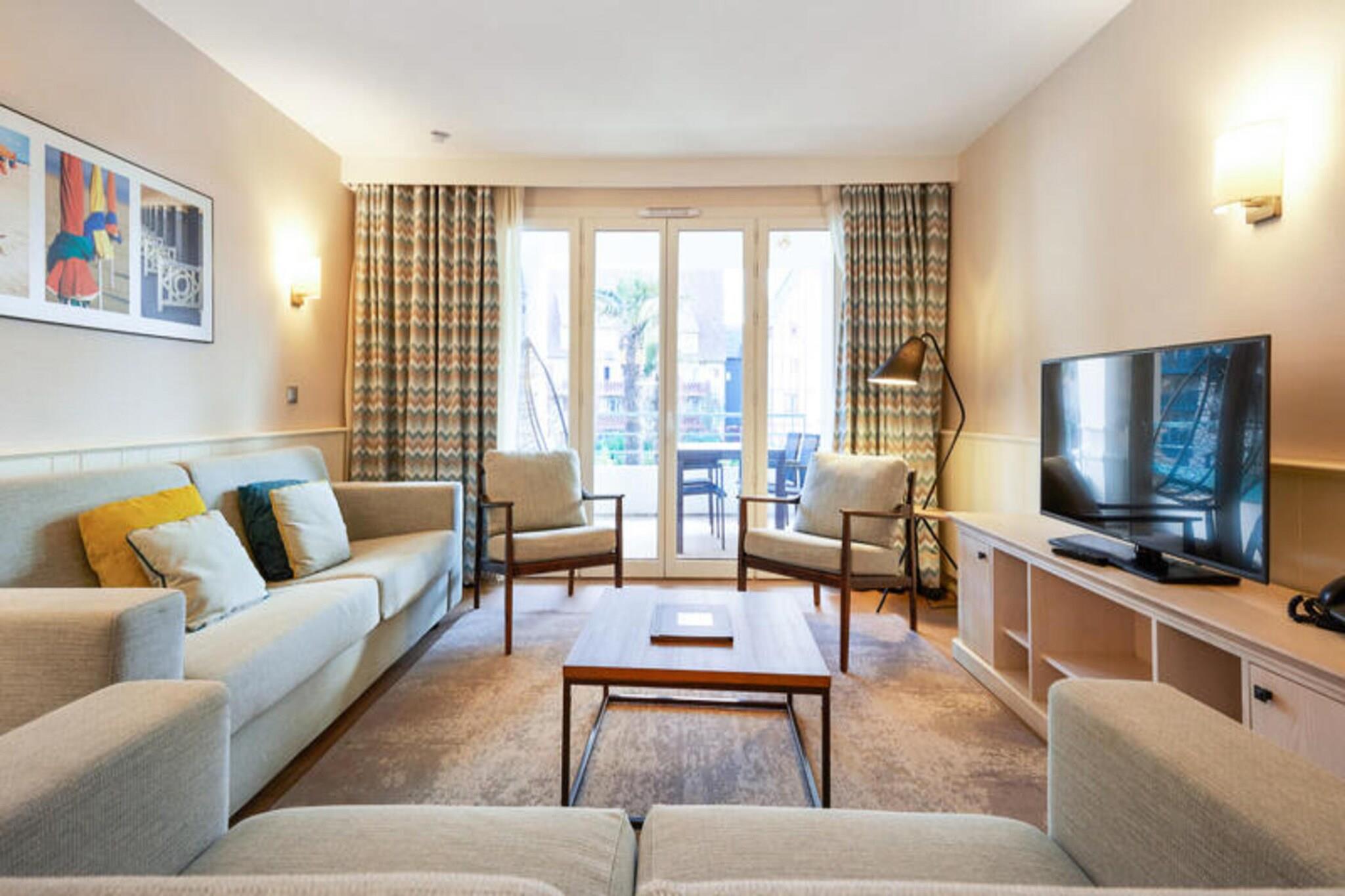 Denne rummelige lejlighed, beliggende mellem Deauville og Trouville, tilbyder et komfortabelt tilflugtssted for op til seks gæster. Opholdsområdet omfatter en sovesofa, mens de to soveværelser har en dobbeltseng og to enkeltsenge, hvilket sikrer en afslappende nat for alle. Lejligheden er kæledyrsvenlig, med et ekstra gebyr for at medbringe dine lodne ledsagere. Nyd moderne bekvemmeligheder såsom Wi-Fi, sengelinned og håndklæder, med slutrengøring tilgængelig mod et ekstra gebyr. En balkon eller terrasse giver et fredeligt udendørsområde til at slappe af og nyde udsigten. Ejendommen ligger 300 meter fra togstationen og tilbyder nem adgang til nærliggende attraktioner. Deauville resort, med golf, ridning og tennis, er en kort gåtur væk. Området byder på caféer, markeder og lokale retter, mens Deep Nature wellness-center, strand og kasino er også i nærheden. Lejligheden har et fuldt udstyret køkken med alt det nødvendige, såsom køleskab, komfur og opvaskemaskine, hvilket gør det nemt at tilberede dine egne måltider. Der er to badeværelser, det ene med badekar og det andet med bruser og toilet, plus et separat toilet for ekstra bekvemmelighed. Gæster kan også nyde adgang til faciliteterne på stedet, herunder en udendørs og indendørs swimmingpool, sauna og fitnessrum, perfekt til at slappe af efter en dag med sightseeing. Overdækket parkering er tilgængelig inden for boligen for dem, der rejser i bil.