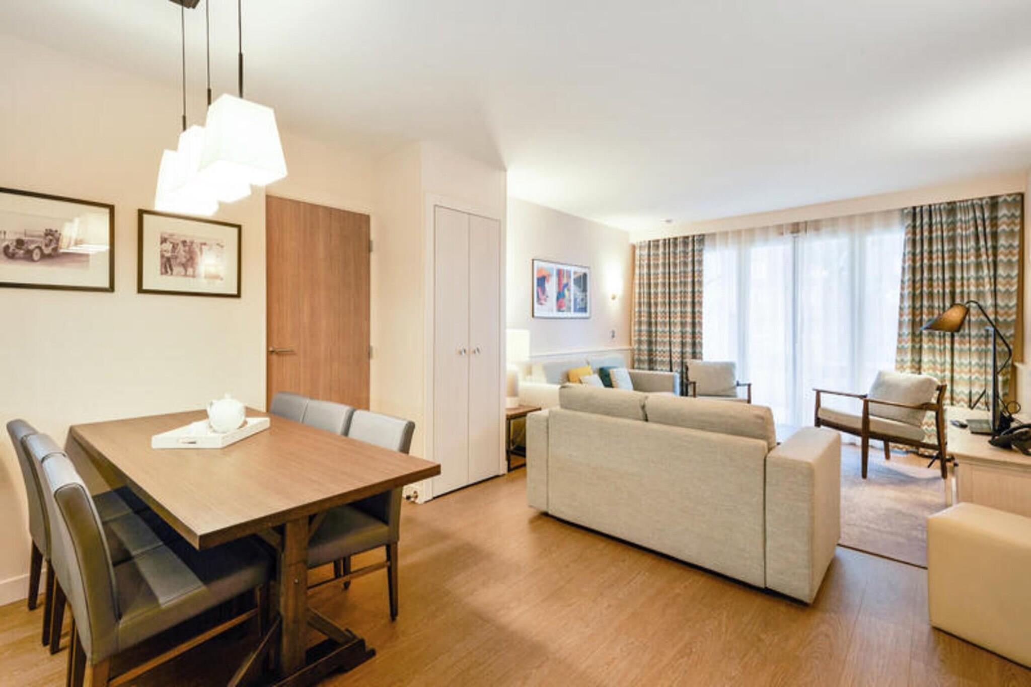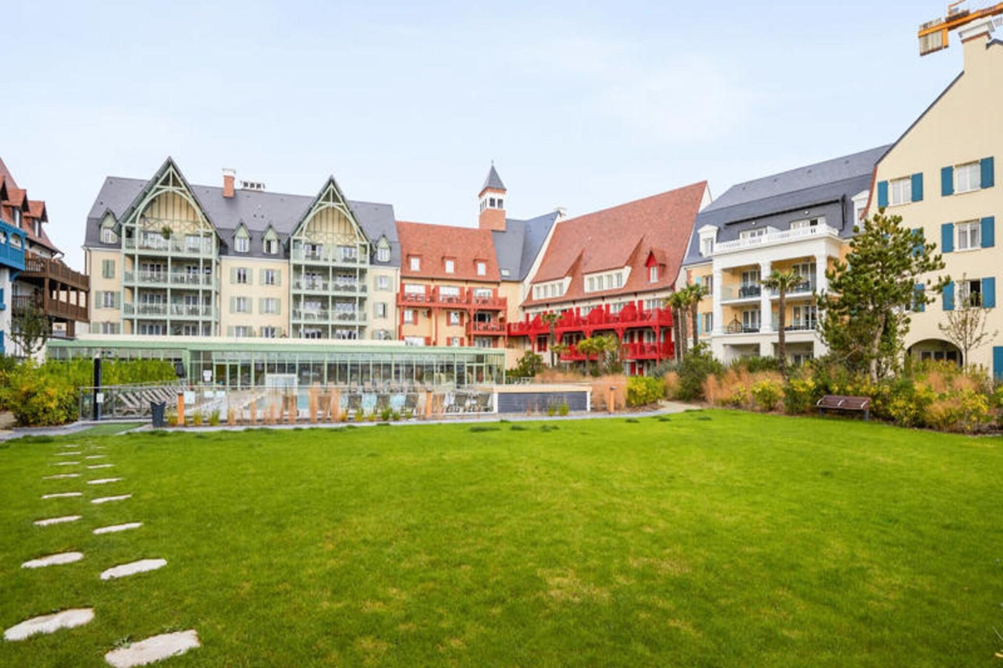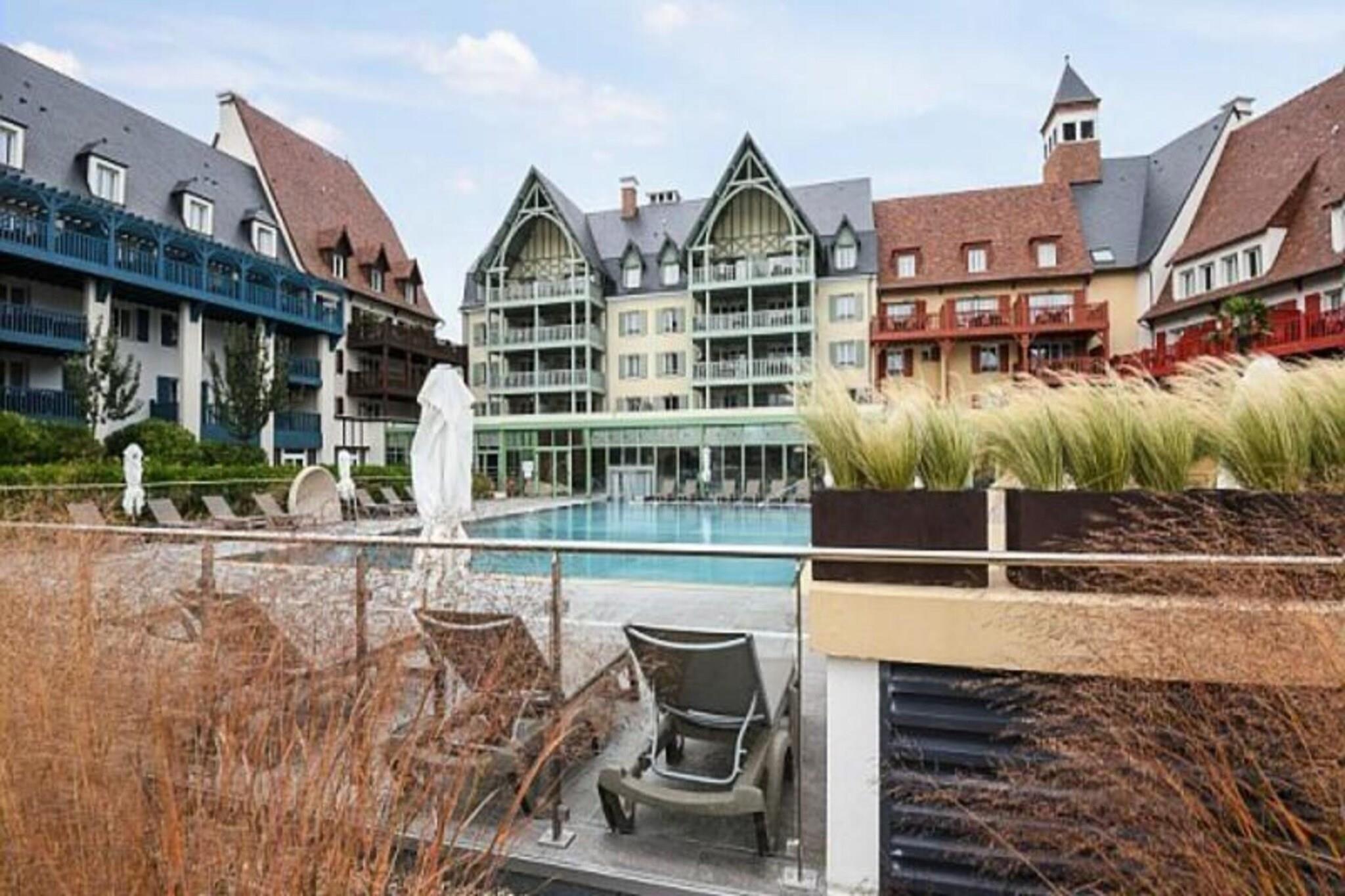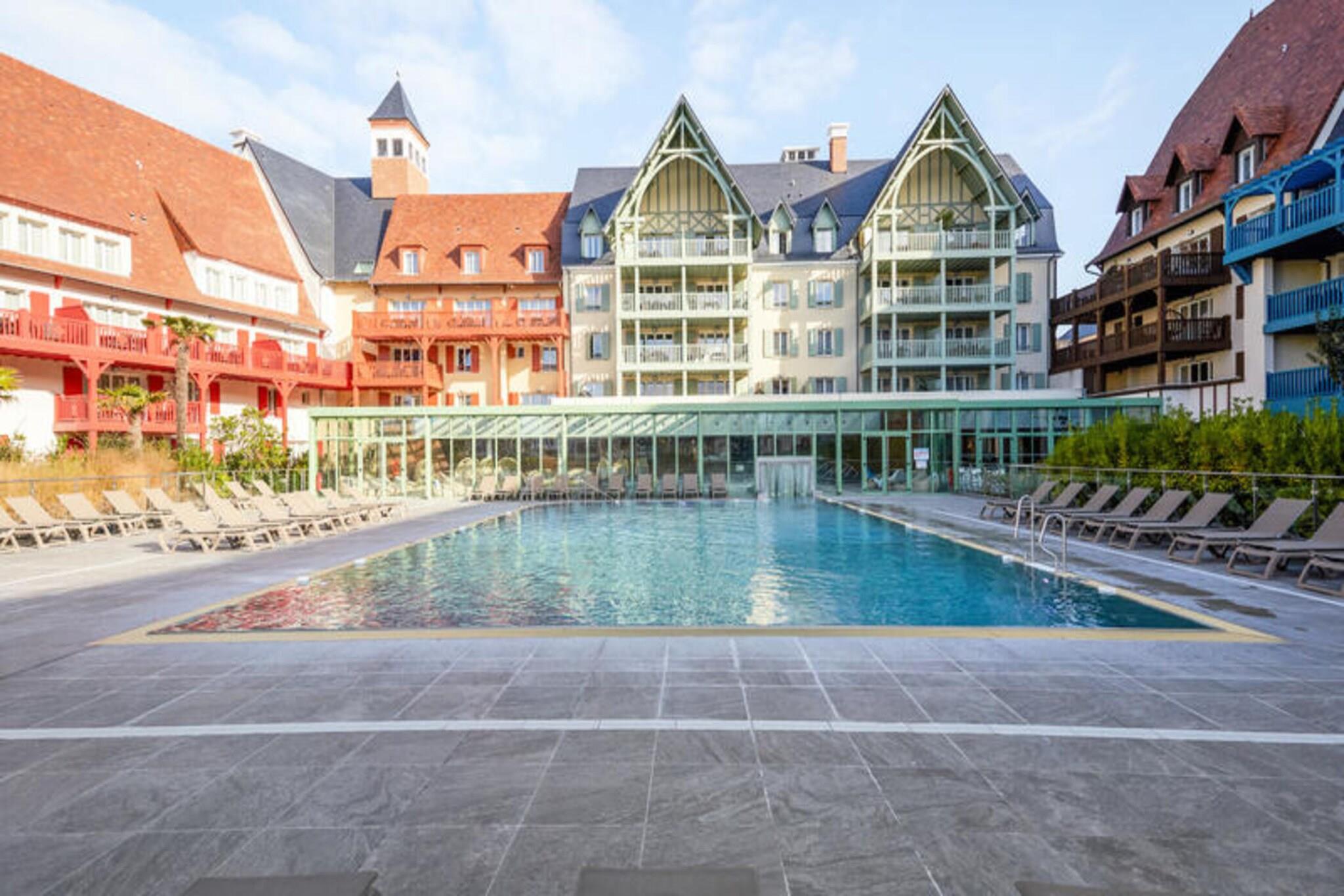 Denne rummelige lejlighed, beliggende mellem Deauville og Trouville, tilbyder et komfortabelt tilflugtssted for op til seks gæster. Opholdsområdet omfatter en sovesofa, mens de to soveværelser har en dobbeltseng og to enkeltsenge, hvilket sikrer en afslappende nat for alle. Lejligheden er kæledyrsvenlig, med et ekstra gebyr for at medbringe dine lodne ledsagere. Nyd moderne bekvemmeligheder såsom Wi-Fi, sengelinned og håndklæder, med slutrengøring tilgængelig mod et ekstra gebyr. En balkon eller terrasse giver et fredeligt udendørsområde til at slappe af og nyde udsigten. Ejendommen ligger 300 meter fra togstationen og tilbyder nem adgang til nærliggende attraktioner. Deauville resort, med golf, ridning og tennis, er en kort gåtur væk. Området byder på caféer, markeder og lokale retter, mens Deep Nature wellness-center, strand og kasino er også i nærheden. Lejligheden har et fuldt udstyret køkken med alt det nødvendige, såsom køleskab, komfur og opvaskemaskine, hvilket gør det nemt at tilberede dine egne måltider. Der er to badeværelser, det ene med badekar og det andet med bruser og toilet, plus et separat toilet for ekstra bekvemmelighed. Gæster kan også nyde adgang til faciliteterne på stedet, herunder en udendørs og indendørs swimmingpool, sauna og fitnessrum, perfekt til at slappe af efter en dag med sightseeing. Overdækket parkering er tilgængelig inden for boligen for dem, der rejser i bil.