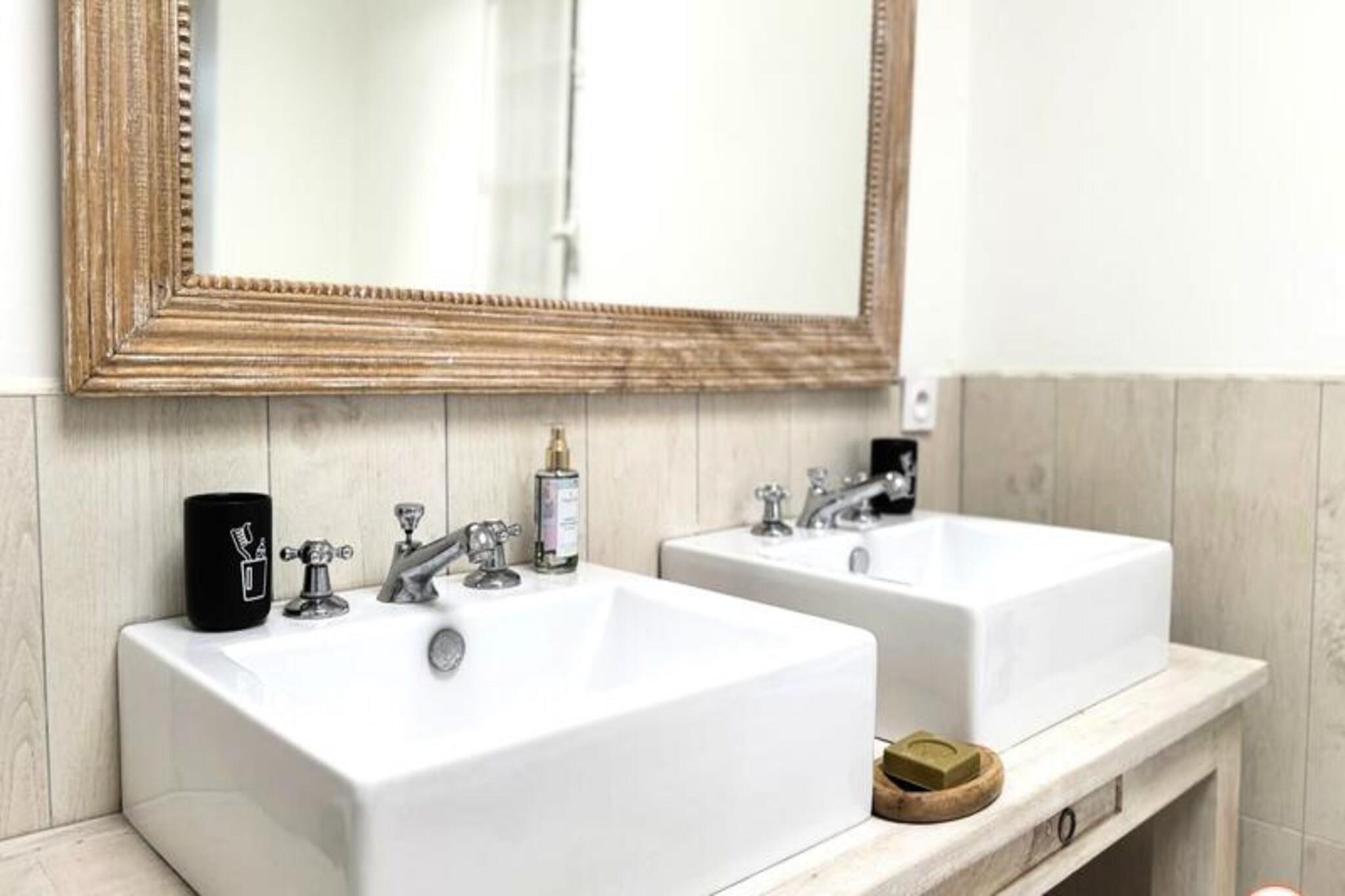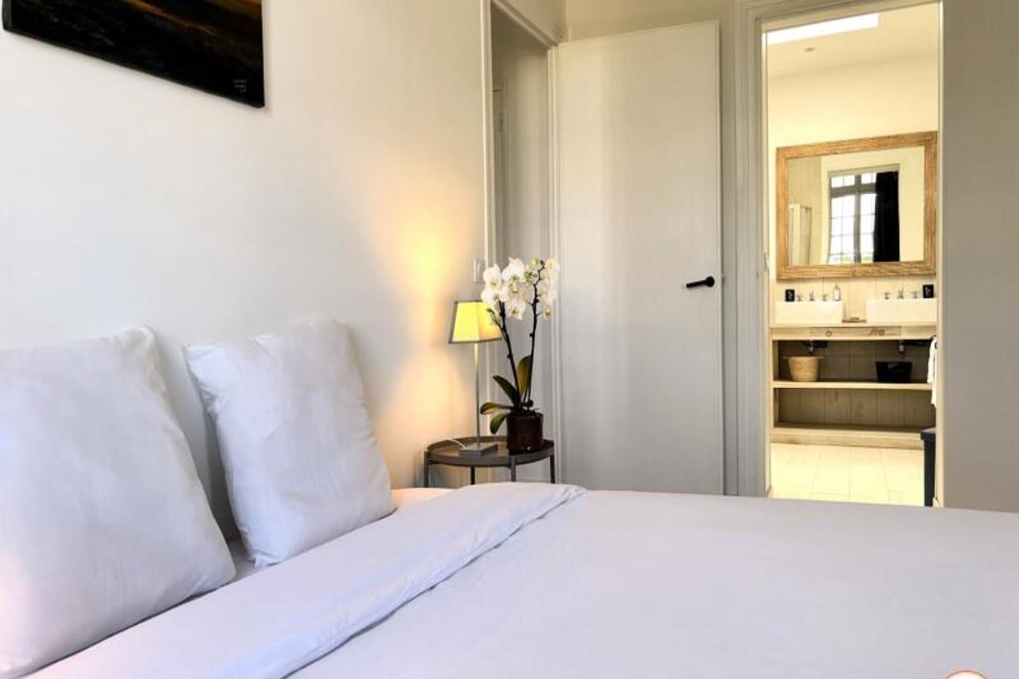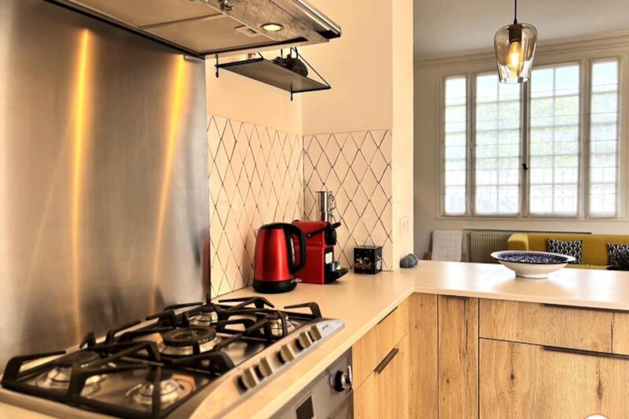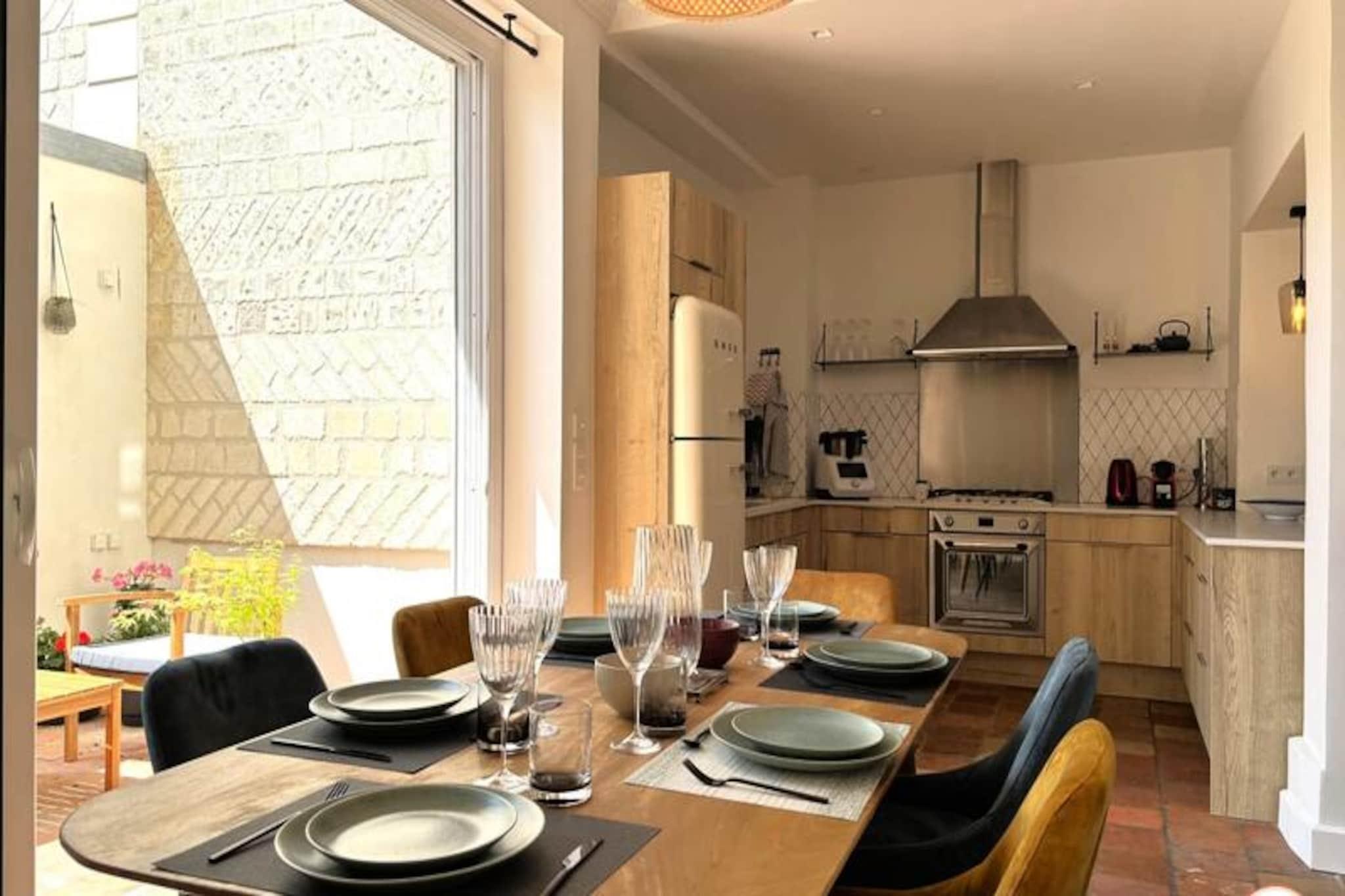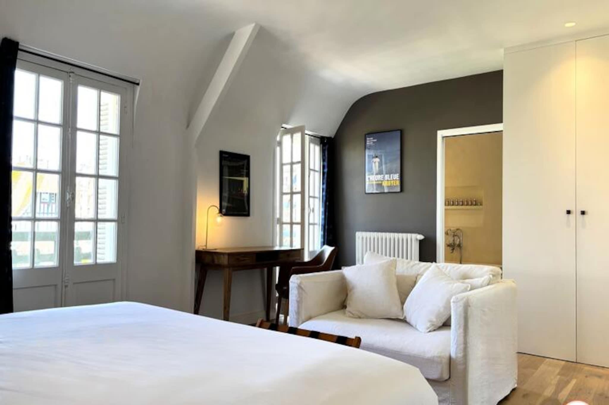 Hvor Normandiets charme møder Deauvilles elegance, inviterer La Villa Mirabeau dig til et uforglemmeligt ophold. Med udsigt over havet og den maleriske havneindsejling i Deauville-Trouville-sur-Mer blander dette fantastiske herregård traditionel normannisk arkitektur med moderne luksus. Fra de solbeskinnede balkoner til det afsondrede solarium er hvert hjørne af dette hjem designet til at fortrylle og inspirere. Uanset om du nipper til din kaffe, mens morgenlyset danser på bølgerne, eller slapper af i den hyggelige gårdhave, tilbyder La Villa Mirabeau en rolig tilflugtssted kun få skridt fra Deauvilles pulserende hjerte. Denne karakteristiske villa, der strækker sig over tre etager, har komfortabel plads til op til 8 gæster. Stueetagen kan prale af en rummelig stue med en monumental pejs, perfekt til hyggelige aftener, og et åbent køkken udstyret med high-end apparater som et SMEG-køleskab og en Nespresso-maskine. Ovenpå finder du et afslapningsområde med sovesofa og tv, en master suite med betagende udsigt over havnen og et mindre soveværelse med eget brusebad. Øverste etage er en oase af luksus med endnu en master suite med panoramaudsigt, et privat badeværelse med bruseniche og badekar samt adgang til et afsidesliggende solarium for ultimativ afslapning. Alle værelser, undtagen ét, har en privat balkon, hvor man kan nyde kystens skønhed. Villaen ligger i hjertet af Deauville, kun 3 minutters gang fra stranden og dens ikoniske strandpromenade, 5 minutters gang fra det livlige bycentrum og under 10 minutter fra togstationen. I nærheden kan du udforske det travle fiskemarked, Barrière Casinos og en række berømte restauranter og kunstgallerier. For dem, der søger både ro og spænding, er denne beliggenhed uovertruffen. Uanset om du er her for at forkæle dig selv med Deauvilles elegante livsstil, udforske den naturskønne Normandiskyst eller blot slappe af i et hjem, der føles som et privat tilflugtssted, lover La Villa Mirabeau et ophold fyldt med elegance, komfort og uforglemmelige minder.