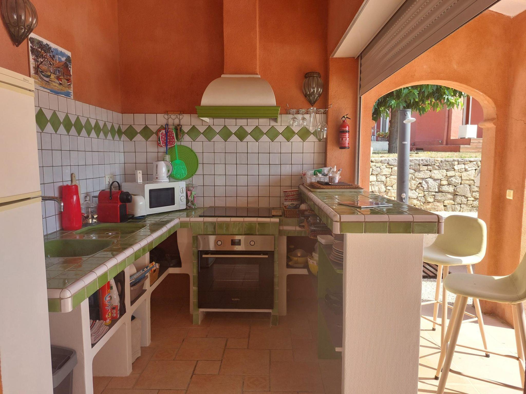 "Le Cabanon", 1-room house 35 m2. Practical and beautiful furnishings: living/sleeping room with 1 french bed (140 cm, length 190 cm), dining table, TV, electric heating and air conditioning. Exit to the terrace. Open kitchen (oven, 3 induction hot plates, toaster, kettle, microwave, freezer, electric coffee machine, Capsules for coffee machine (Nespresso) extra). Shower/WC. Terrace 12 m2, roofed. Terrace furniture, electric barbecue, deck chairs (3). View of the swimming pool and the garden. Facilities: washing machine, iron, children's high chair, baby cot. Internet (WiFi, free). Parking (1 car). Please note: non-smoking house. The kitchen is an open summer kitchen outdoors.