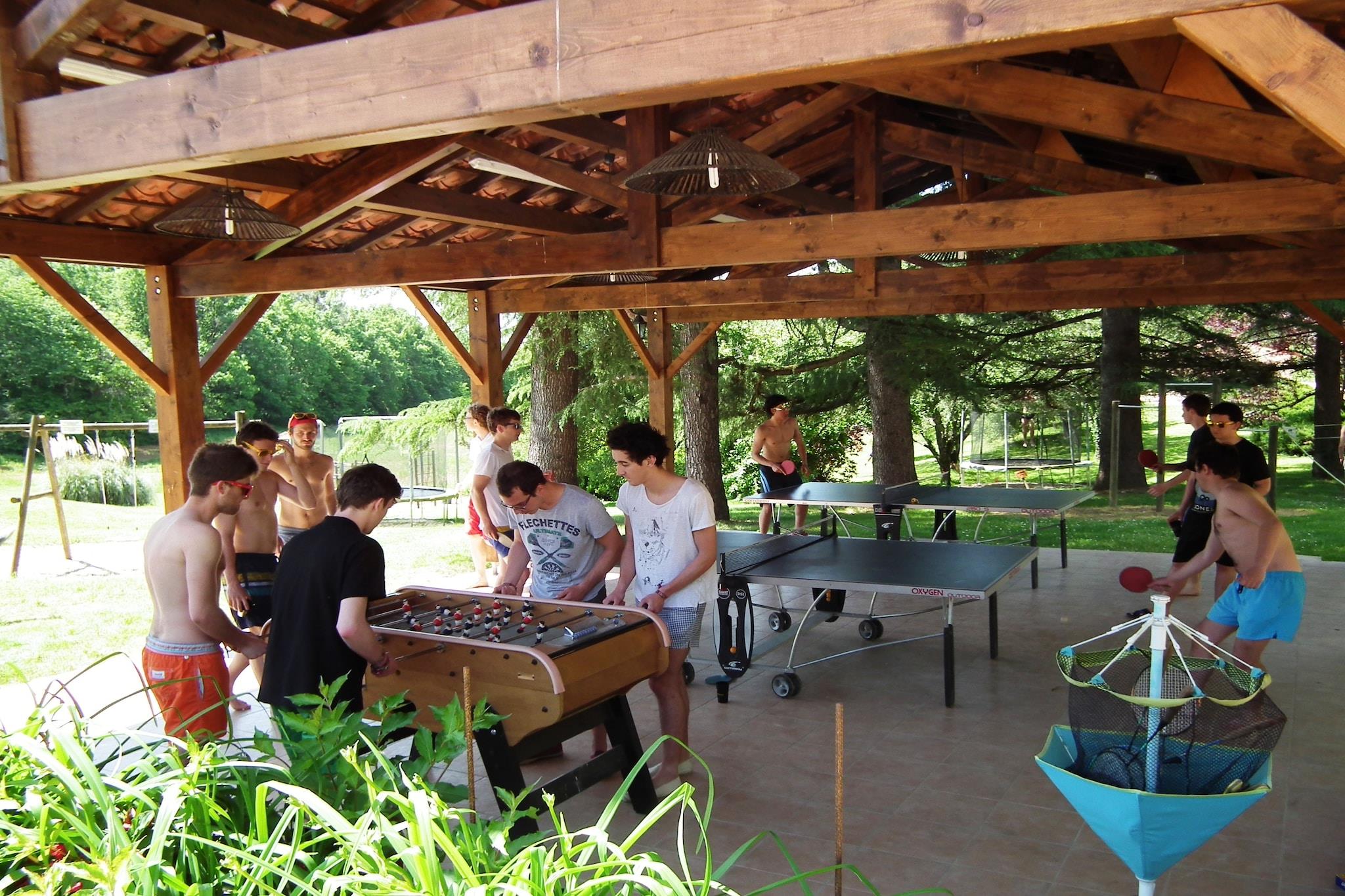 Stueetage: (Stue(dobbeltsovesofa, radio, CD-afspiller, havedøre), Køkken(komfur(Komfur med to kogeplader), combi-mikroovn, køle-fryseskab), soveværelse(dobbeltseng), badeværelse(bruser, håndvask, toilet)) 2x hesteopstaldning(på stedet), tørretumbler(deles med andre gæster), vaskemaskine(deles med andre gæster), fester, receptioner(125 m2), varme(elektrisk), terrasse(overdækket), have(deles med andre gæster), havemøbler, parkering, trampolin, dam, swimmingpool(deles med andre gæster, opvarmet), 2x swimmingpool(deles med andre gæster, herunder en del for børn (maks. dybde 50 cm)), 2x tennisbane, petanquebane, legeredskaber, 2x bordtennisbord, bordfodbold, biljard, fitnessapparater