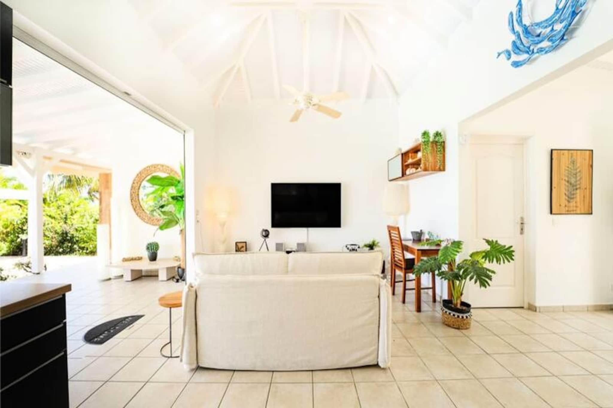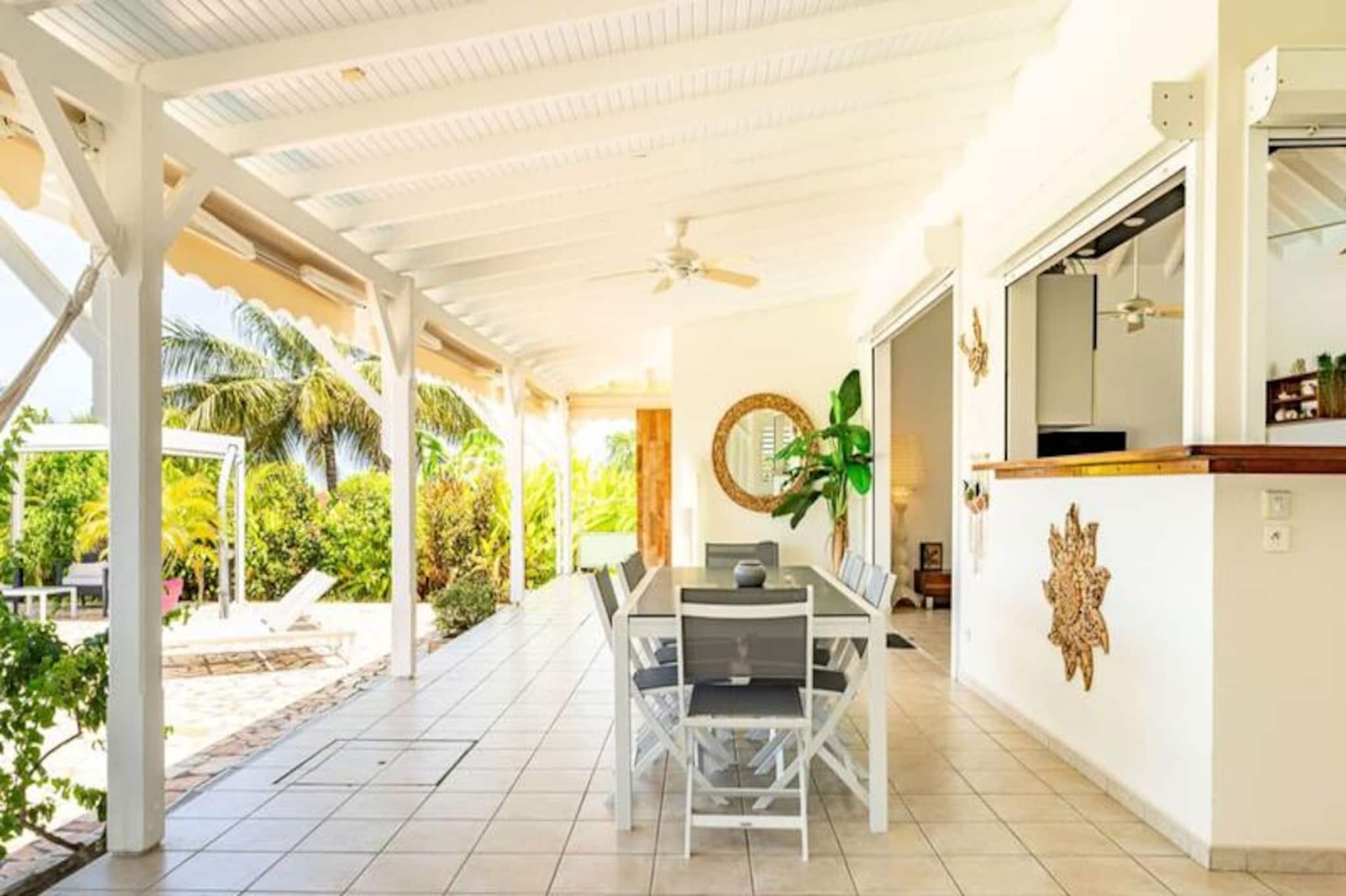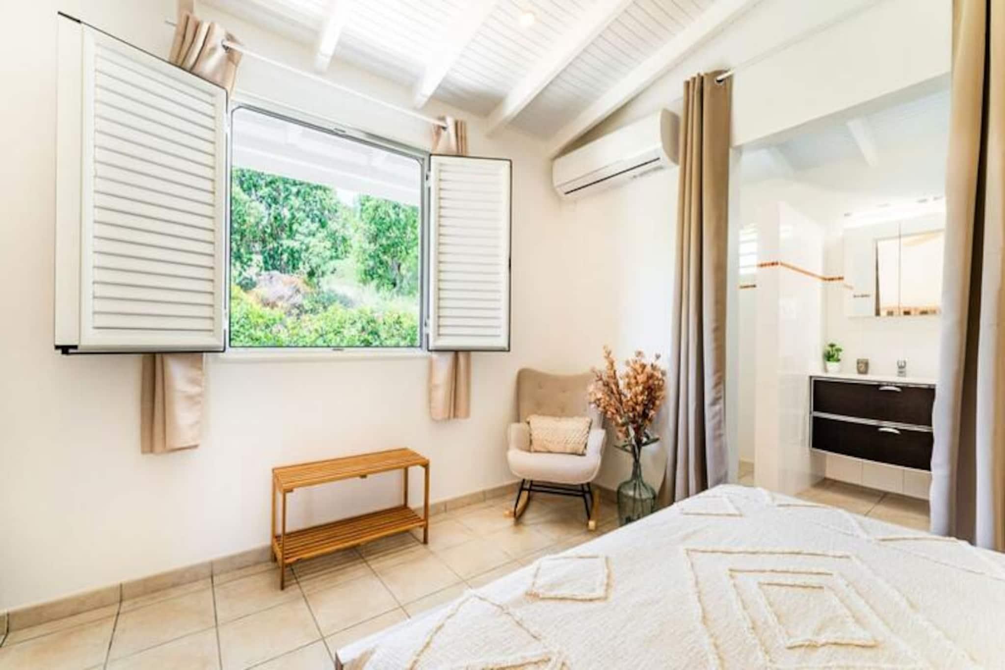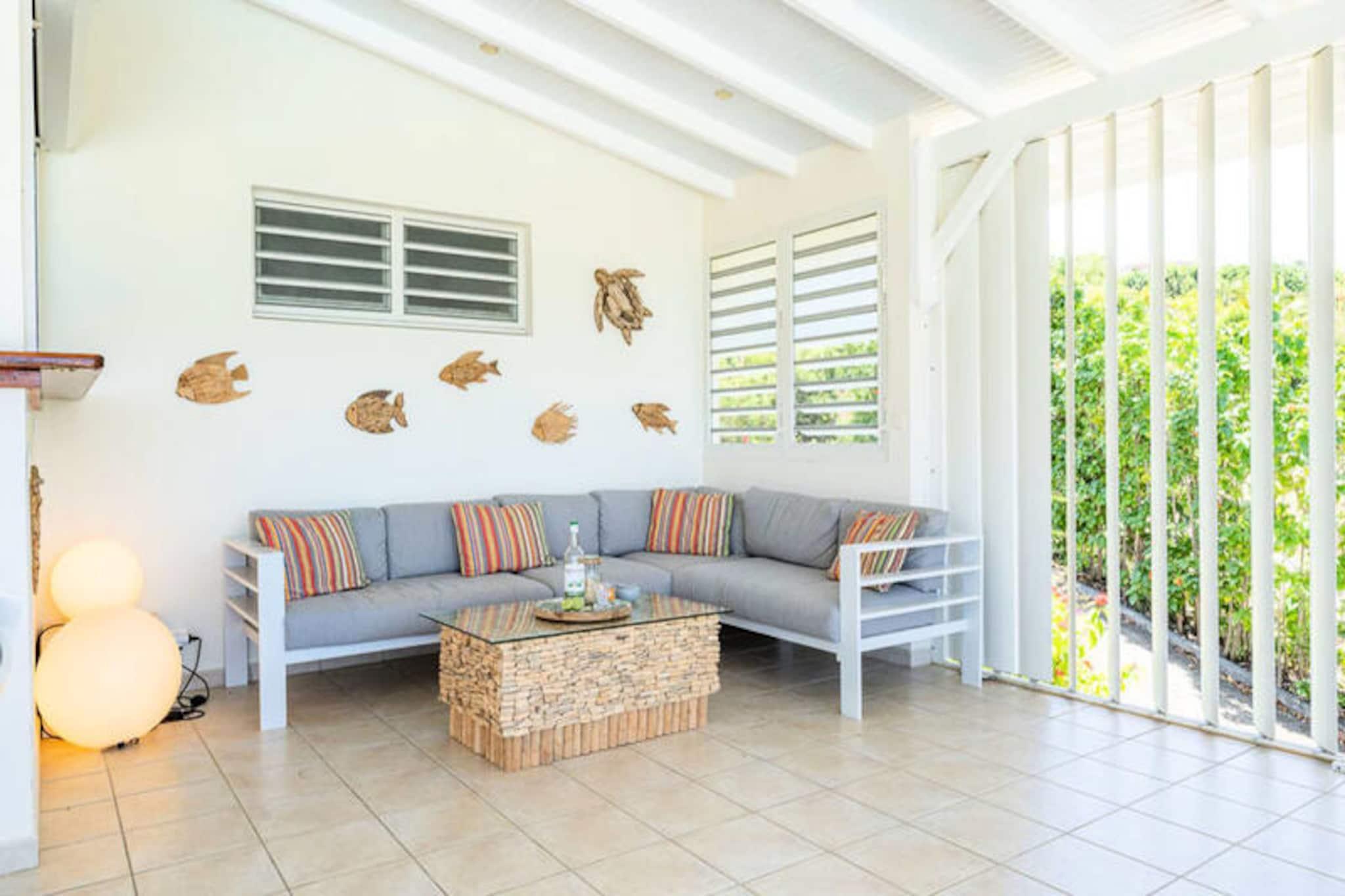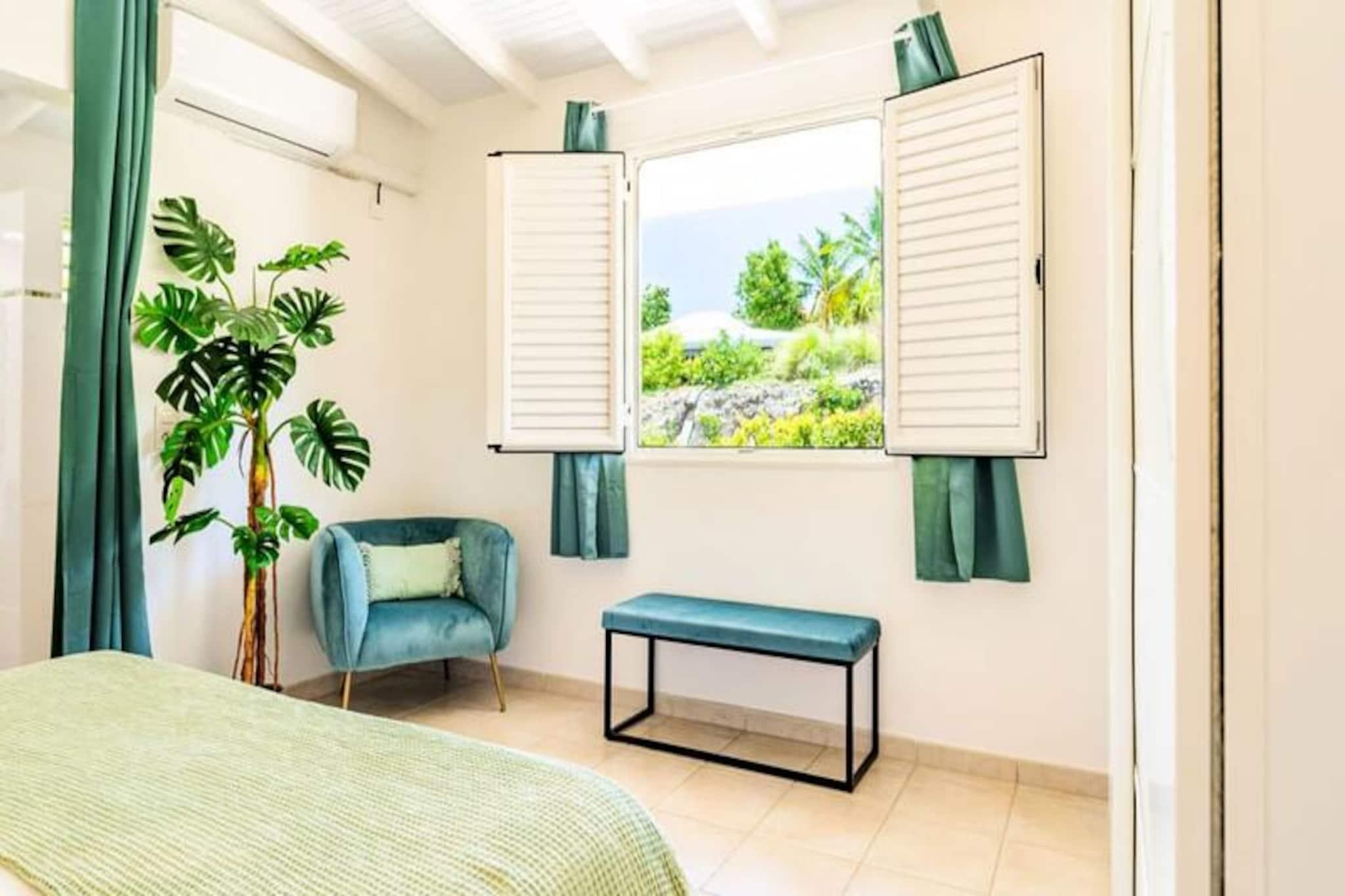 Beliggende på de fredfyldte højder i Grand-Bourg er Villa Margaux et fristed af ro med en betagende udsigt over havet og de omkringliggende øer. Dette idylliske tilflugtssted er perfekt til familier eller venner, der søger en luksuriøs flugt under den caribiske sol. Fra det øjeblik du ankommer, inviterer villaens charme og elegance dig til at slappe af og nyde Marie-Galantes skønhed. Villaen kan prale af tre rummelige soveværelser, der hver har en komfortabel dobbeltseng og et privat badeværelse, hvilket sikrer både privatliv og afslapning for op til seks gæster. Den lyse og luftige stue er problemfrit forbundet med et fuldt udstyret køkken og skaber et indbydende rum til fælles øjeblikke. Gå udenfor på den store terrasse, hvor du finder en stor swimmingpool, der er perfekt til forfriskende dukkerter eller afslapning med en cocktail i hånden. Hvert hjørne af denne ejendom er designet til at maksimere komforten og fremvise den fantastiske havudsigt. Ideelt beliggende kun fem minutter fra hjertet af Grand-Bourg tilbyder Villa Margaux nem adgang til øens skatte. Gå en tur gennem pulserende markeder, nyd kreolske delikatesser på lokale restauranter, eller udforsk de uberørte hvide sandstrande ved Anse Canot og La Feuillère, et kitesurfingparadis. Oplev øens rige kulturarv ved at besøge romdestillerier eller vandre gennem frodige sukkerrørsmarker og uberørte landskaber. Med sin uovertrufne udsigt, luksuriøse faciliteter og nærhed til Marie-Galantes højdepunkter lover Villa Margaux en uforglemmelig ferie, hvor afslapning og opdagelse går hånd i hånd. Lad Caribiens blide rytme sætte tonen for din drømmeferie.