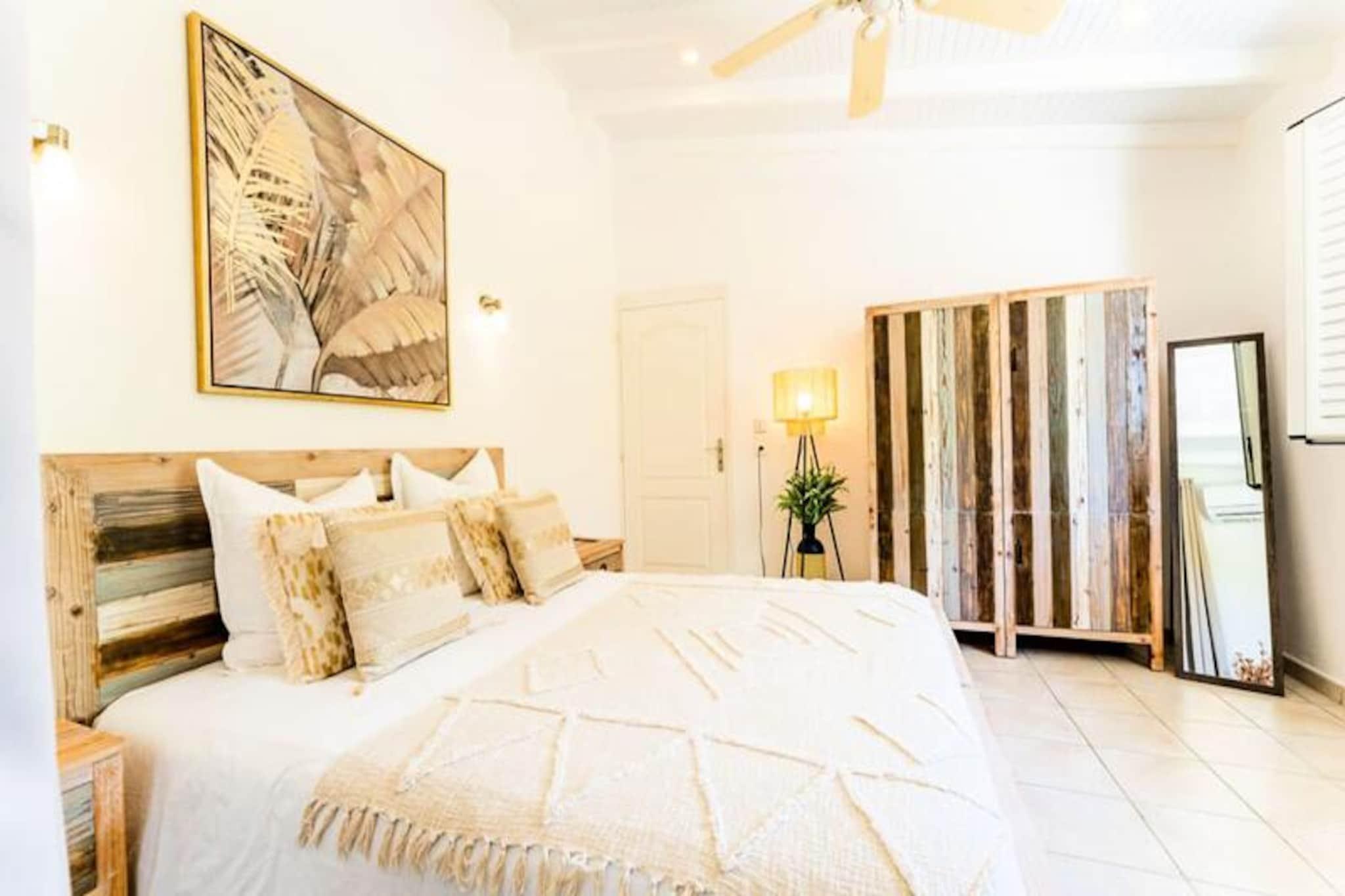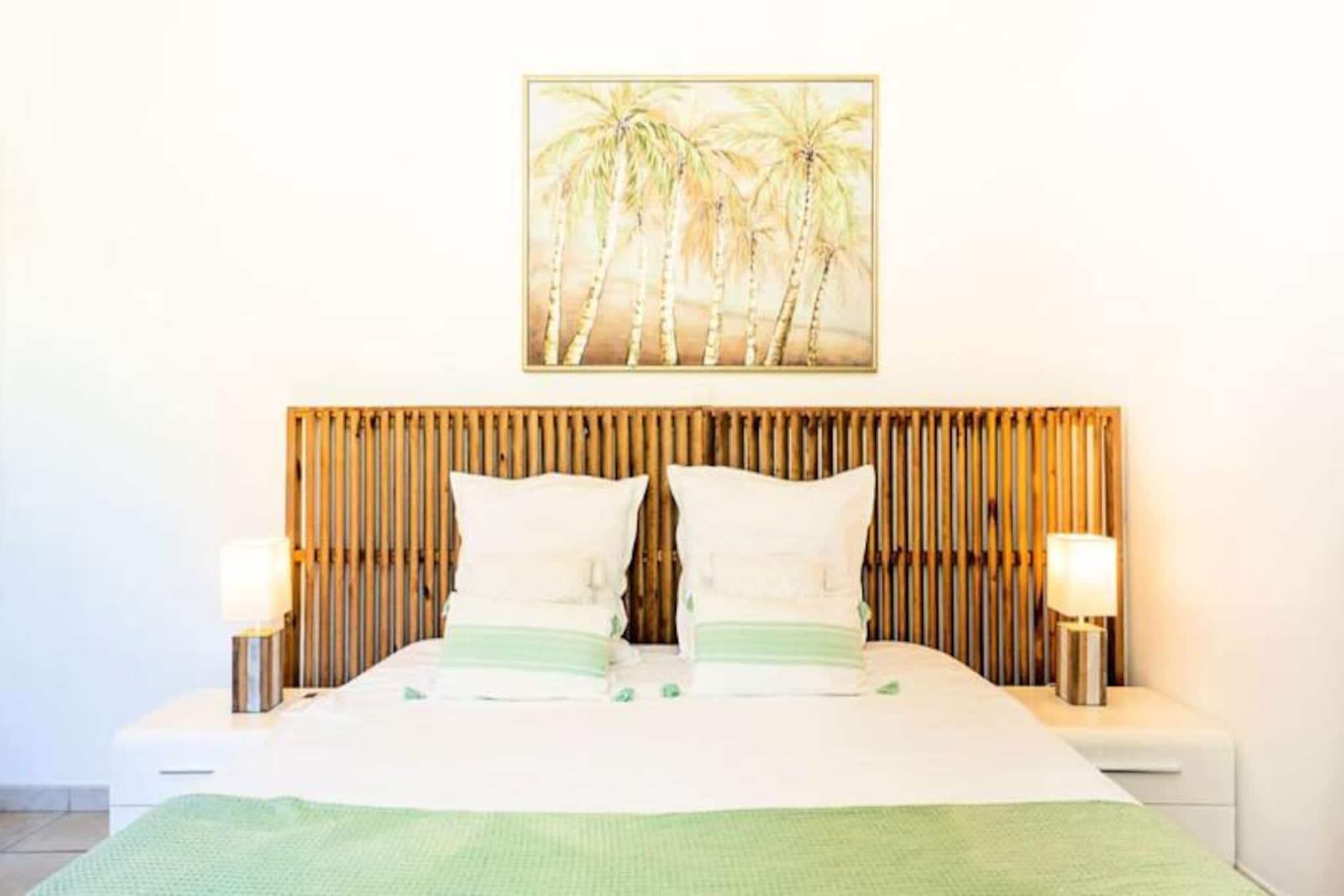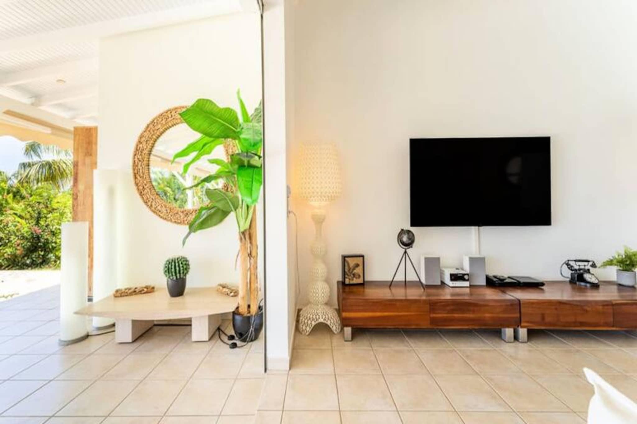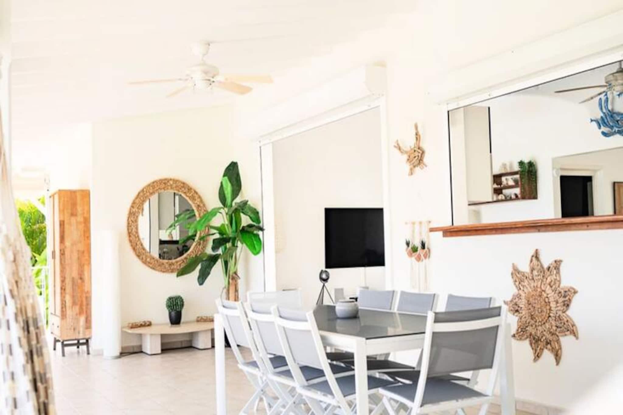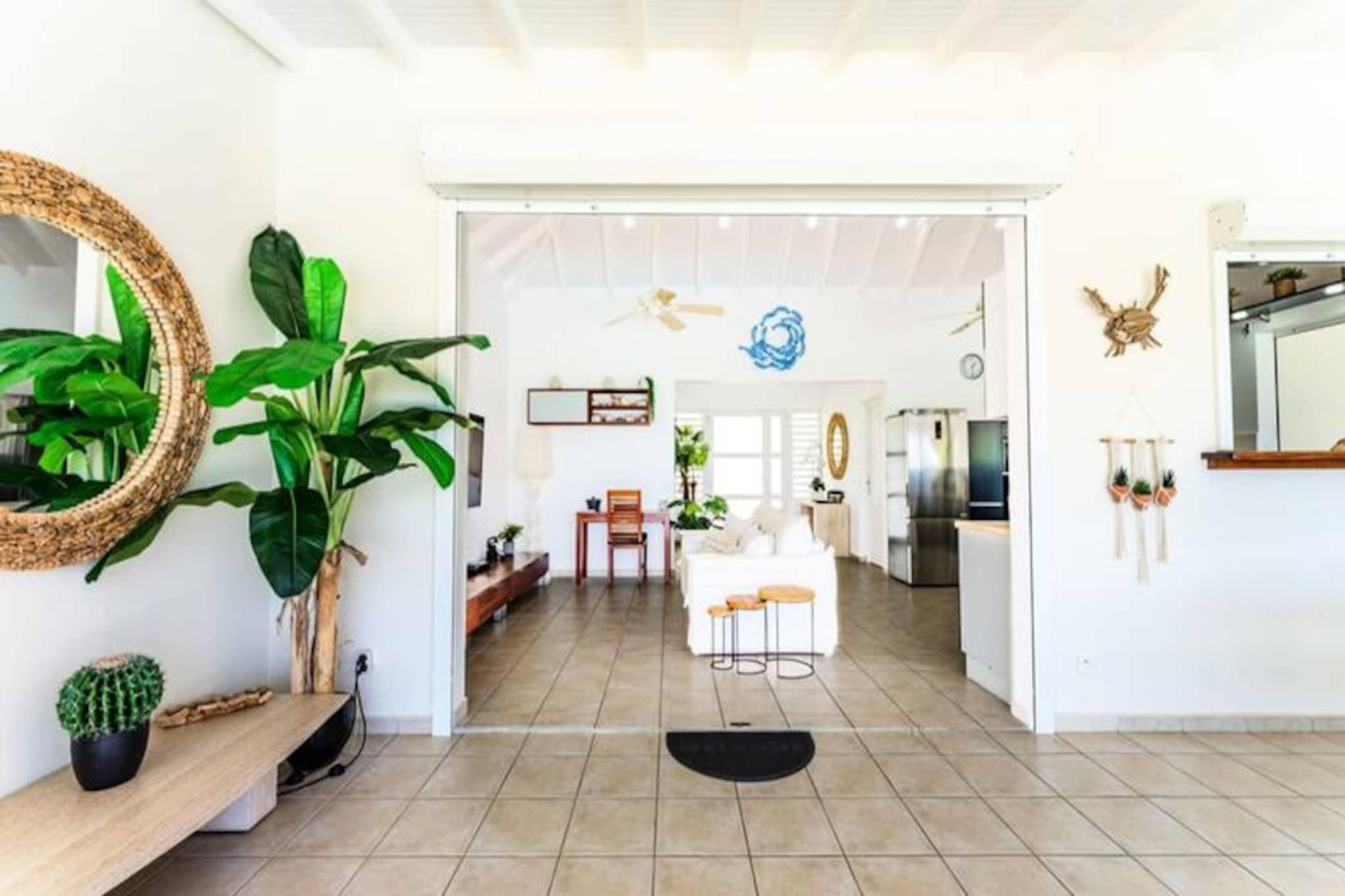 Beliggende på de fredfyldte højder i Grand-Bourg er Villa Margaux et fristed af ro med en betagende udsigt over havet og de omkringliggende øer. Dette idylliske tilflugtssted er perfekt til familier eller venner, der søger en luksuriøs flugt under den caribiske sol. Fra det øjeblik du ankommer, inviterer villaens charme og elegance dig til at slappe af og nyde Marie-Galantes skønhed. Villaen kan prale af tre rummelige soveværelser, der hver har en komfortabel dobbeltseng og et privat badeværelse, hvilket sikrer både privatliv og afslapning for op til seks gæster. Den lyse og luftige stue er problemfrit forbundet med et fuldt udstyret køkken og skaber et indbydende rum til fælles øjeblikke. Gå udenfor på den store terrasse, hvor du finder en stor swimmingpool, der er perfekt til forfriskende dukkerter eller afslapning med en cocktail i hånden. Hvert hjørne af denne ejendom er designet til at maksimere komforten og fremvise den fantastiske havudsigt. Ideelt beliggende kun fem minutter fra hjertet af Grand-Bourg tilbyder Villa Margaux nem adgang til øens skatte. Gå en tur gennem pulserende markeder, nyd kreolske delikatesser på lokale restauranter, eller udforsk de uberørte hvide sandstrande ved Anse Canot og La Feuillère, et kitesurfingparadis. Oplev øens rige kulturarv ved at besøge romdestillerier eller vandre gennem frodige sukkerrørsmarker og uberørte landskaber. Med sin uovertrufne udsigt, luksuriøse faciliteter og nærhed til Marie-Galantes højdepunkter lover Villa Margaux en uforglemmelig ferie, hvor afslapning og opdagelse går hånd i hånd. Lad Caribiens blide rytme sætte tonen for din drømmeferie.