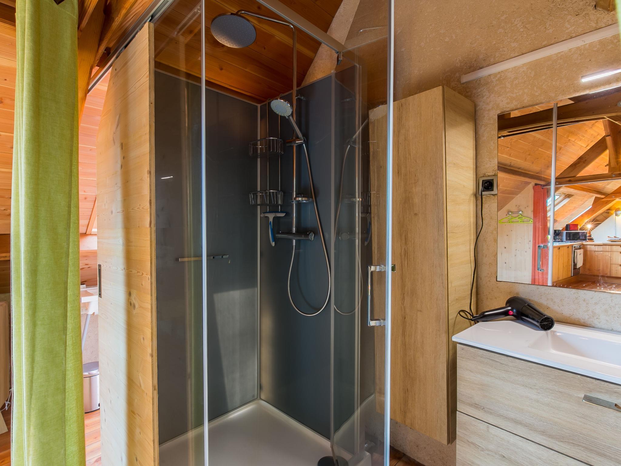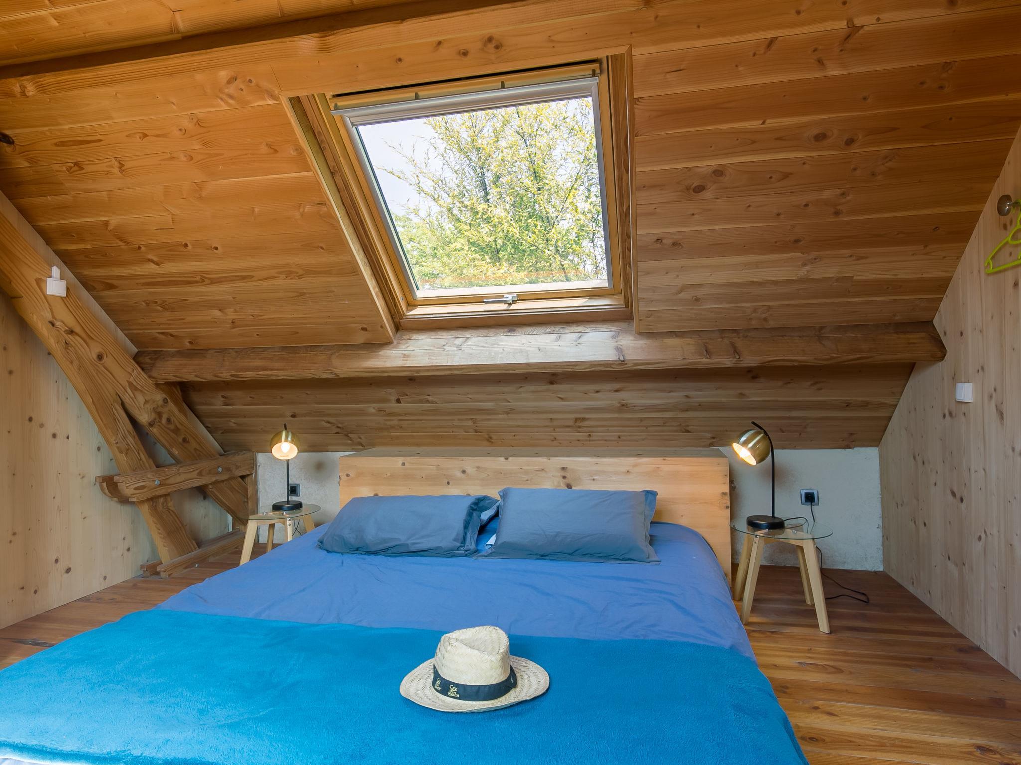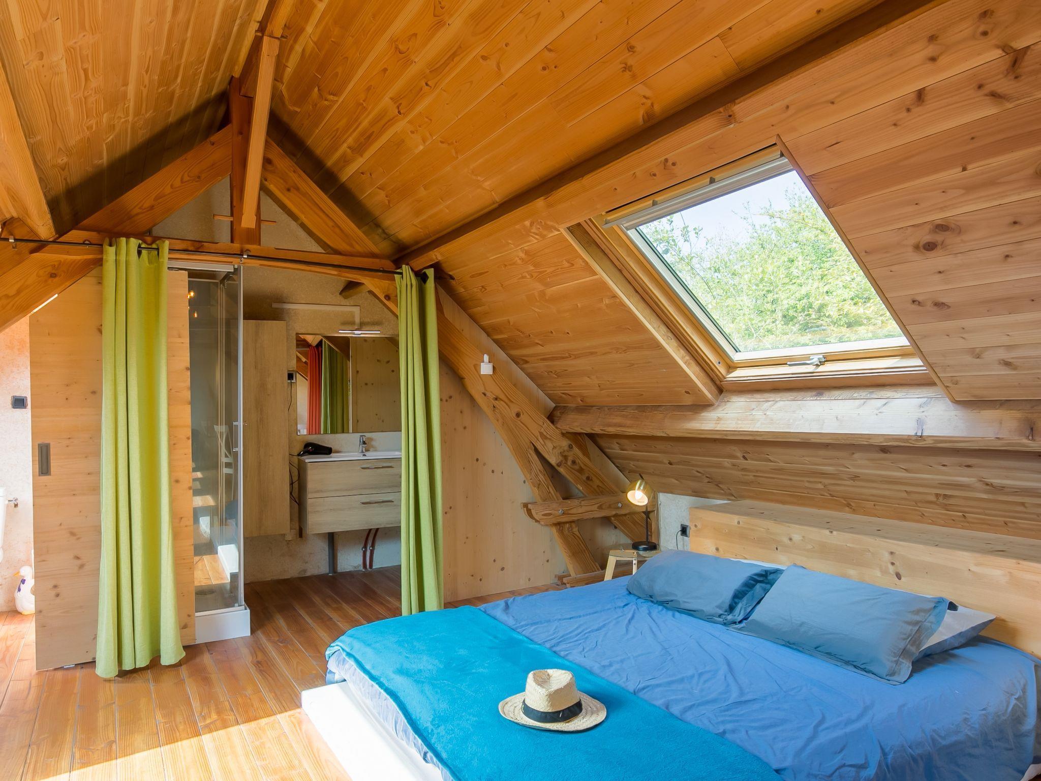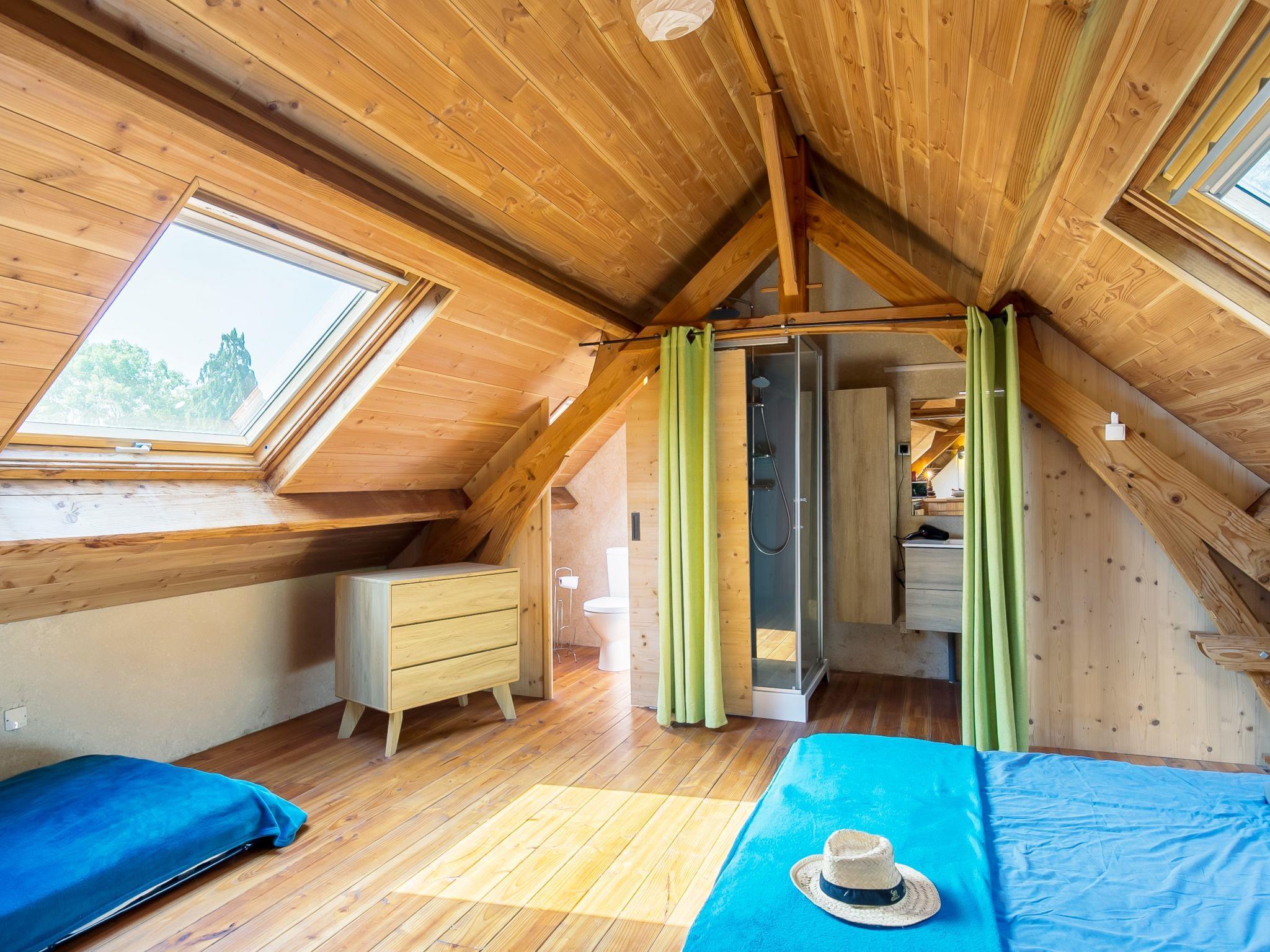 "La Part des Anges", 1-room apartment 55 m2. Object suitable for 2 adults + 1 child. Renovated in 2019, cosy and wooden furniture furnishings: living/dining room with sloping ceilings with rooflight with Scandinavian wood stove, dining table, satellite TV, international TV channels, radio and DVD. 1 open room with sloping ceilings with rooflight with 1 bed (80 cm, length 190 cm), 1 french bed (180 cm, length 200 cm), hand-basin and shower. Open kitchen (oven, 4 gas rings, toaster, kettle, microwave, electric coffee machine). Sep. WC. Electric heating. Parquet floors. Barbecue (portable), deck chairs (2), sitting area, box-room. View of the countryside. Facilities: children's high chair, baby cot. Internet (WiFi, free). Please note: non-smokers only. Private entrance. Information: beds at ground level.