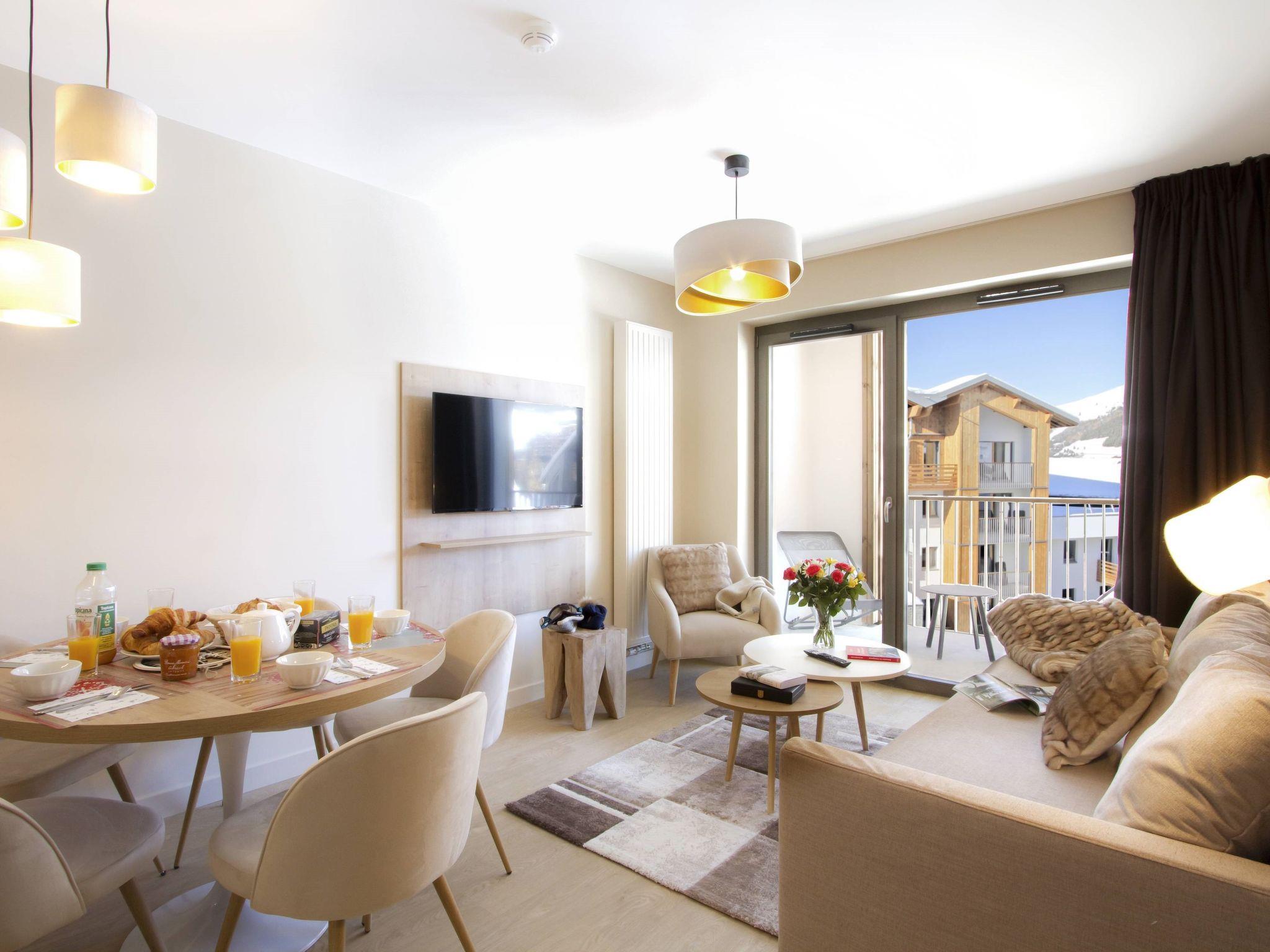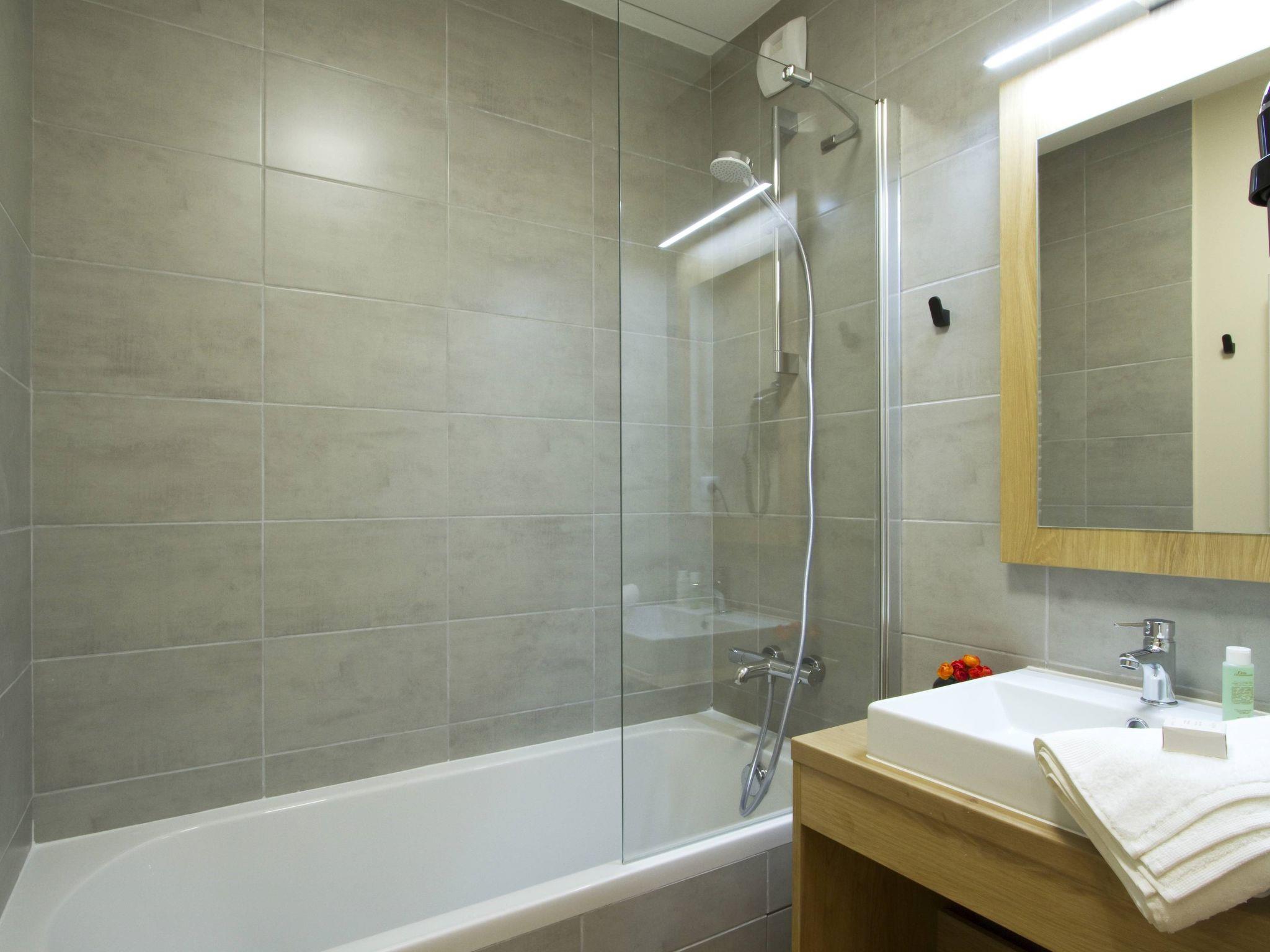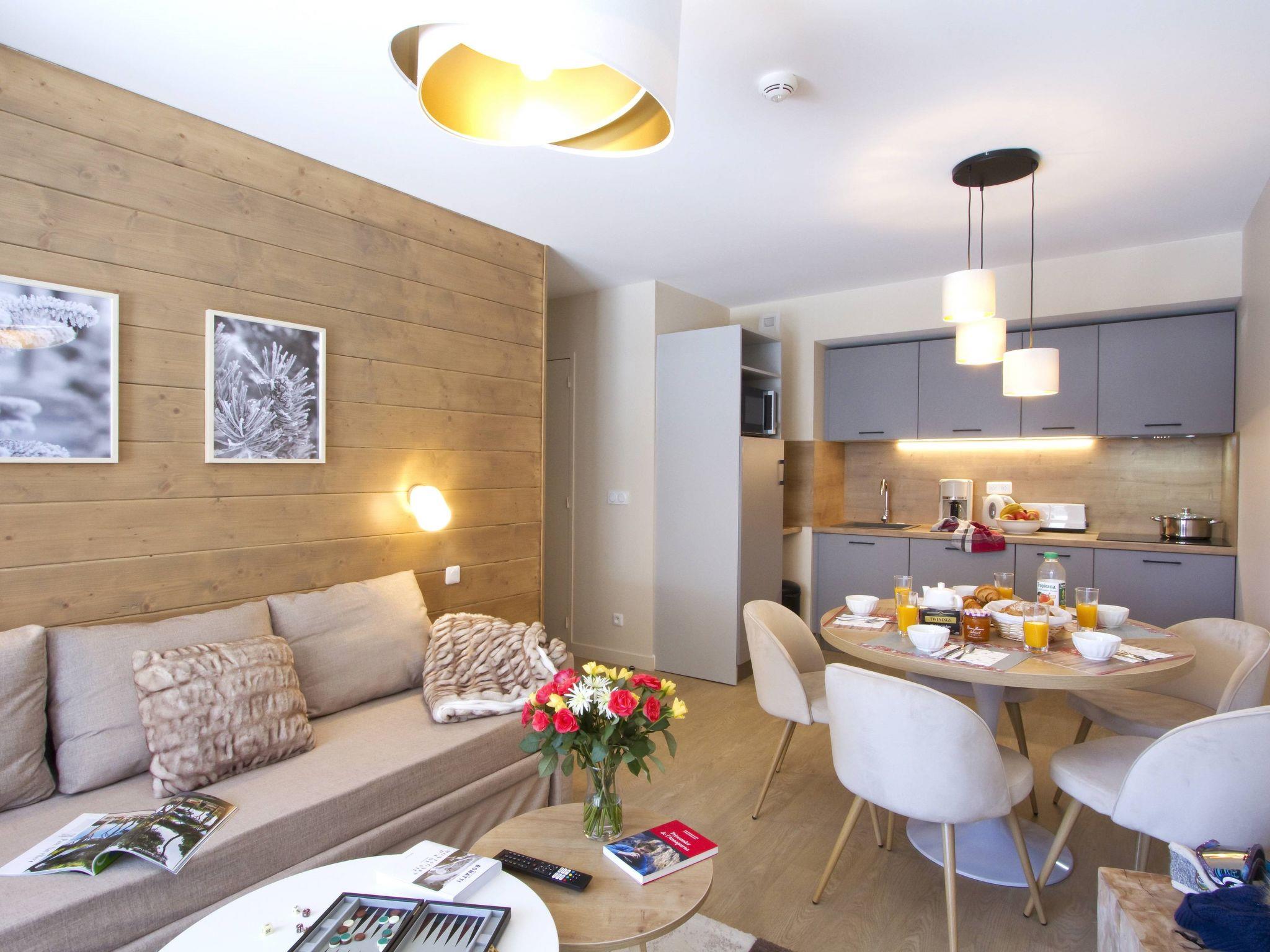 "Résidence Odalys Collection L'Eclose", 2-room apartment 39 m2. Comfortable furnishings: living/sleeping room with 2 sleeping facilities and TV (flat screen). 1 room with 2 sleeping facilities. Sleeping alcove with 2 sleeping facilities. Kitchenette (dishwasher, 2 ceramic glass hob hotplates, toaster, kettle, electric coffee machine, combination microwave). Bathroom, sep. WC. Heating. Balcony. Facilities: hair dryer. Internet (WiFi, free). Parking (extra). Maximum 1 pet/ dog allowed. Instead of an enclosed bedroom, some sleeping areas are located in an open-plan area (gallery, alcove, etc.).
