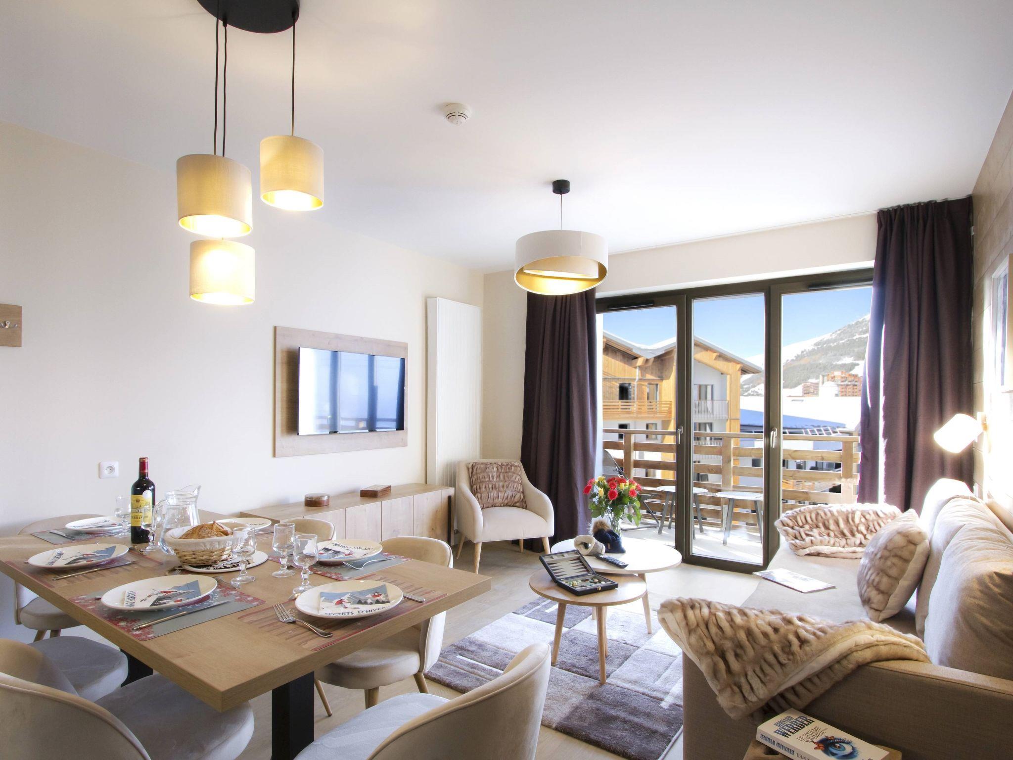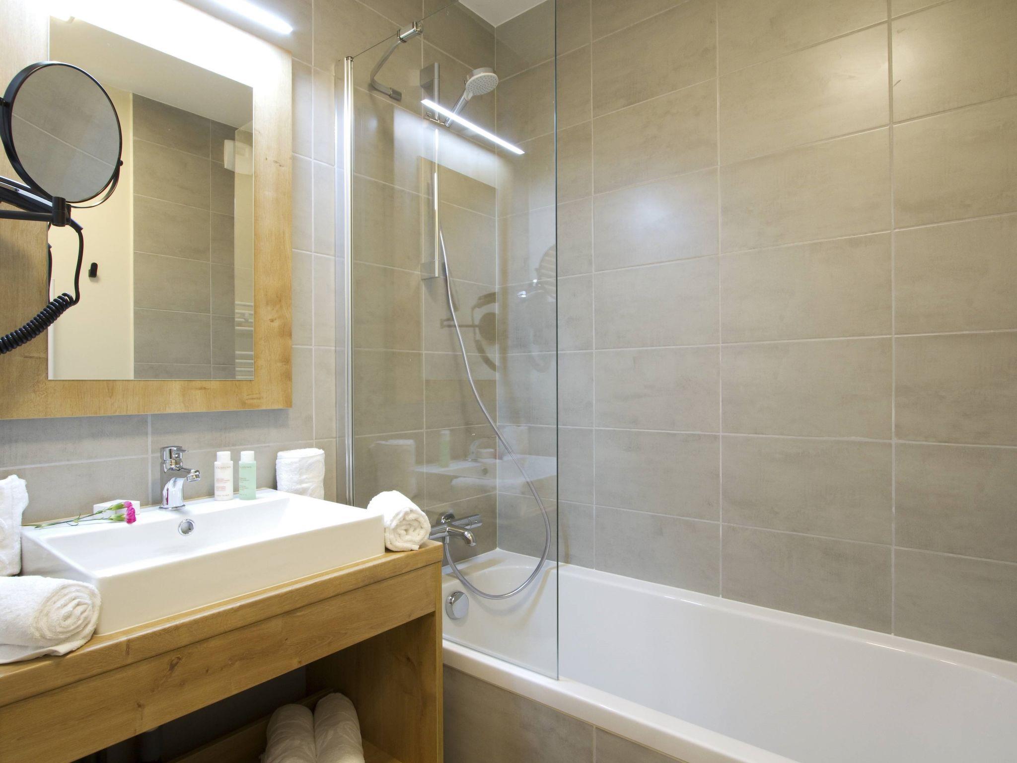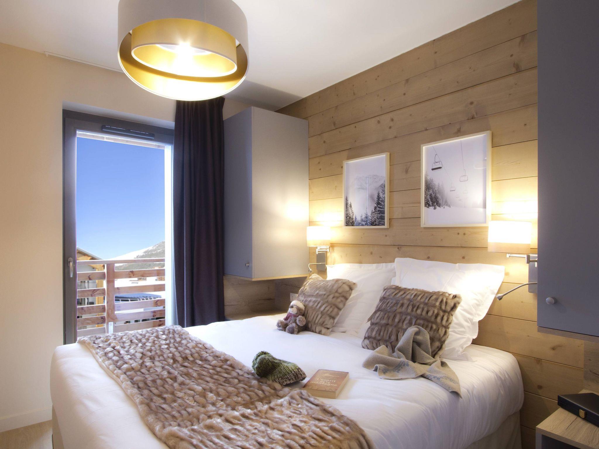 "Résidence Odalys Collection L'Eclose", 2-room apartment 39 m2. Comfortable furnishings: living/sleeping room with 2 sleeping facilities and TV (flat screen). 1 room with 2 sleeping facilities. Sleeping alcove with 2 sleeping facilities. Kitchenette (dishwasher, 2 ceramic glass hob hotplates, toaster, kettle, electric coffee machine, combination microwave). Bathroom, sep. WC. Heating. Balcony. Facilities: hair dryer. Internet (WiFi, free). Parking (extra). Maximum 1 pet/ dog allowed. Instead of an enclosed bedroom, some sleeping areas are located in an open-plan area (gallery, alcove, etc.).