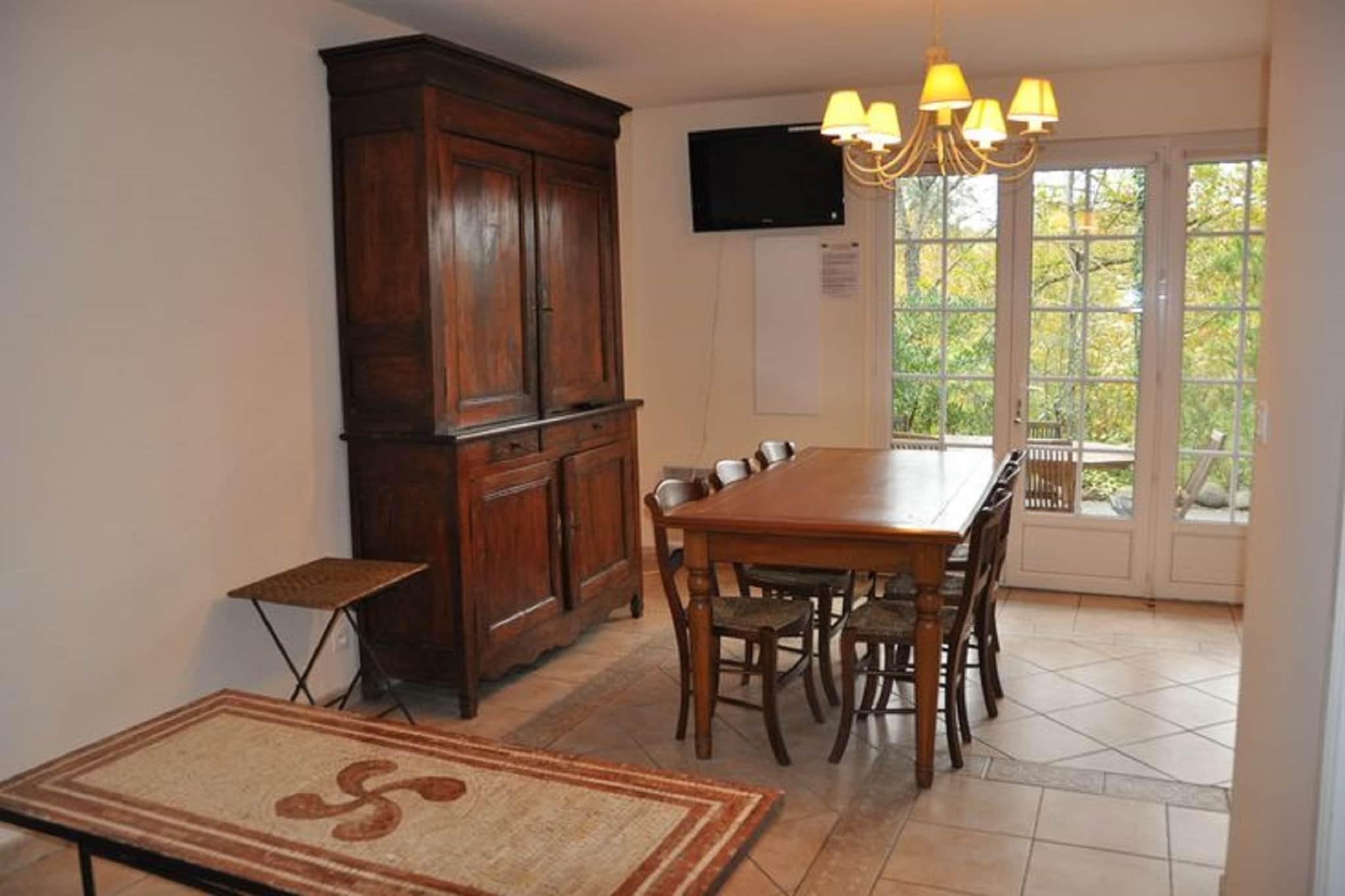 Fredelig baskisk flugt Gemt i det grønne i det franske Baskerland tilbyder dette feriehus i Les Collines Iduki et indbydende ophold for op til seks gæster. Stueetagen indeholder en lys stue med sovesofa og tv, et fuldt udstyret køkken med opvaskemaskine og et badeværelse med bruser. Terrassedøre fører til en møbleret terrasse, perfekt til udendørs måltider. Ovenpå sikrer to soveværelser og et andet badeværelse med badekar komfort for familier eller venner. Kæledyrsvenlige eventyr Tag dine kæledyr med og oplev regionen sammen. Naturskønne stier og bølgende bakker omgiver La Bastide Clairence, hvilket gør daglige gåture til en fornøjelse. Gå en tur langs flodens stier eller gennem det åbne landskab, og stop derefter ved kæledyrsvenlige caféer, hvor din hund kan slutte sig til dig på terrassen. Tilbage i parken giver de rolige havemiljøer et sikkert og fredeligt sted for både kæledyr og ejere at slappe af efter en dag udendørs. Lokal kultur og spisning La Bastide Clairence, der er opført blandt Frankrigs "smukkeste landsbyer", er fuld af charme med baskiske bindingsværkshuse, håndværkerbutikker og livlige markeder. Nyd autentisk baskisk køkken i lokale restauranter eller prøv regionale råvarer til at tilberede i dit eget køkken. Restauranten på stedet tilbyder også bekvem spisning. Til dagsture er de kulturelle byer Bayonne og Biarritz, Atlanterhavskysten og naturskønne bjerglandskaber alle inden for rækkevidde, hvilket blander afslapning med opdagelse.