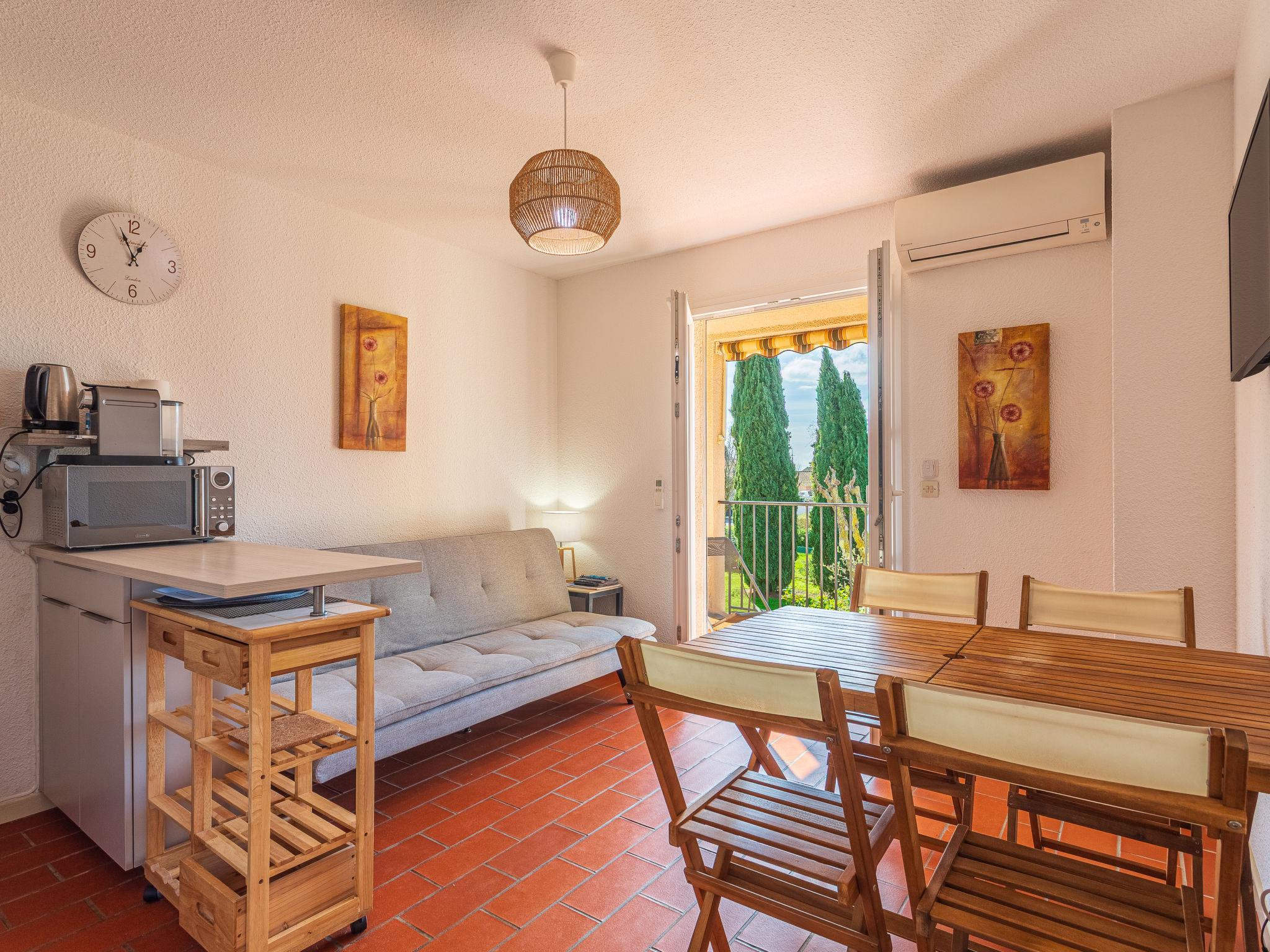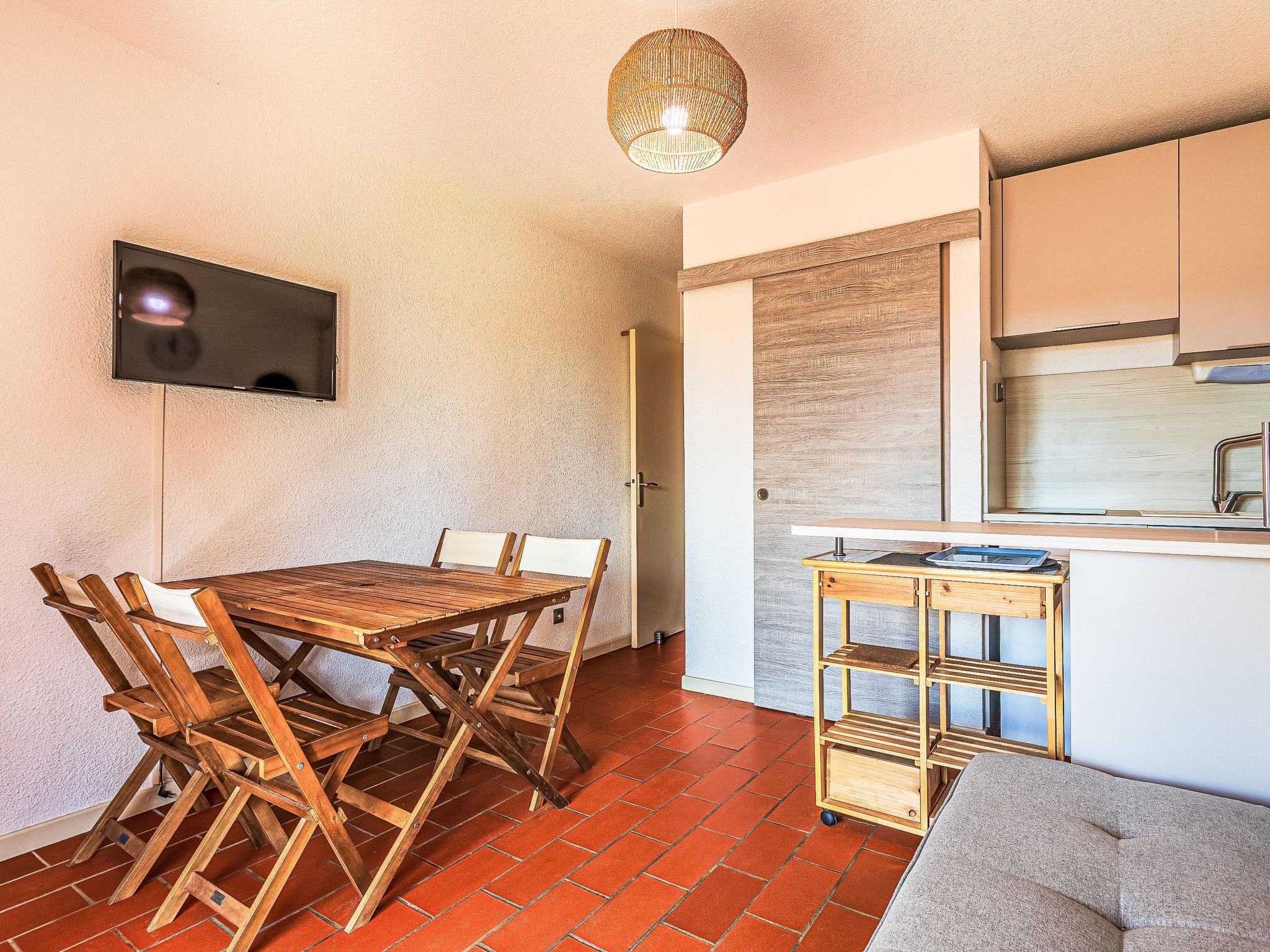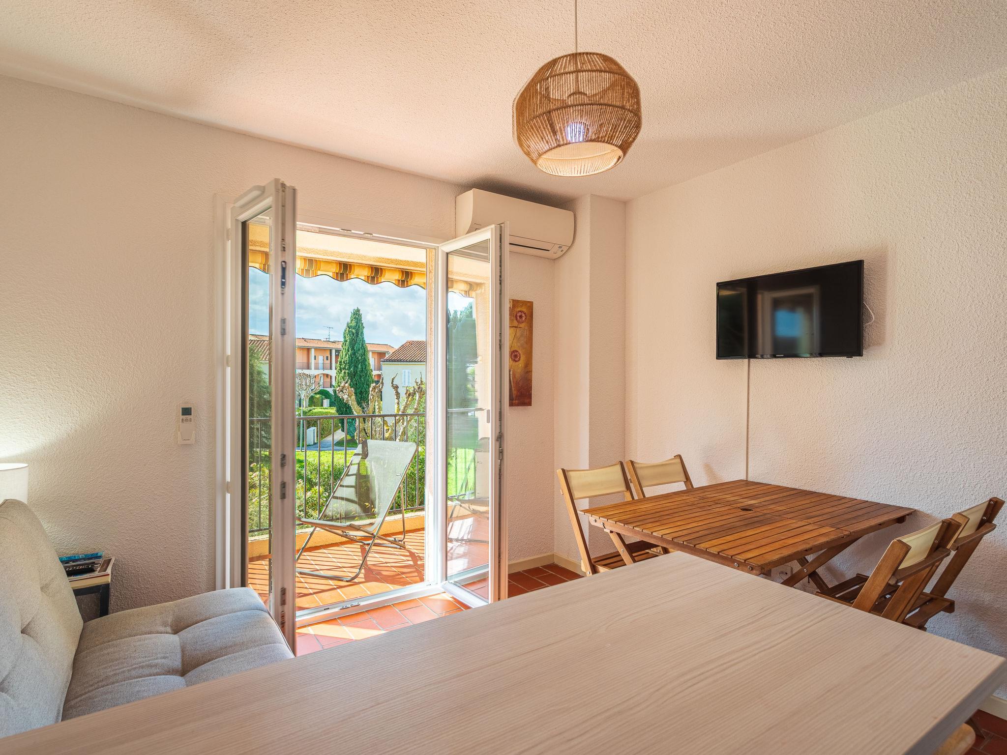 2-room apartment 24 m2 on 1st floor. Bright, comfortable and beautiful furnishings: living/dining room with 1 sofabed (140 cm, length 190 cm), dining table and TV (flat screen), electric heating and air conditioning. Exit to the terrace. 1 room with 1 french bed (140 cm, length 190 cm). Kitchenette (2 induction hot plates, toaster, kettle, microwave, electric coffee machine). Bath/WC. Terrace 6 m2. Terrace furniture. View of the garden. Facilities: washing machine. Internet (WiFi, extra). Parking space n 103. Please note: fridge without freezer. TV only FR. Smoke alarm, no lift. Offer by a private individual according to Art. 155, IV of CGI. 83071000760WO