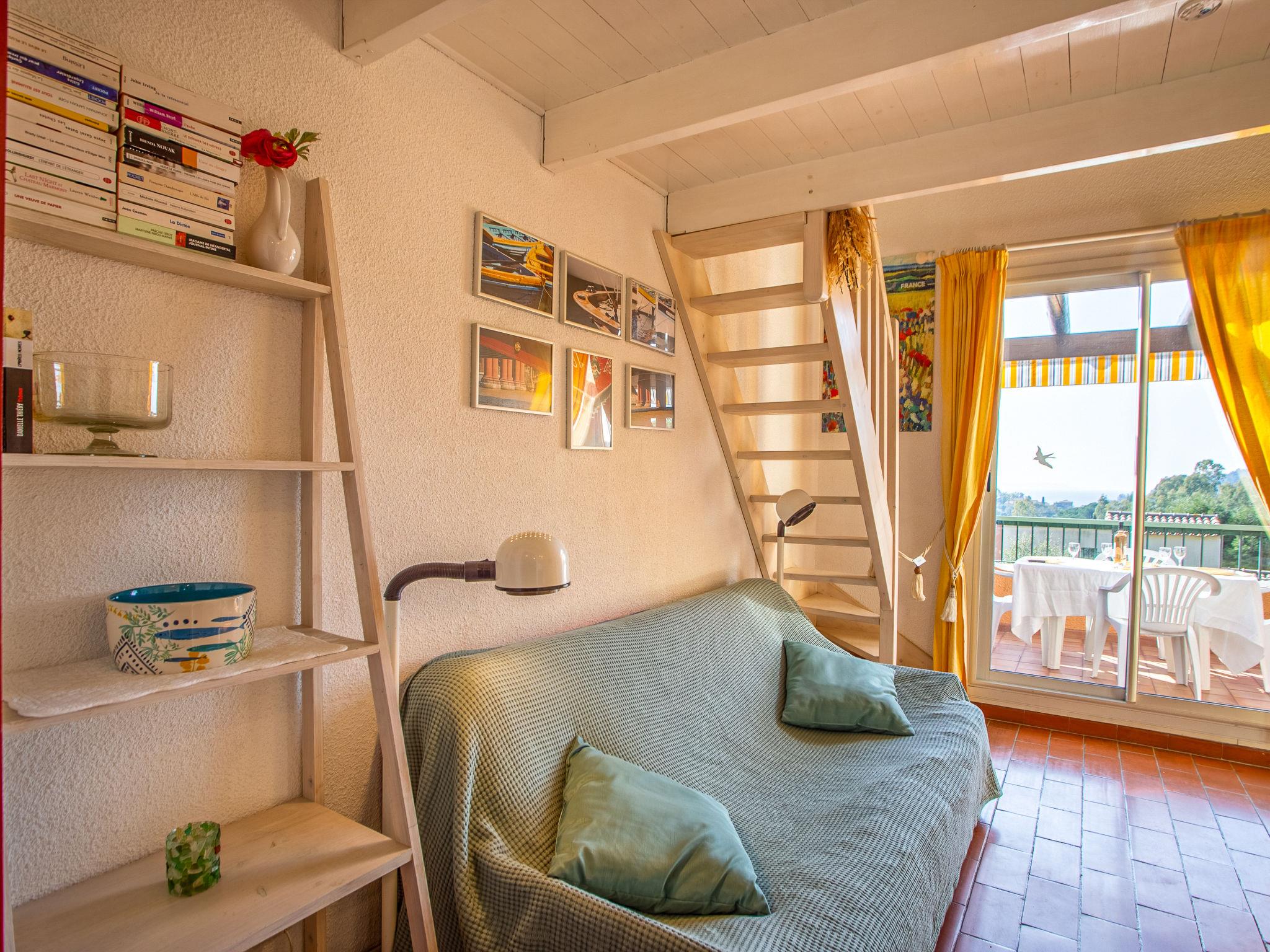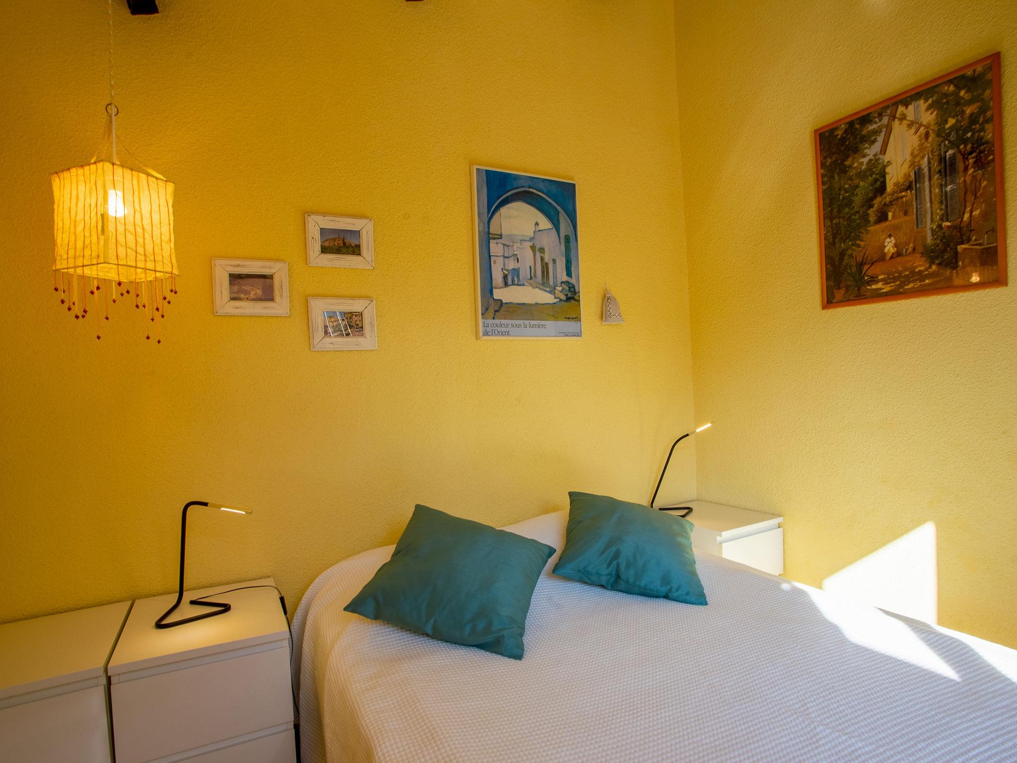 2-room apartment 30 m2 on 1st floor. Living/dining room with 1 double sofabed (135 cm, length 190 cm), dining table and TV (flat screen). Exit to the balcony. 1 room with 1 french bed (140 cm, length 190 cm). Exit to the balcony. Kitchenette (oven, dishwasher, 2 ceramic glass hob hotplates, toaster, kettle, electric coffee machine). Bath/WC. Balcony 6 m2, south facing position. Balcony furniture, deck chairs (1). Distant view of the sea. Facilities: iron, hair dryer. Internet (WiFi, extra). Parking space n H70. Please note: TV only FR. Smoke alarm. 83070 000090 92