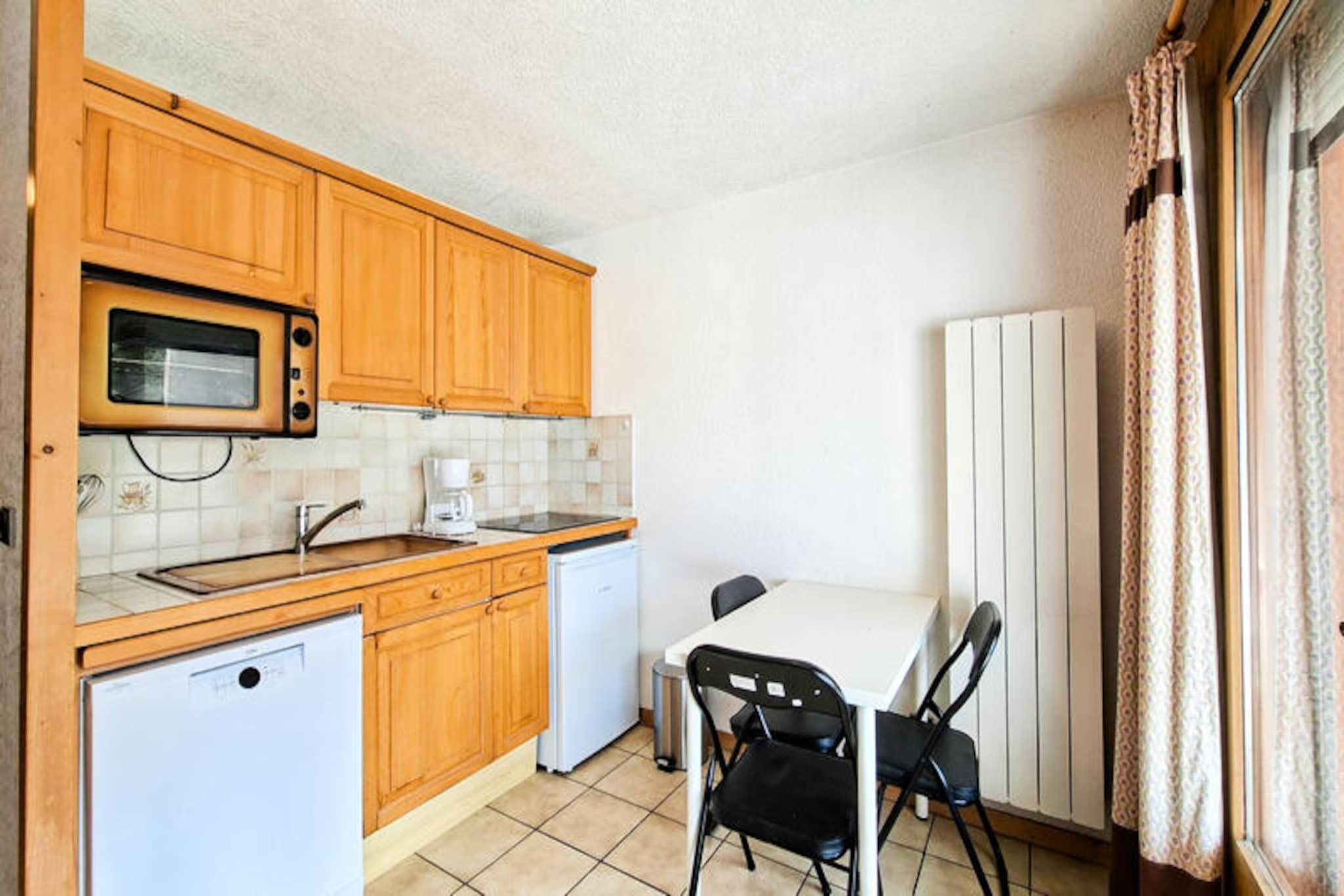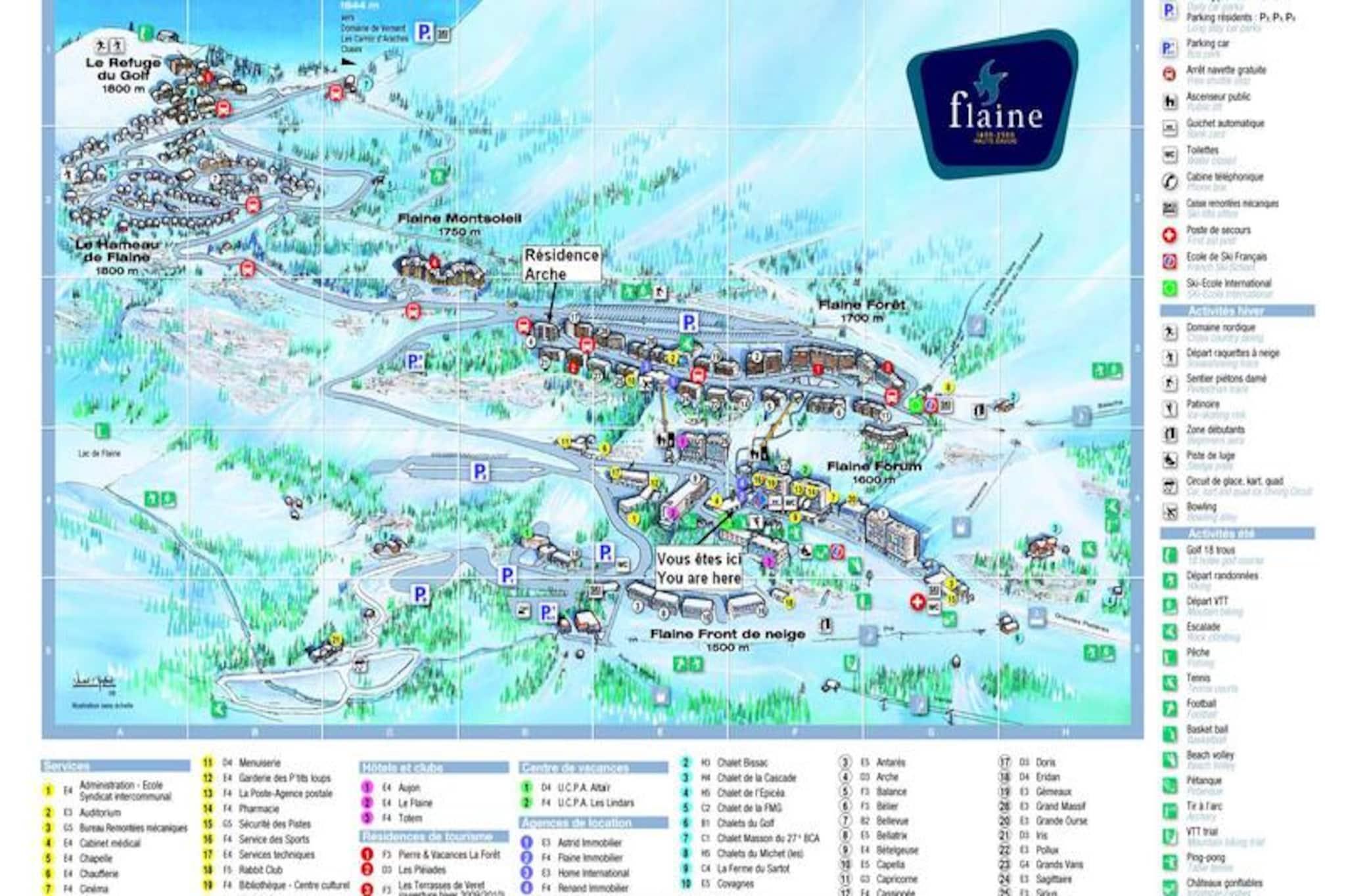 I det fredfyldte Flaine Forêt-distrikt inviterer dette charmerende studie med en komforthytte dig til at opleve det bedste af alpint liv. Kun 200 meter fra Gérats-stoleliften og 500 meter fra pisterne tilbyder det nem adgang til det berømte skiområde Grand Massif. Det nærliggende skibusstoppested, kun 50 meter væk, sikrer problemfri forbindelse, mens de omkringliggende butikker kun ligger en kort gåtur fra din dør. Uanset om du er her for vintersport eller sommereventyr, placerer denne bolig dig i hjertet af det hele. \n\nStudioet, der ligger i den hævede stueetage, har en rummelig sydvendt terrasse med en betagende udsigt over de snedækkede tinder og frodige dale. Designet til op til fire gæster, indeholder det en hyggelig hytte med en dobbeltseng og en stue med en komfortabel dobbeltsovesofa. Tekøkkenet er fuldt udstyret med elektrisk kogeplade, ovn, mikrobølgeovn og opvaskemaskine, hvilket gør det perfekt til at tilberede måltider efter en dag med udforskning. Moderne bekvemmeligheder som et fladskærms-tv og et skiskab bidrager til bekvemmeligheden, mens det flisebelagte gulv og det lyse interiør skaber en indbydende atmosfære. \n\nFlaine handler ikke kun om skiløb; om sommeren kan gæster, der bor seks nætter eller mere, nyde den eksklusive \