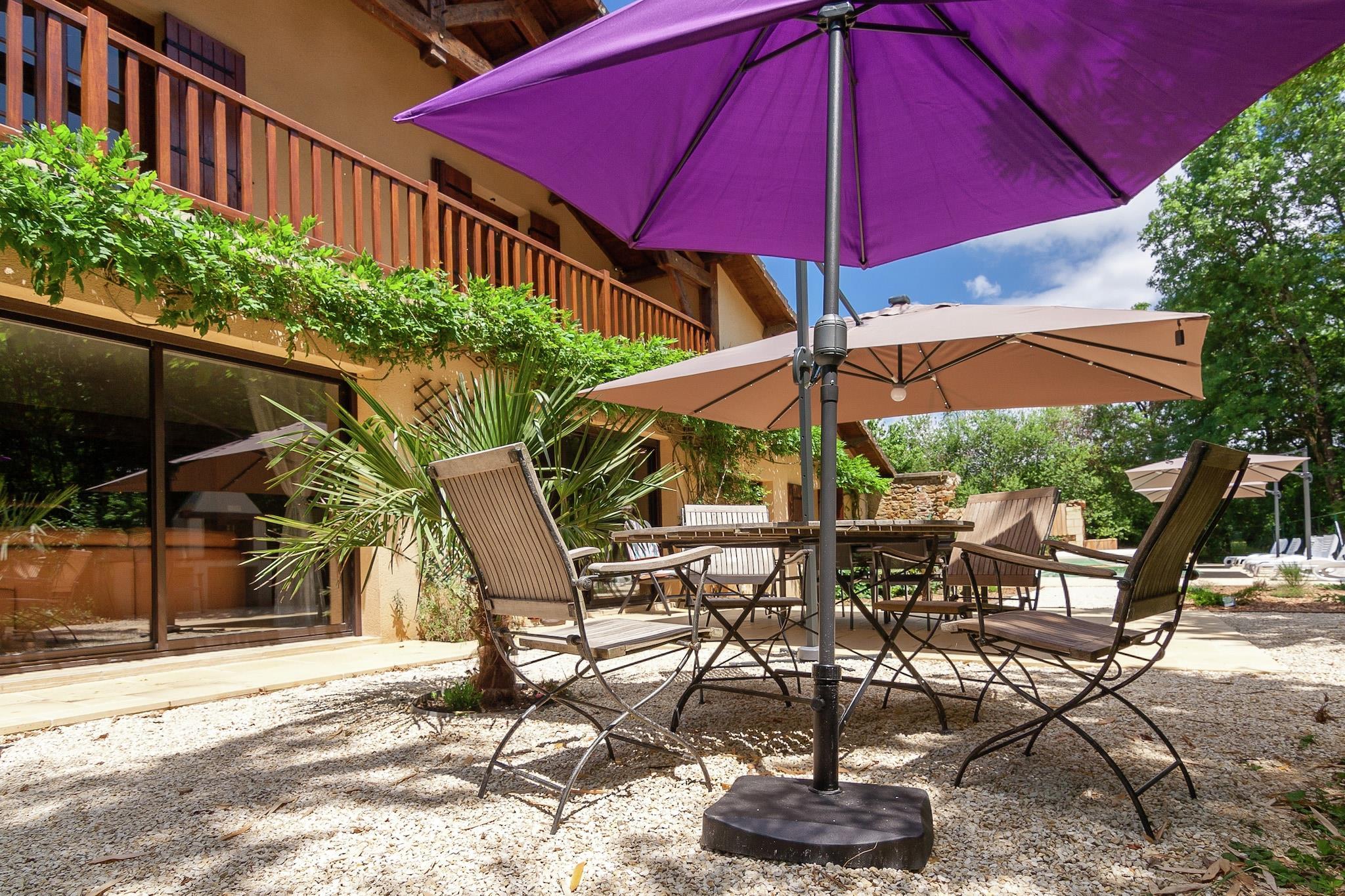 Dette rummelige feriehus i Nantheuil, Dordogne, er et fredeligt landligt tilflugtssted, ideelt for op til 12 gæster. Stueetagen byder dig velkommen med to hyggelige stuer/spisestuer - hver udstyret med fladskærms-tv med hollandske og internationale kanaler - og en pejs til hyggelige aftener. Det fuldt udstyrede køkken inkluderer et induktionskomfur med 4 ringe, espresso- og filterkaffemaskine, ovn, mikrobølgeovn, opvaskemaskine og køleskab med fryser. Der er også et vaskerum med tørretumbler og vaskemaskine samt et separat toilet for nemheds skyld. Ovenpå er der fem veludstyrede soveværelser, der giver fleksibilitet til familier eller grupper, med mulighed for to enkeltsenge eller dobbeltsenge, køjesenge og syntetiske dyner for komfort. To badeværelser betjener denne etage - det ene med bruser og dobbelte håndvaske, det andet med badekar - og et ekstra toilet. Babyudstyr som en barneseng, højstol og børneseng er inkluderet. Varme og gratis Wi-Fi gør det til et hyggeligt og forbundet ophold året rundt. Udendørs strækker den private, indhegnede have sig over 1000 m² og omfatter en swimmingpool (åben april-oktober), petanquebane, trampolin, rutsjebane, bordtennis, grill og liggestole. Kun 2 km fra Thiviers med forsyninger, restauranter og transport, er det også tæt på floder, skove, golf og ridning - perfekt til at udforske Dordognes natur- og kulturskatte med dine kære, og poolen er ikke opvarmet.