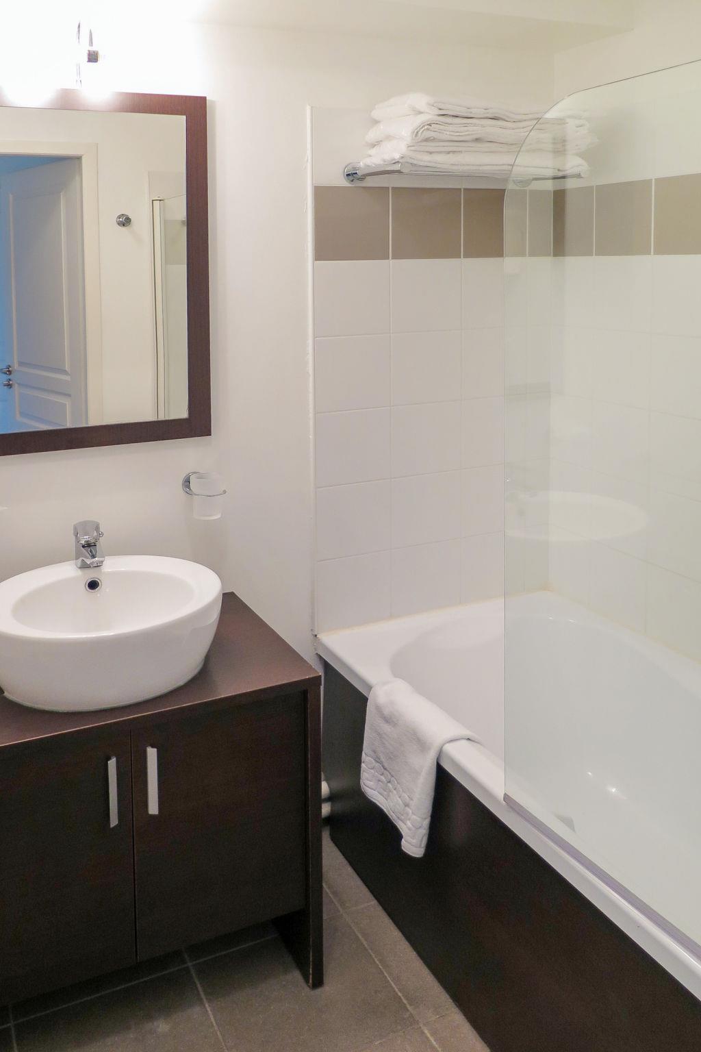 "Les Cottages du Lac M4 Privilège", 4-room chalet 53 m2. Bright, cosy furnishings: living/dining room with dining table and satellite TV (flat screen). Exit to the terrace. 1 room with 1 french bed (140 cm, length 190 cm), shower. 1 room with 2 beds (80 cm, length 190 cm). 1 room with 1 x 2 bunk beds (80 cm, length 180 cm). Open kitchen (dishwasher, 4 ceramic glass hob hotplates, toaster, kettle, microwave, electric coffee machine, Capsules for coffee machine (Nespresso) extra). Bathroom, sep. WC. Electric heating. Terrace roofed. Terrace furniture, deck chairs (2). Facilities: children's high chair, baby cot (extra). Internet (WiFi, free). Please note: non-smokers only. Maximum 1 pet/ dog allowed. Smoke alarm, fire extinguisher.