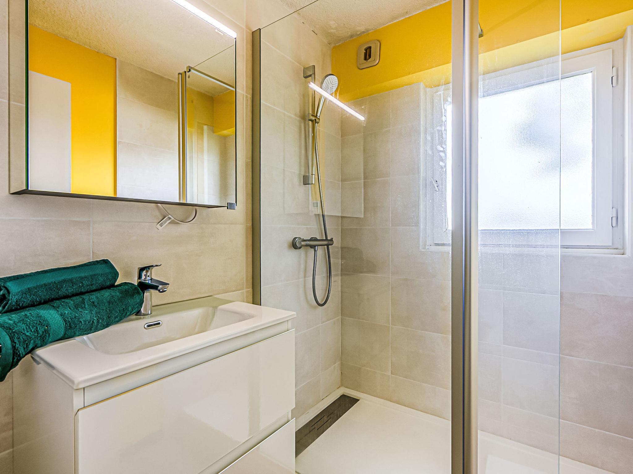 2-room apartment 34 m2 on 1st floor, south-east facing position. Living/dining room with 1 double sofabed and TV (flat screen). Exit to the balcony. 1 room with 2 beds (80 cm). Kitchenette (4 hot plates, mini-oven, microwave). Bathroom, sep. WC. Electric heating. Facilities: Internet (WiFi, extra). Please note: 1 small pet/ dog allowed. TV only FR. Smoke alarm. 56186 000605 YS