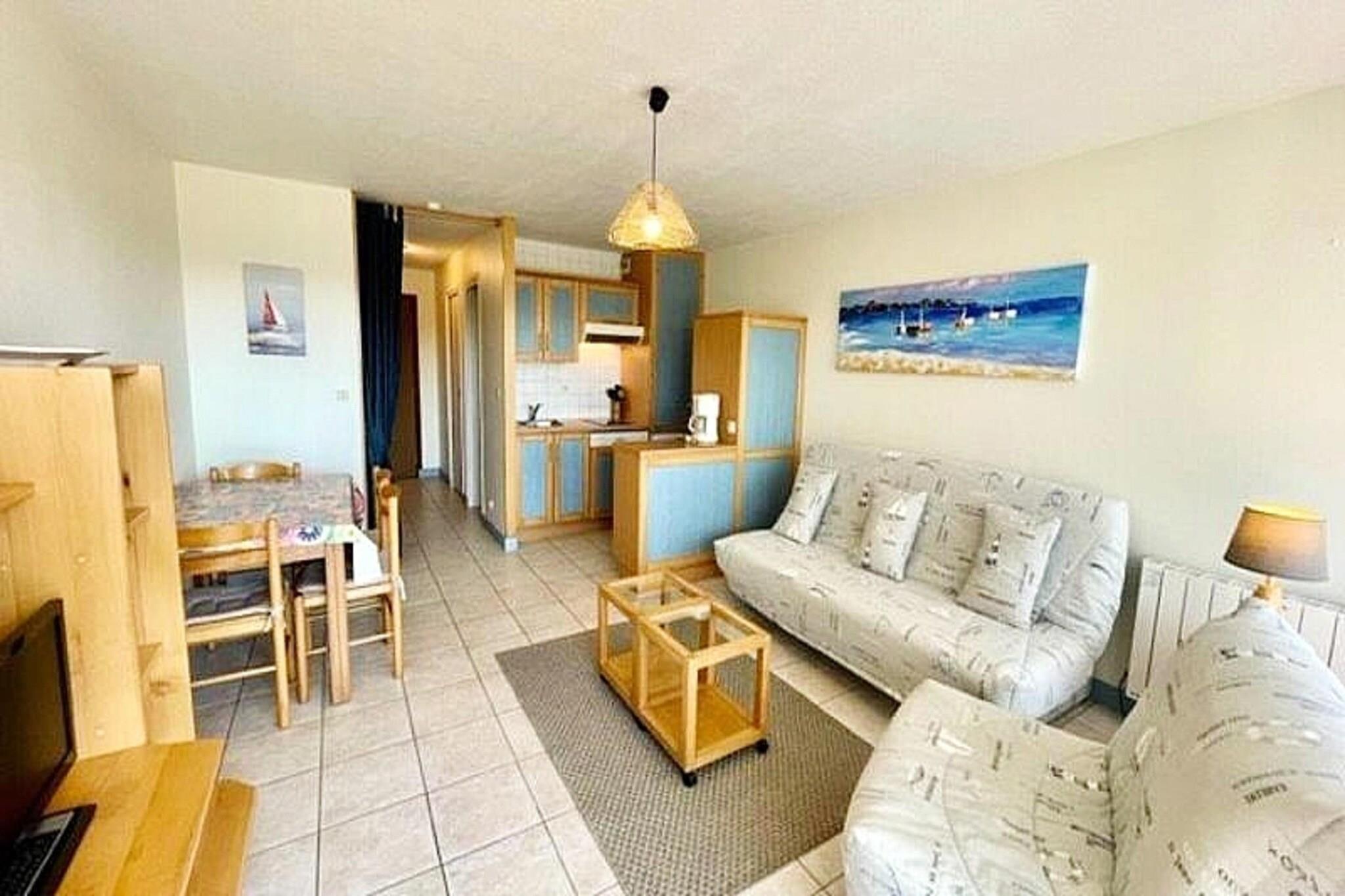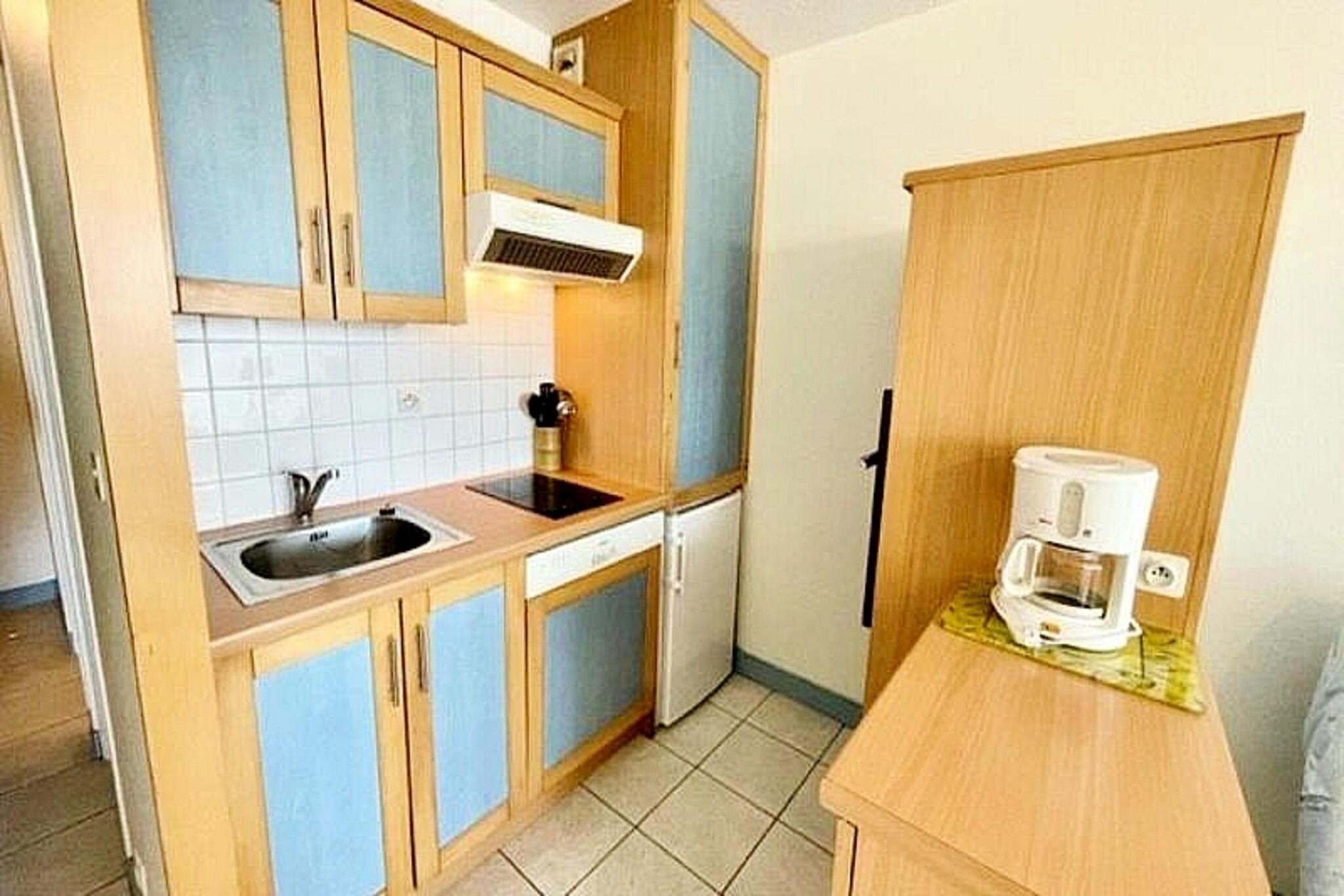This charming studio, ideal for up to 4 guests, offers a cozy and functional living space. It features an entrance with a 2x90cm bunk bed, a comfortable living room with a 140cm sofa bed and TV. The property is not pet-friendly, ensuring a peaceful atmosphere. Guests can enjoy the south-west facing loggia, complete with garden furniture for relaxing outdoors. There is no parking available, but a bicycle room and cellar (No. 3) are provided for added convenience. Located just a short distance from Porigo beach and the Sailing School, the studio is perfectly positioned for beachgoers and water sports enthusiasts. Nearby, you’ll find cafes, shops, and local markets, where you can discover fresh regional produce and enjoy the charming atmosphere of Quiberon. Whether you want to relax by the sea or explore the surrounding area, this location offers plenty of activities. The studio features a well-equipped kitchen with a dishwasher, oven, microwave, and a 2-burner ceramic hob, making it easy to prepare meals. The bathroom and separate WC provide added comfort. Heating and energy costs are included in the weekly rate, and optional services such as end-of-stay cleaning and linen rental are available for a hassle-free experience.
