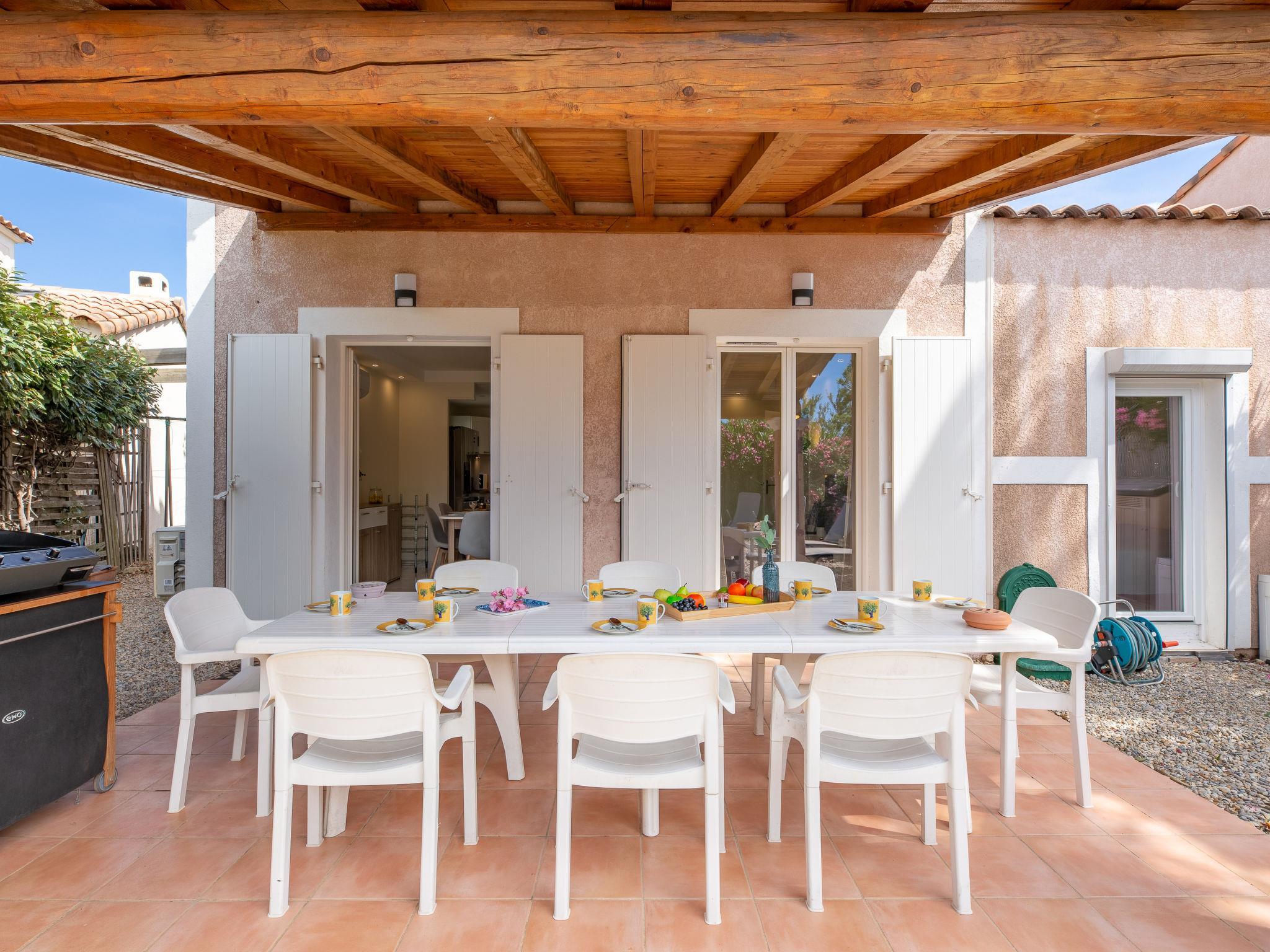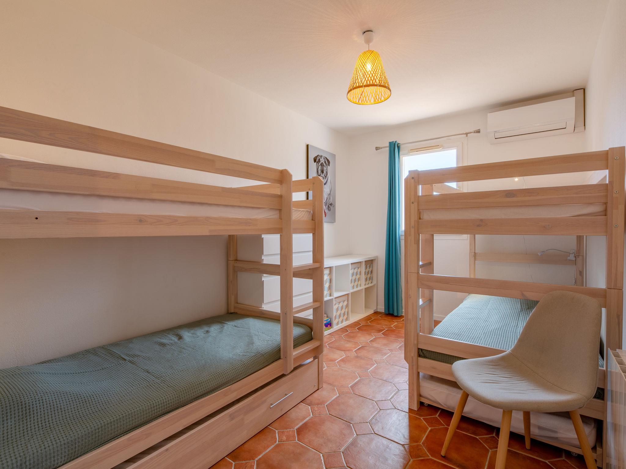 4-room terraced house 75 m2 on 2 levels. Renovated in 2023, modern furnishings: living/dining room with TV (flat screen), DVD and air conditioning. Exit to the terrace, to the patio. 1 room with Dressing room with 1 french bed (1 x 160 cm, length 200 cm), air conditioning. Exit to the terrace. Open kitchen (oven, dishwasher, 4 induction hot plates, toaster, kettle, microwave, freezer, electric coffee machine, Capsules for coffee machine (Nespresso) extra). Shower, sep. WC. Electric heating. Upper floor: 1 room with Dressing room with 1 french bed (1 x 160 cm, length 190 cm), air conditioning. 1 room with 2 x 1 bunk beds (90 cm, length 190 cm), air conditioning. Bathroom, sep. WC. Electric heating. Large terrace partly roofed, south facing position, patio, south facing position. Terrace furniture, deck chairs (4). Facilities: washing machine, iron, hair dryer. Internet (WiFi, free). Parking space n 17. Please note: suitable for families. Smoke alarm. Offer by a private individual according to Art. 155, IV of CGI. 83107000787PH