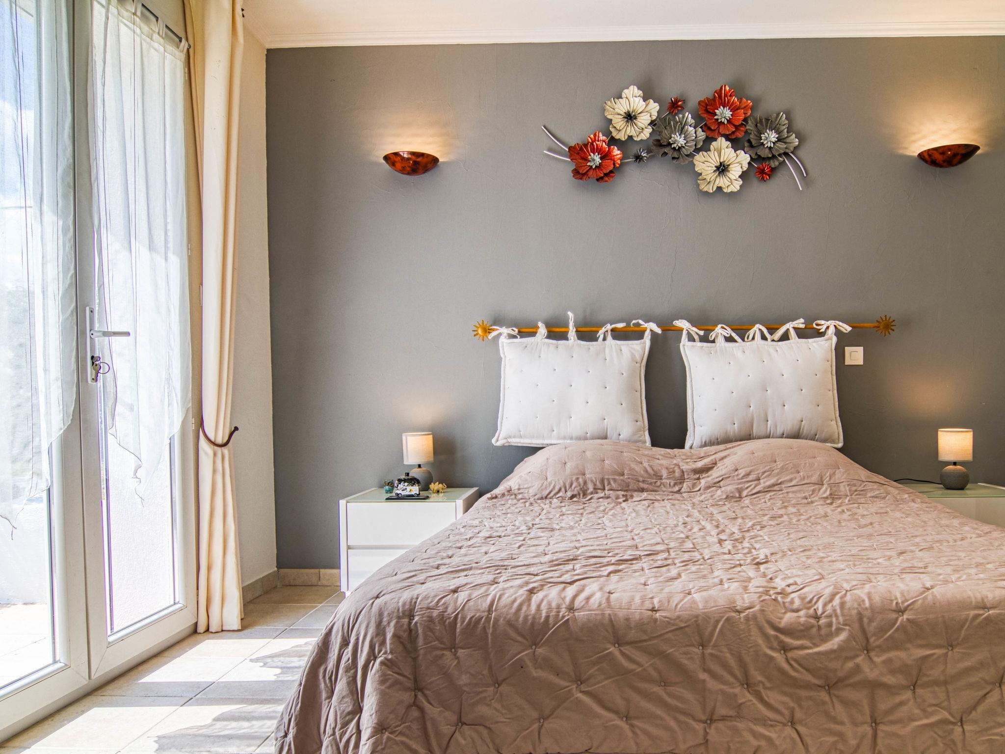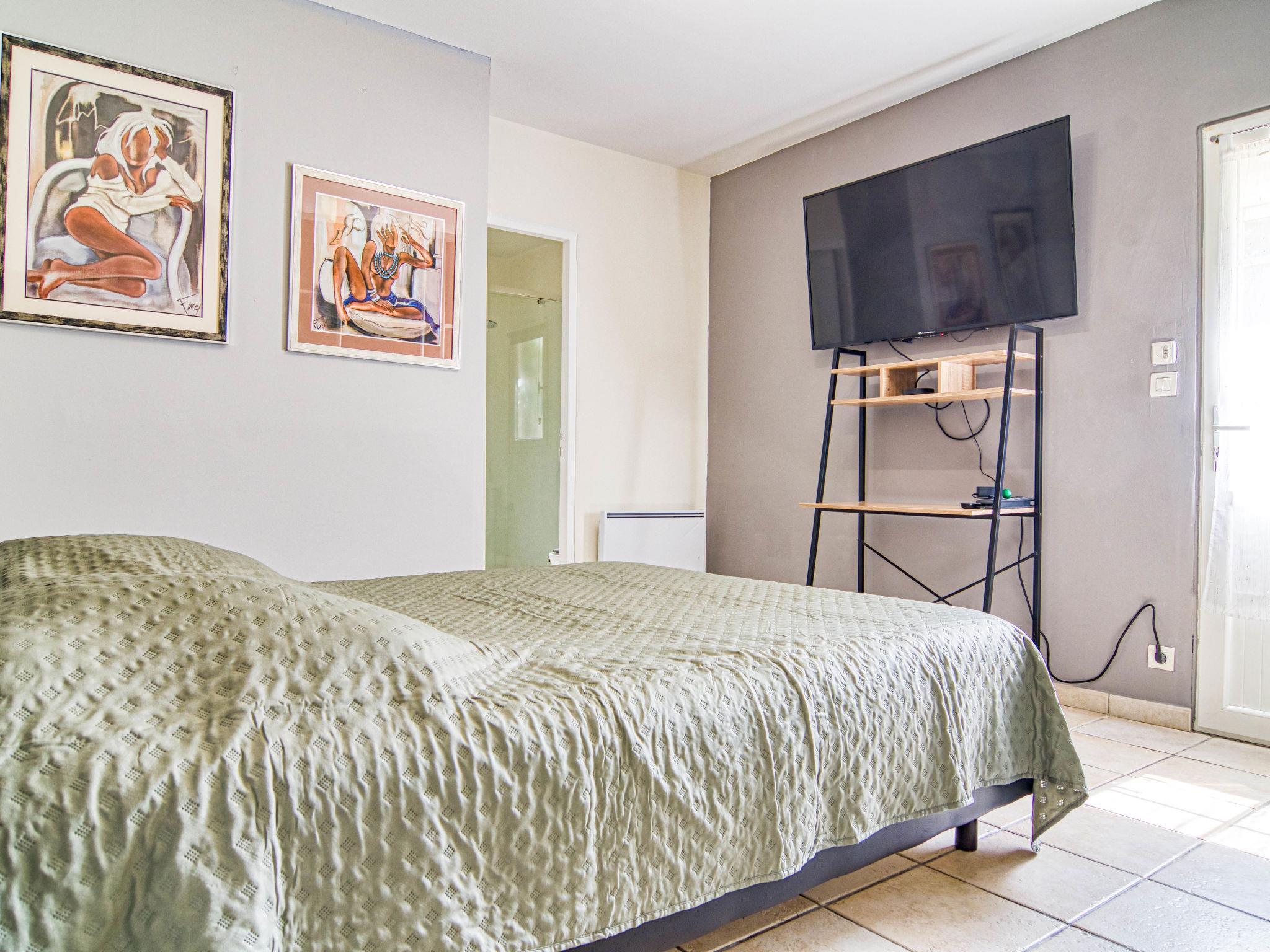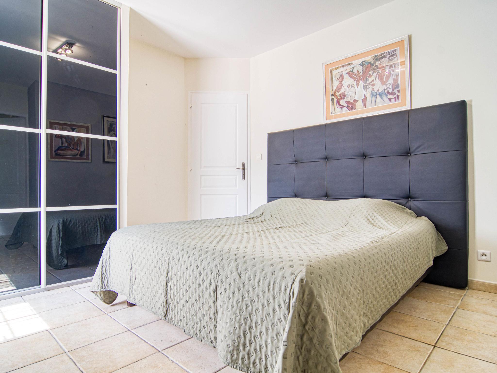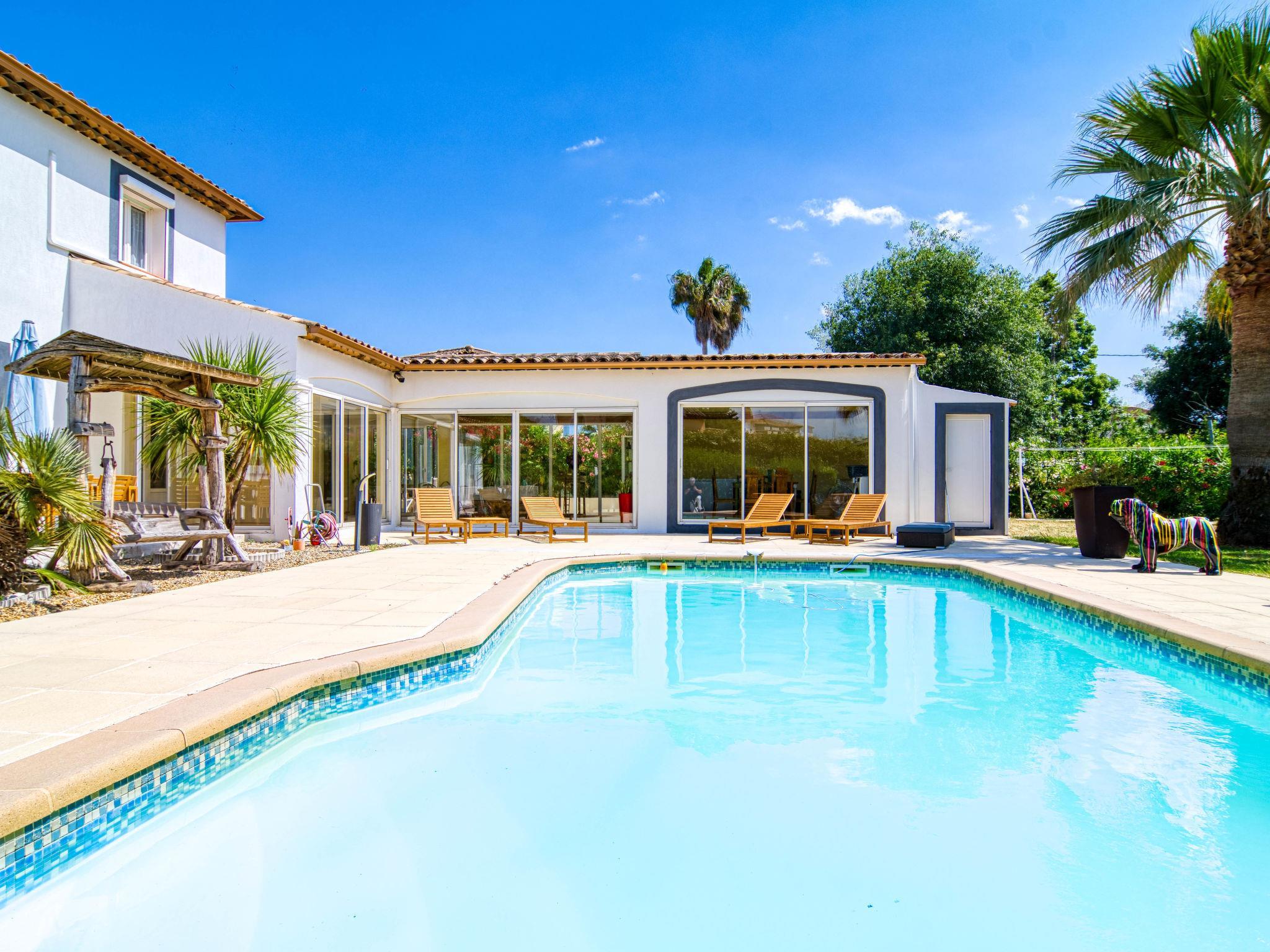 "Villa Les Oliviers", 5-room villa 200 m2 on 2 levels. Comfortable and beautiful furnishings: large living/dining room with dining table and TV (flat screen), air conditioning and electric shutters. Exit to the terrace. 1 room with 1 french bed (160 cm, length 200 cm), separate WC and TV (flat screen), air conditioning and electric shutters. Exit to the garden. 1 room with 2 beds (90 cm, length 190 cm), shower, hip bath and TV (flat screen), air conditioning and electric shutters. Exit to the swimming pool. Open kitchen (oven, dishwasher, 3 induction hot plates, toaster, kettle, microwave, freezer, electric coffee machine) with bar. Exit to the veranda. Sep. WC. Upper floor: 2 rooms, each room with 1 french bed (140 cm, length 190 cm), shower and TV (flat screen), air conditioning and electric shutters. Sep. WC. Terrace furniture, barbecue (portable), deck chairs (4), conservatory. Facilities: washing machine, safe, iron, children's high chair, baby cot for up to 3 year olds, hair dryer. Internet (WiFi, free). Please note: non-smoking house. Maximum 1 pet/ dog allowed. Smoke alarm. Offer by a private individual according to Art. 155, IV of CGI. 83107002402C0