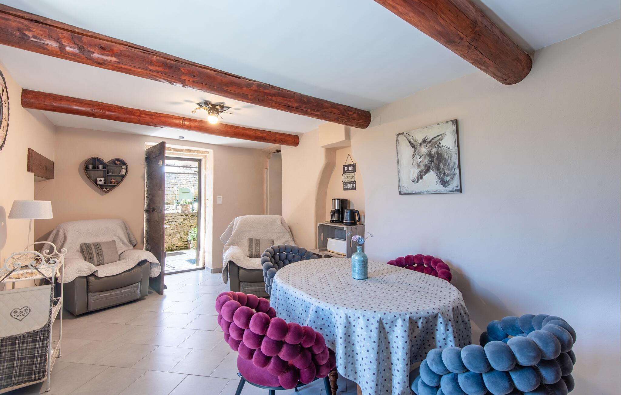 Dette indbydende fristed tilbyder friluftsmennesker en skøn oase til at sætte hverdagen på pause og nyde fredfyldte dage i naturskønne omgivelser. Tilbered enkle måltider i det praktiske køkken, planlæg jeres aktiviteter ved spisebordet, og afsæt tid til familien efter en aktiv dag med en hyggelig spilleaften.