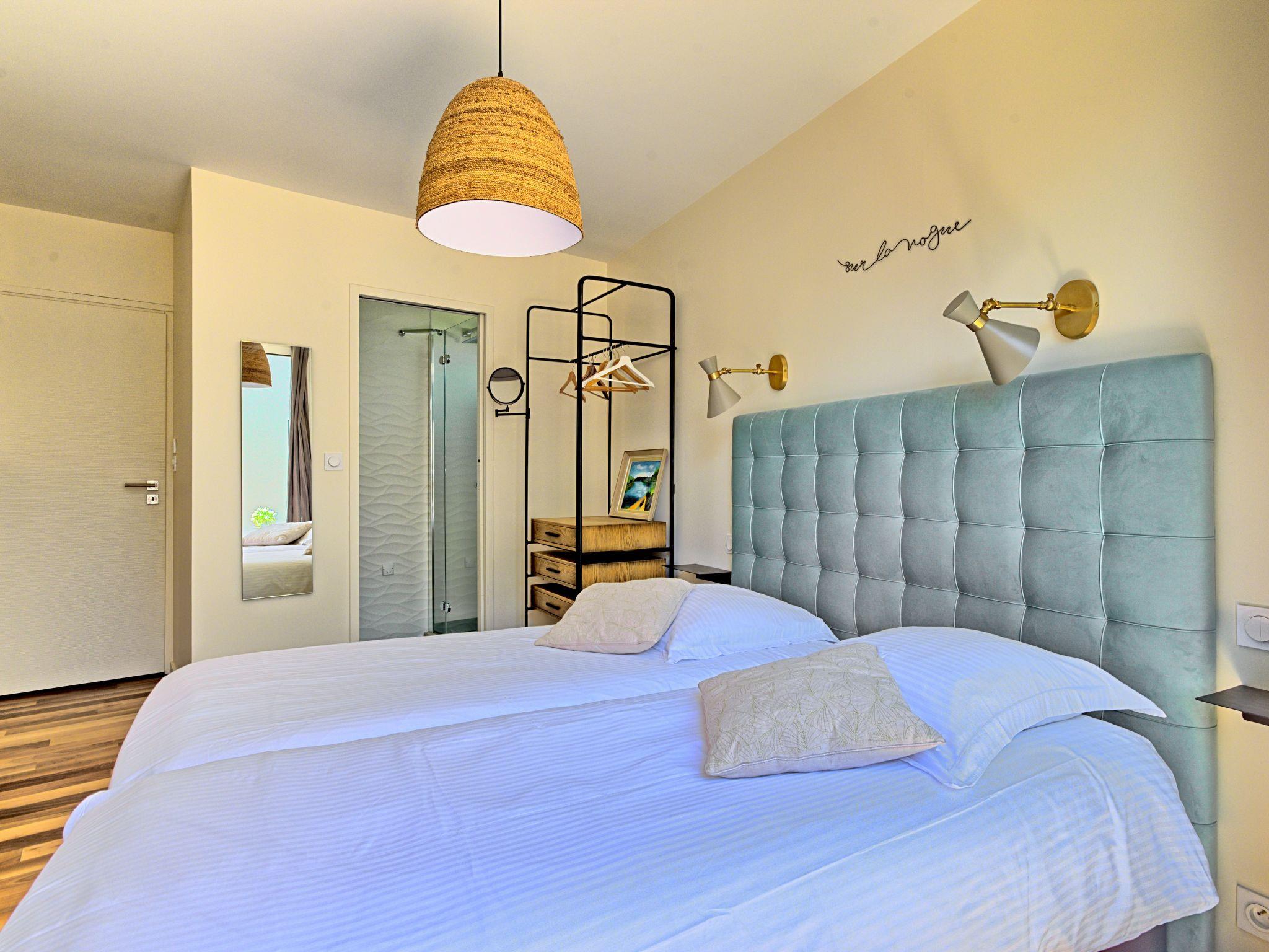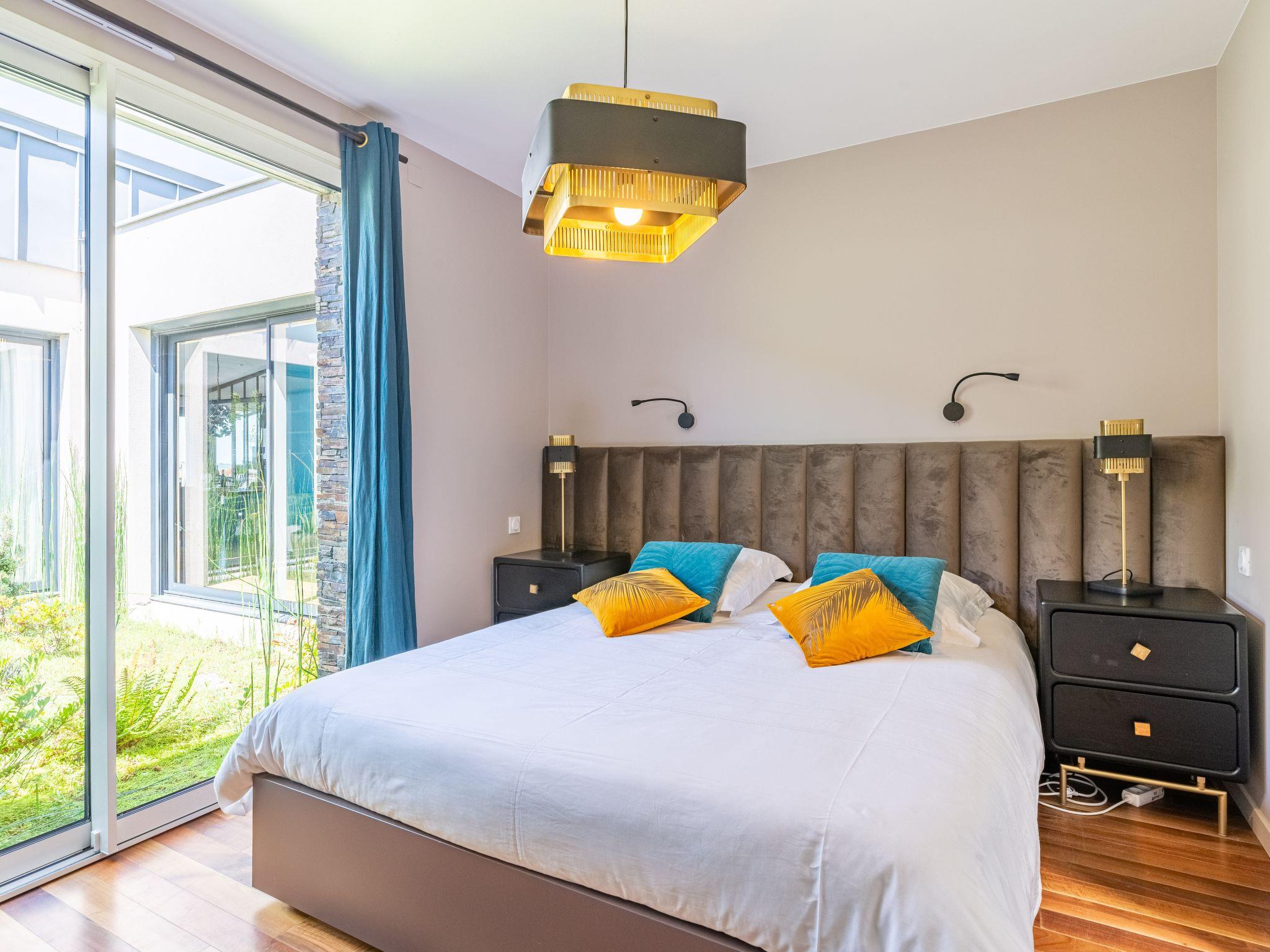 Beautiful house "Indigo-Vue Mer et Piscine chauffée", built in 2018. 1.6 km from the centre of Saint-Brévin-les-Pins, 800 m from the centre of Saint-Brevin-l'Océan, 14 km from the centre of Saint-Nazaire, in the residential district, excellent location: right in the centre but still quiet, 100 m from the sea, 100 m from the beach, in a cul-de-sac. Private: property 790 m2 (fenced) with wildlife garden, swimming pool heated (8 x 3 m, depth 150 cm, seasonal availability: 10.May. - 04.Oct.) with shutter cover. Storeroom available. Parking (for 2 cars) on the premises, single garage. Supermarket 800 m, bus stop 1.6 km, sandy beach "Plage de l'Océan" 400 m. Nearby attractions: Pornic 17 km, Pornichet-La Baule 24 km, Parc régional naturel de Brière 25 km. The owner does not accept any groups.