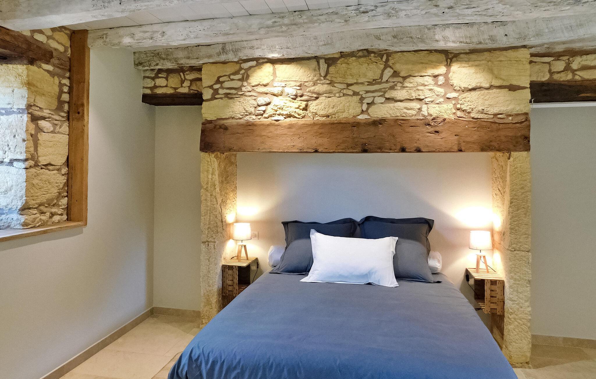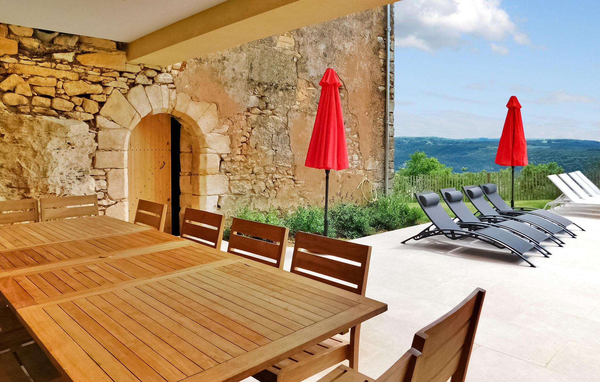 Stenhuset i Dordogne er et charmerende feriested. Nyligt renoveret, det udstråler en rustik charme med synlige bjælker, stenvægge og flisegulve, hvilket giver en naturskøn udsigt over landskabet. Huset byder på god plads med to soveværelser i stueetagen og et tilstødende brusebad. Stueetagen har yderligere en rummelig stue med synlige bjælker, møbleret med komfortable sofaer. En åben stenpejs tilføjer karakter til rummet. Det åbne køkken byder på moderne bekvemmeligheder og en smuk udsigt over dalen og swimmingpoolen. Ovenpå er der yderligere to soveværelser. Ejendommen ligger på en ejendom i bjergskråningerne i landsbyen Castels og Bézenac med en privat opvarmet 8m x 4m swimmingpool, poolterrasse med liggestole og et overdækket poolhus. Nøglefaciliteter inkluderer aircondition i de to soveværelser på første sal og stuen, sammen med gulvvarme i vintermånederne. Derudover har ejendomsejeren en anden feriebolig i nærheden uden et hegn, hvilket sikrer privatlivets fred for både lejemål med separat adgang og parkering. Huset er beliggende på en ejendom på 12 hektar, skove og enge, områder til gåture og byder på en fantastisk udsigt over Dordogne-dalen.