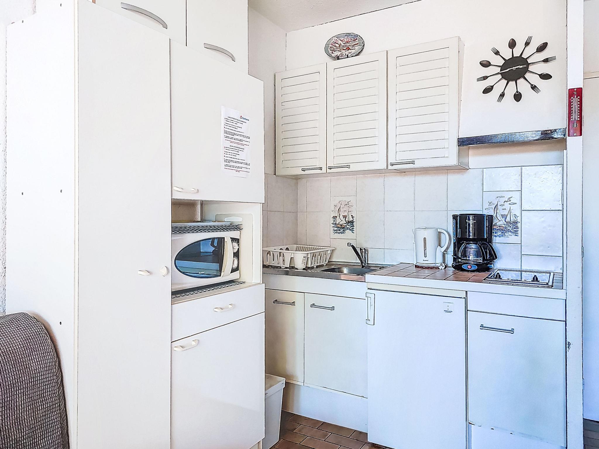 1-room studio 22 m2 on 1st floor. Entrance hall with 1 x 2 bunk beds (80 cm, length 190 cm). Living/dining room with 1 double sofabed (140 cm, length 200 cm), TV. Exit to the terrace. Kitchenette (2 ceramic glass hob hotplates, toaster, kettle, microwave, electric coffee machine). Shower/WC. Electric heating. Terrace 8 m2, roofed, south-east facing position. Terrace furniture. Partial view of the sea. Facilities: washing machine. Internet (WiFi, extra). Parking space n 106. Please note: smoke alarm. 83112000449FI