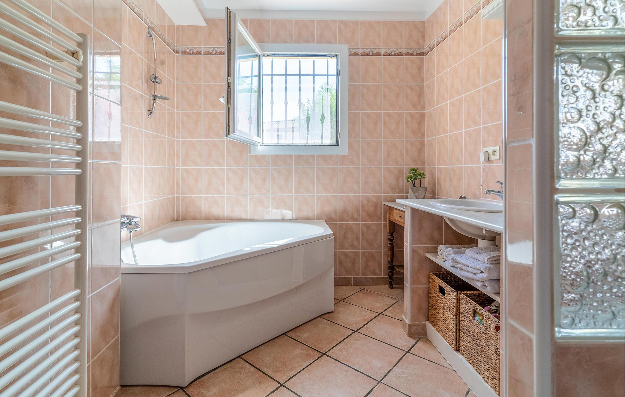 Velkommen til dette rummelige feriehus, som giver jer et komfortabelt hjem og en ideel base for en uforglemmelig ferie, ikke langt fra Middelhavets sandstrande. Eksperimentér med provencalske krydderurter i det lyse køkken, planlæg jeres aktiviteter over hyggelige måltider i den hyggelige opholdsstue, og synk ned i de komfortable sofaer med en bog efter en lang dag.