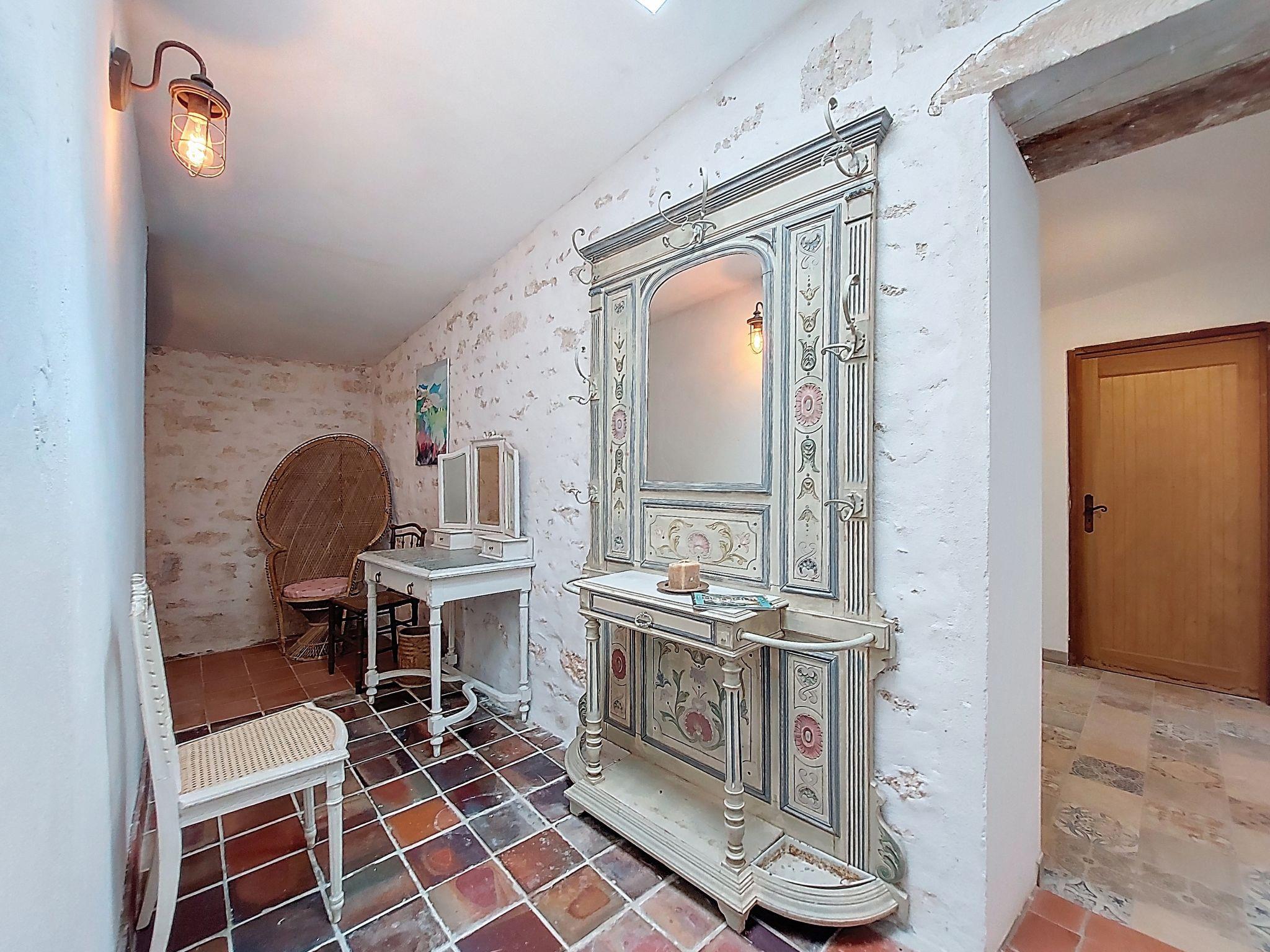 Sainte Gemme 24 km from Royan: Country house "Les Vidalières", from the 18th century, renovated. 3 km from the centre of Sainte Gemme, 25 km from the centre of Royan, 25 km from the centre of Saintes, in a quiet position, 25 km from the beach. Private: property 800 m2 (fenced), trees, roofed, parking (for 2 cars) at the house on the premises. Grocery 3 km, restaurant 3 km, bus stop "Mirambeau" 10 km, railway station "Saujon" 17 km, sandy beach "Royan" 25 km, park "Luna Park (Juillet-Août)" 33 km, outdoor swimming pool 14 km, indoor swimming pool 14 km, thermal baths "Etablissement thermal de Saujon" 13 km. Golf course (18 hole) 26 km, tennis 3 km, riding stable 26 km. Nearby attractions: La Ferme de Magné 8 km, Palais des Congrès - Royan 25 km, Embarcadère Royan - Le Verdon 25 km, Golf de Royan 30 km, Zoo de La Palmyre 33 km, Hippodrome - La Palmyre 34 km. Please note: car recommended. The house is in the middle of the countryside near a small farm.