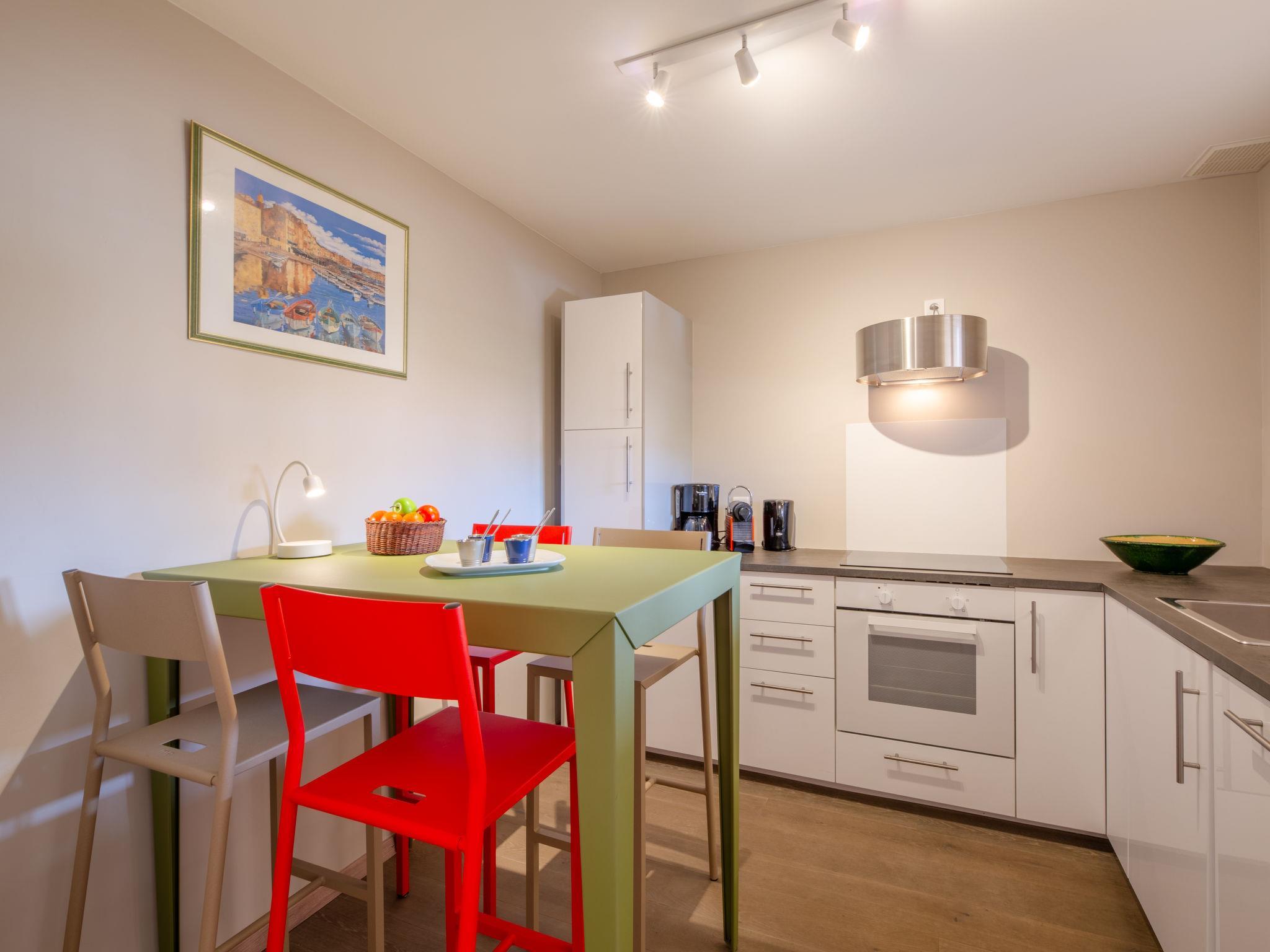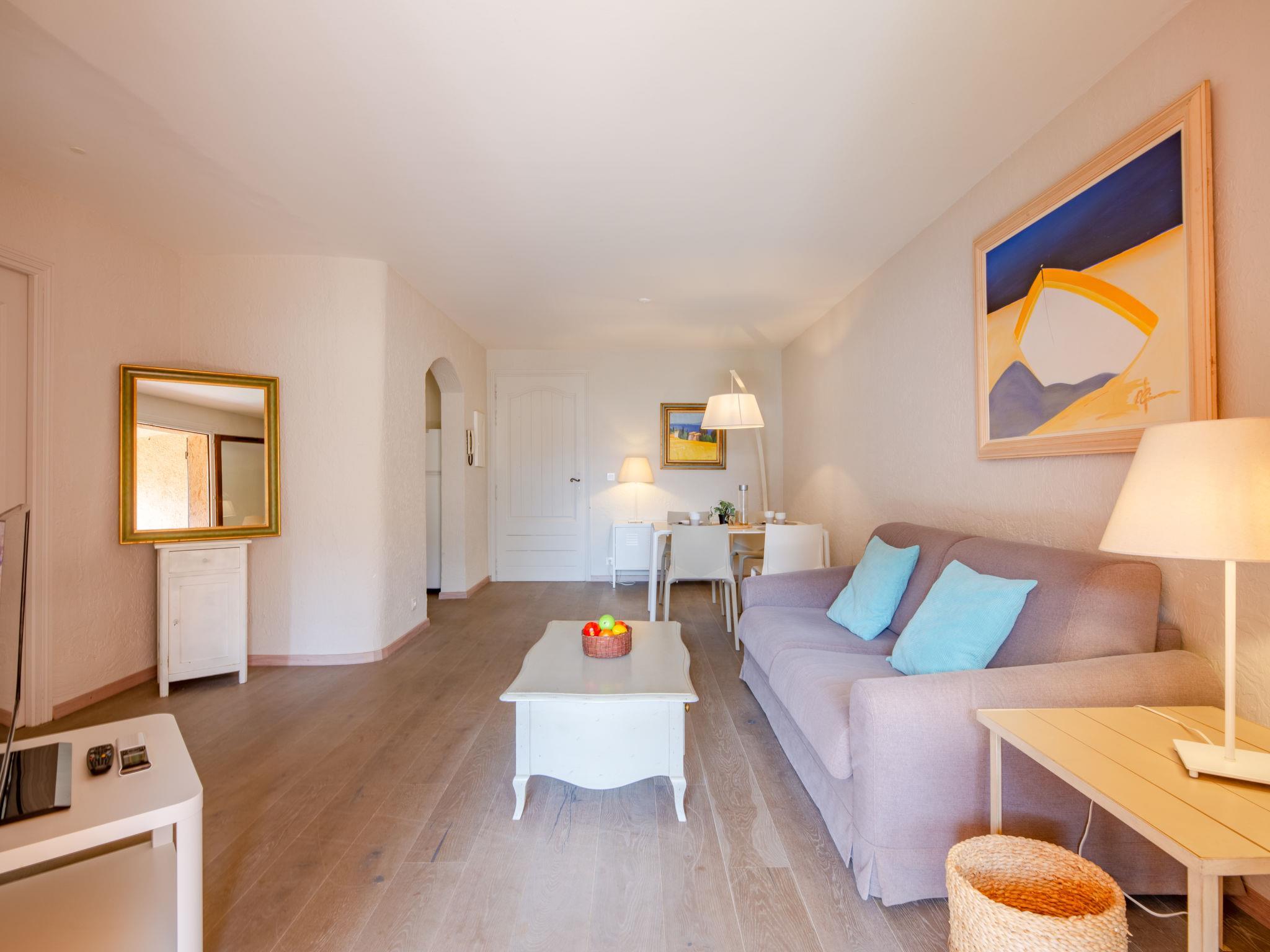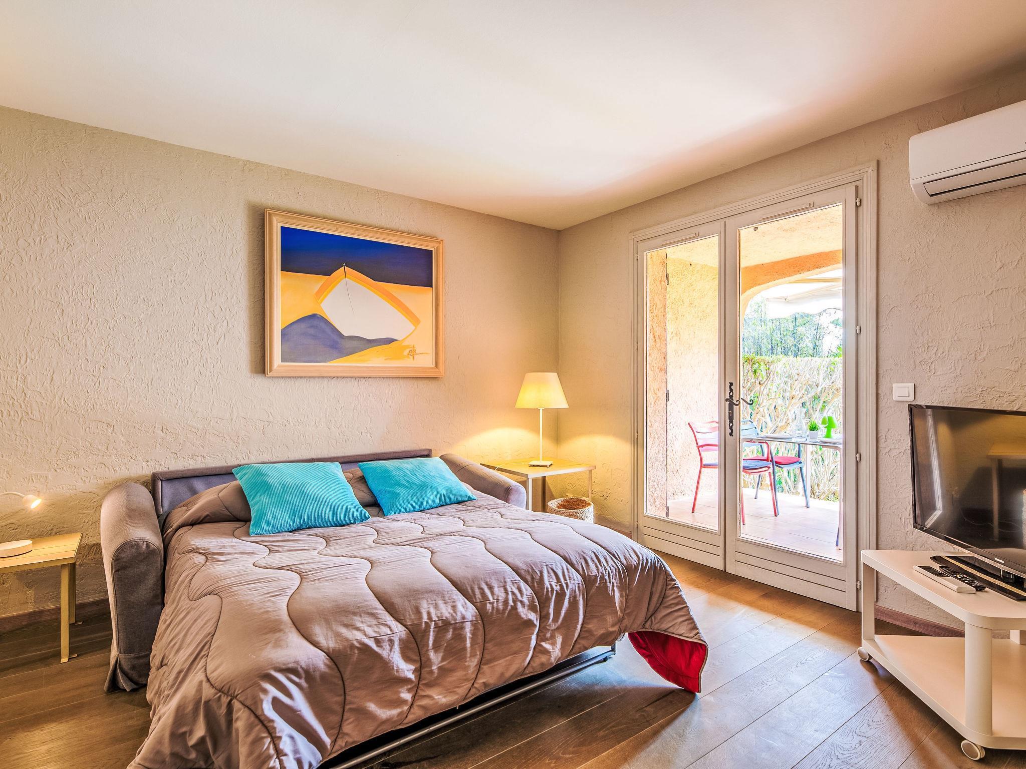 2-room apartment 50 m2 on 1st floor. Spacious, comfortable and modern furnishings: dining room with 1 double sofabed (140 cm, length 190 cm), TV. Exit to the terrace, to the patio. 1 room with 2 beds (80 cm, length 200 cm). Open kitchen (oven, dishwasher, 4 ceramic glass hob hotplates, toaster, kettle, freezer, electric coffee machine) with dining table. Shower/WC. Electric heating, air-conditioning. Terrace 7 m2, roofed, south facing position, patio 45 m2, south facing position. Terrace furniture. Facilities: iron, hair dryer. Internet (WiFi, extra). Parking space n 12. Please note: non-smokers only. Maximum 1 pet/ dog allowed. TV only FR. Smoke alarm, no lift. 83115003175DZ