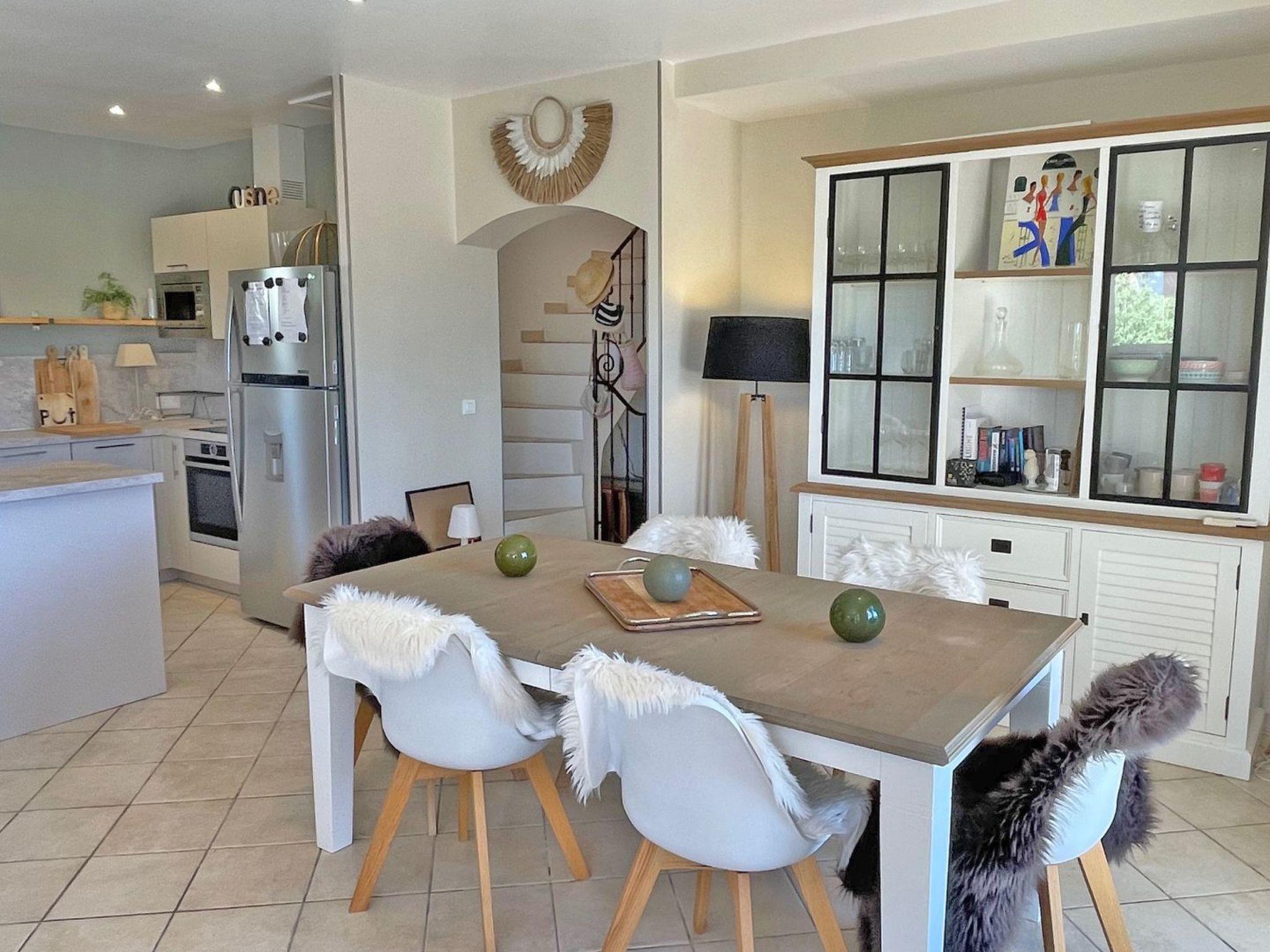 - Beautiful air-conditioned living room with access to the outside, divided into 3 areas: lounge with 2 sofas that can accommodate all the guests, large TV screen, dining area for 8 people and the very well equipped open-plan kitchen (fridge, freezer, hob, extractor fan, dishwasher, oven, microwave, various crockery)