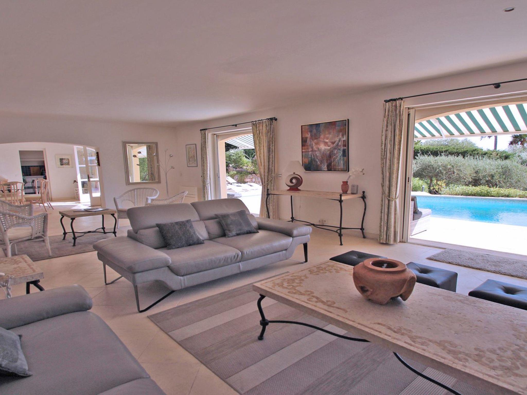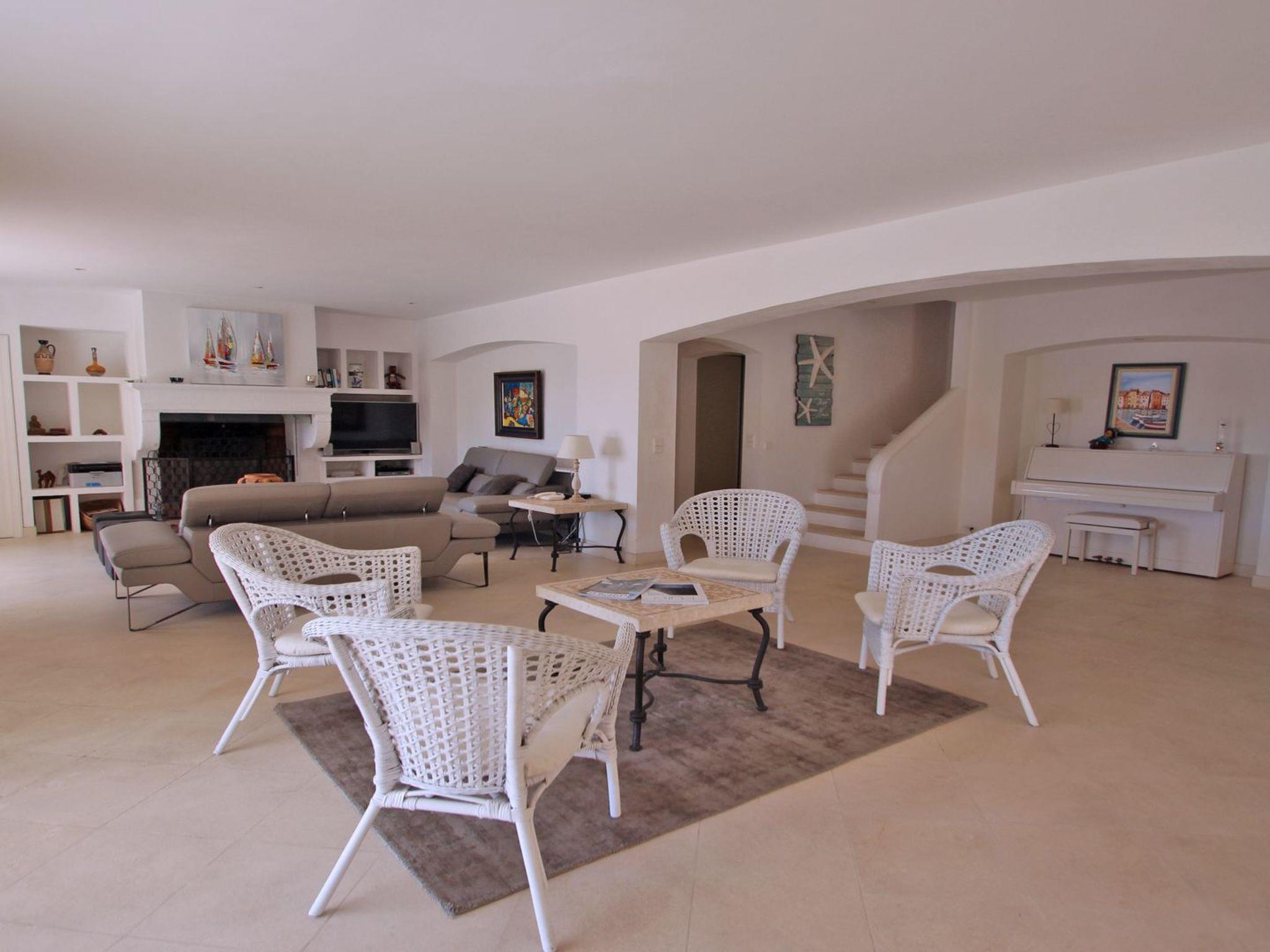 - Large living room with fireplace, opening onto the pool and terraces, 2 sofas, large screen TV + DVD player