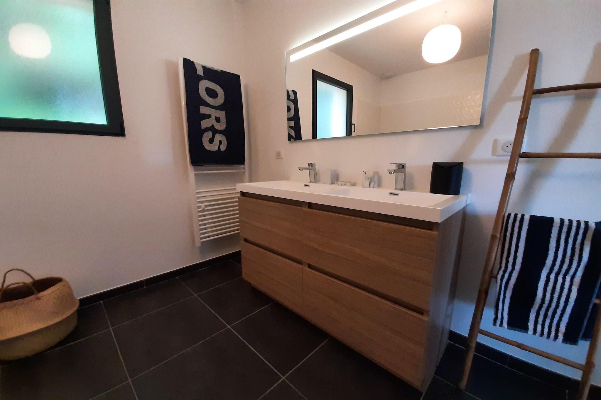 Gemt væk i den fredfyldte landsby Sainte Valière, tilbyder denne stilfulde villa et luksuriøst tilflugtssted for familier og venner. Med en privat swimmingpool, frodig have og interiør med aircondition er det designet til komfort på varme sommerdage. Det veludstyrede køkken og grillplads inviterer til kulinarisk kreativitet, mens den elegante indretning tilføjer et strejf af sofistikering til dit ophold. Beliggende kun 35 km fra havet, er villaen perfekt placeret til dagsture til strandene i Gruissan eller den pulserende kystby Narbonne. Du er også inden for rækkevidde af Perpignan, nær den spanske grænse, for en kulturel omvej. Essentials såsom et bageri og café ligger 11 km derfra, og den nærmeste lufthavn ligger kun 48 km fra ejendommen. For nærliggende natur og fritid, slentre gennem (den offentlige have), udforsk den botaniske charme ved Le Jardin Champêtre, eller nyd familietid på Jardin Pour Enfants. Uanset om du slapper af ved poolen eller opdager skønheden i Languedoc-Roussillon, lover denne villa en uforglemmelig ferie.