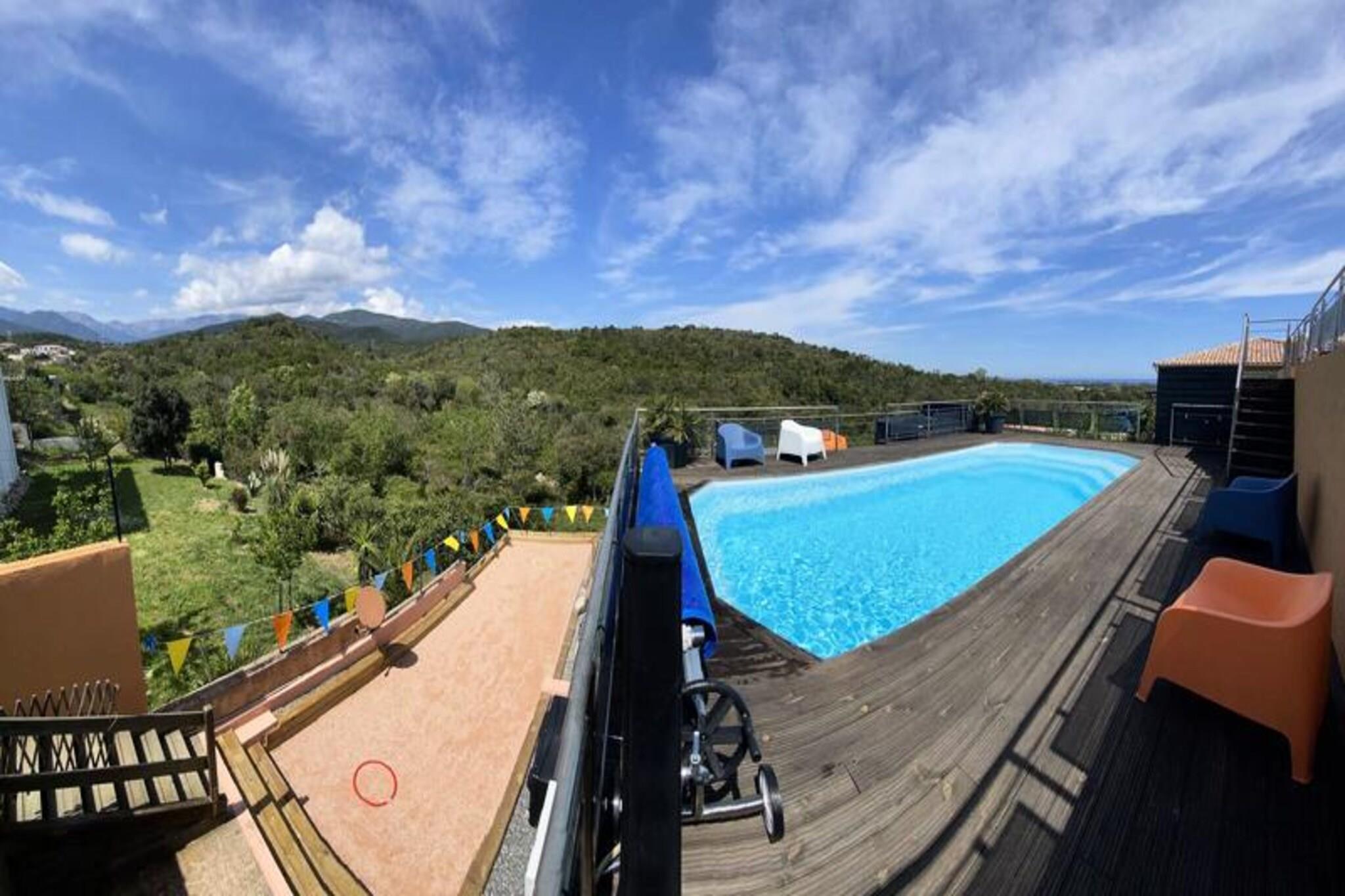 Boost din ferie på Korsika med denne smukke moderne og ultramoderne villa med alle tjenester i Solenzara-sektoren på det sydlige Korsika Beliggende 3 km fra havet og på højderne af et lille privat boligområde i byen Travo, vil denne smukke bolig forføre dig med sin ideelle beliggenhed, sin ro, sin udsigt lige så betagende som den er afslappende, men også med alle tjenester på udbudte steder, såsom 10x3 opvarmet swimmingpool, jacuzzi, poolhus, grill, pizzaovn, petanquebane, plancha, fitnesscenter, men også biografsal, kæmpeskærme, ... Huset er opbygget i to plan med et samlet areal på 200m2 og kan rumme op til 10 personer. På første niveau, en stor åben katedral stue på 80m2 med køkken og karnapper, en terrasse på 80m2 og en anden terrasse på 20m2 et fuldt udstyret køkken 3 soveværelser med dobbeltsenge, et med separat brusebad og toilet 1 dobbeltværelse med mandshøj mezzanin med 2 enkeltsenge et ekstra badeværelse med toilet Under det nederste niveau, fitnesscenter, biografrum og vaskerum Mulighed for at leje udover og ved siden af ??huset og på nederste etage, en fuldt udstyret 4-sengs lejlighed på 40m2 med endnu et køkken, et soveværelse med dobbeltseng med påklædningsværelse, stue med sovesofa, et badeværelse og toilet og en terrasse med maquis udsigt Ideel til et ophold med venner eller familie, men også for atleter, vandrere, cyklister turistskatter og depositum på stedet med kreditkortaftryk Tjenester inkluderet: Slutrengøring Tilgængelige tjenester: Håndklæde linned per person: 8 Sengetøj per person: 8 Dobbeltseng sæt: 16 Opvarmning - 1